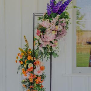 Arcadă semi-ovală, asimetrică, decorată cu ruscus și gypsophila
