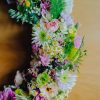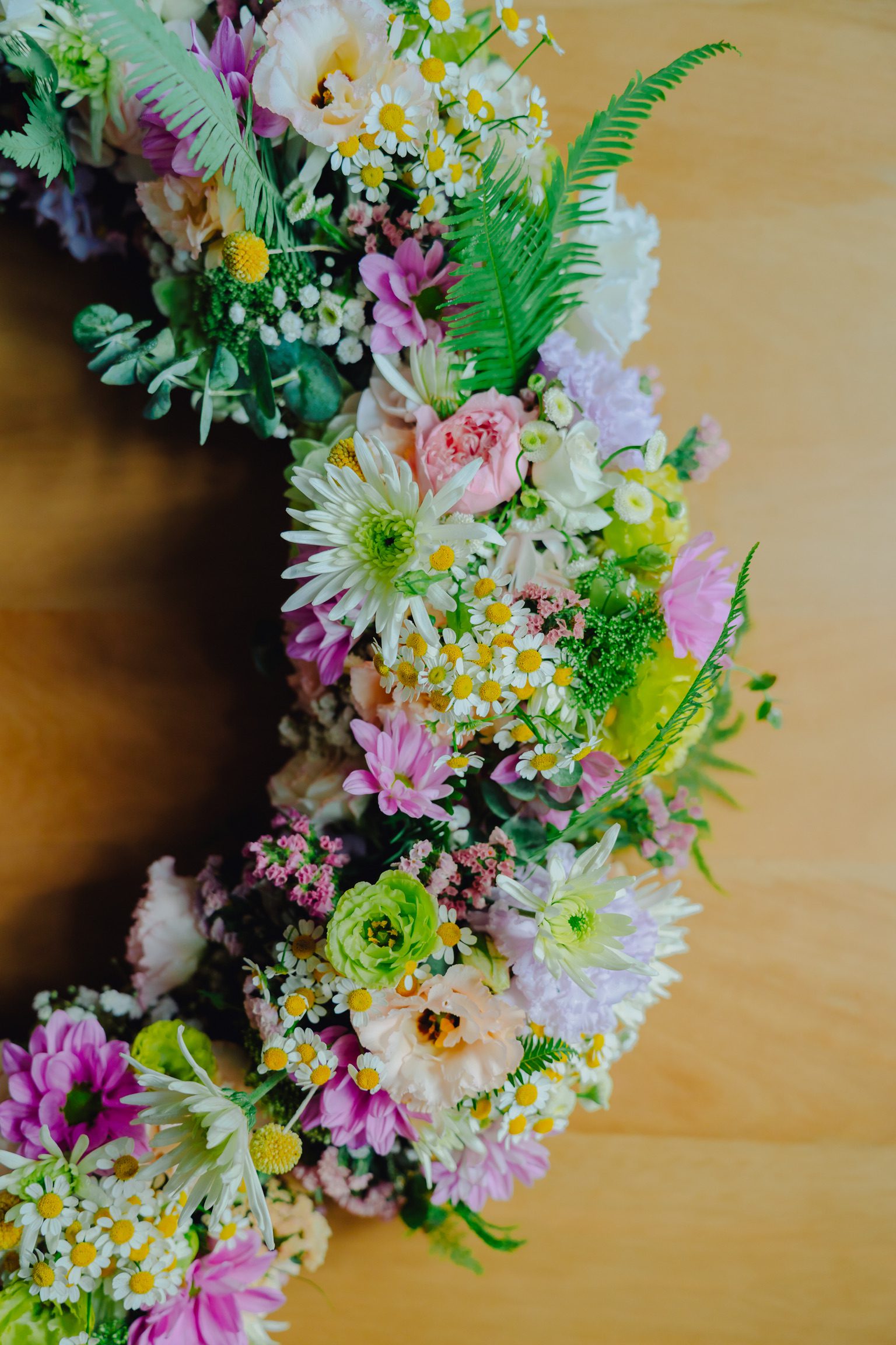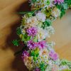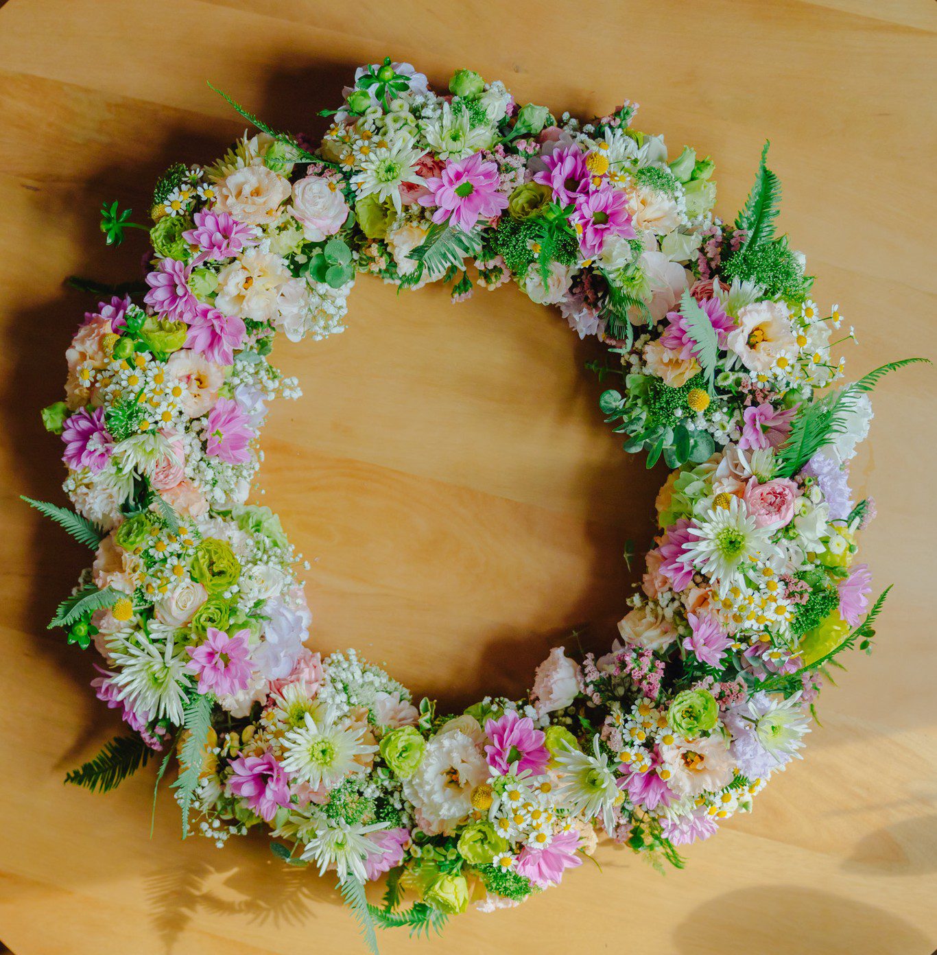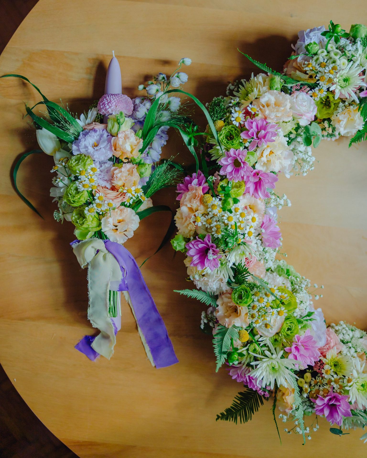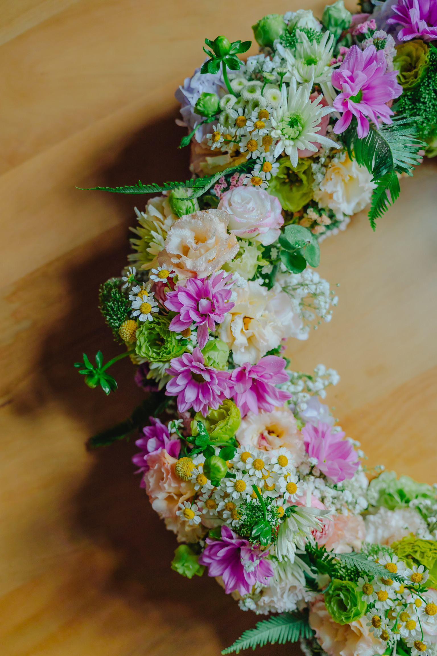 Ghirlanda circulară se atașează pe marginea cristelniței, este structurată pe o bază din burete floral hidratat, astfel că prospețimea florilor va persista și a doua zi după eveniment. Poate fi cu ușurință preluată de către părinți și refolosită ca element decorativ la momentul îmbăierii de acasă a bebelușului. Volumul aranjamentului floral poate fi ajustat în funcție de bugetul ce se dorește a fi alocat.