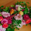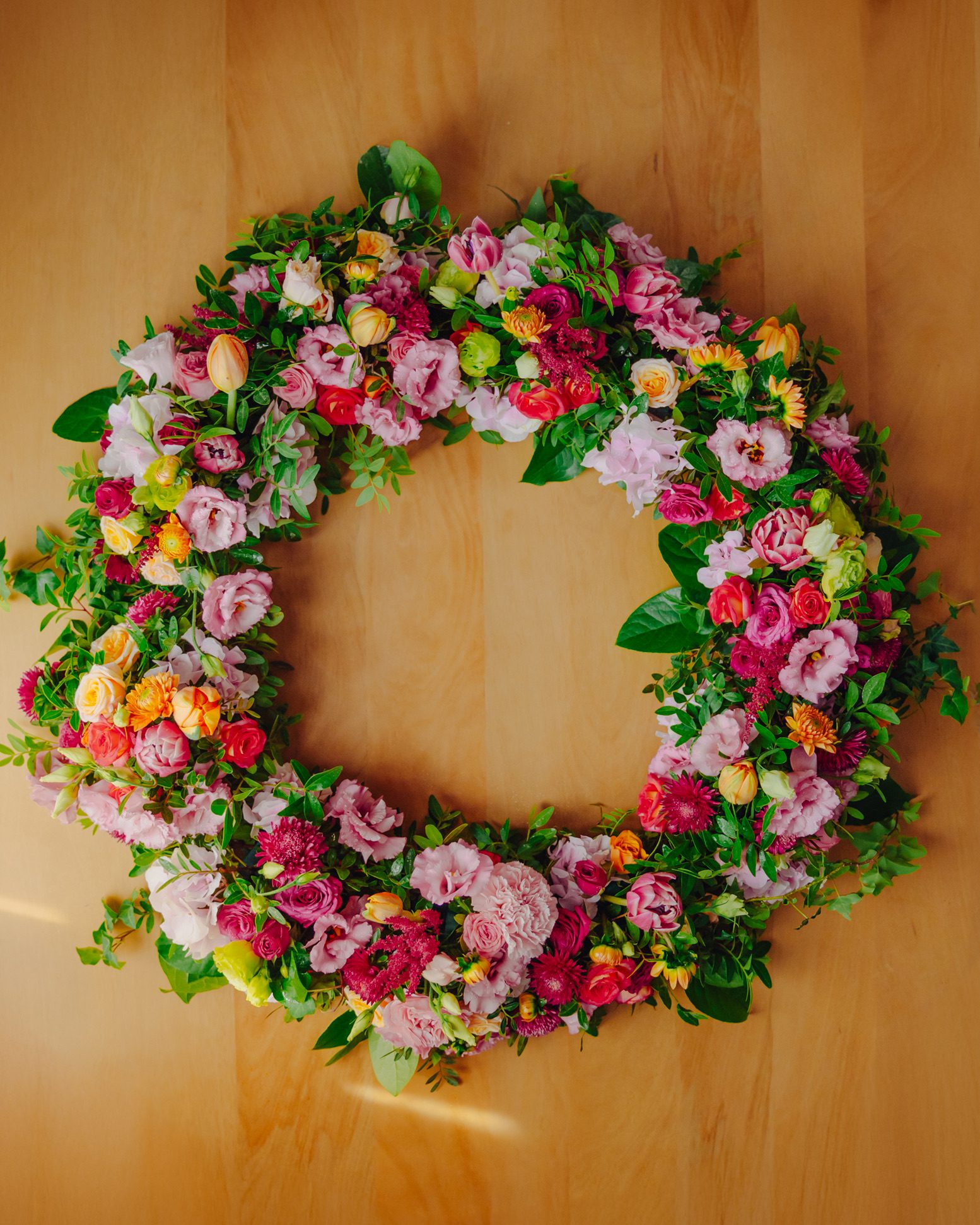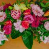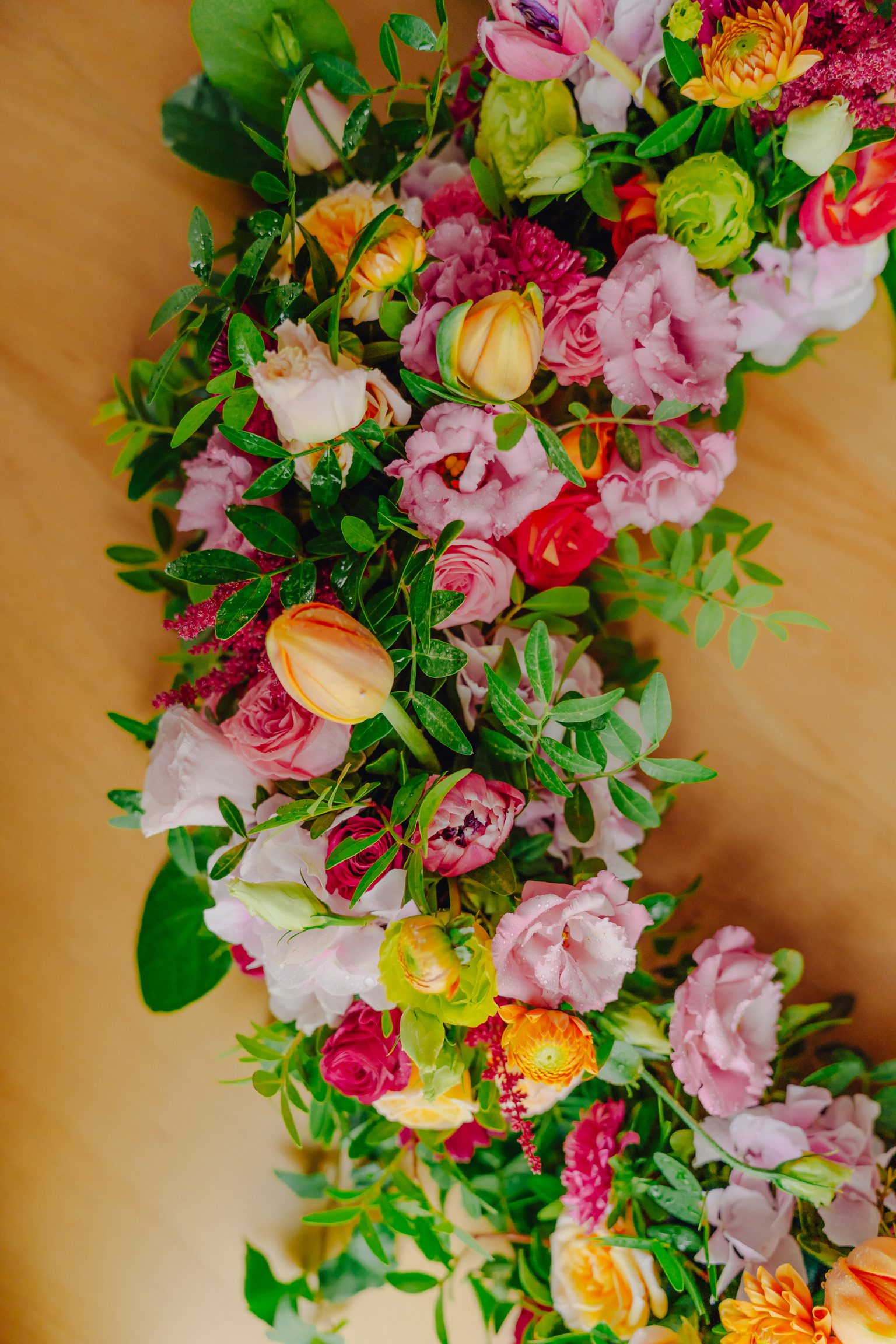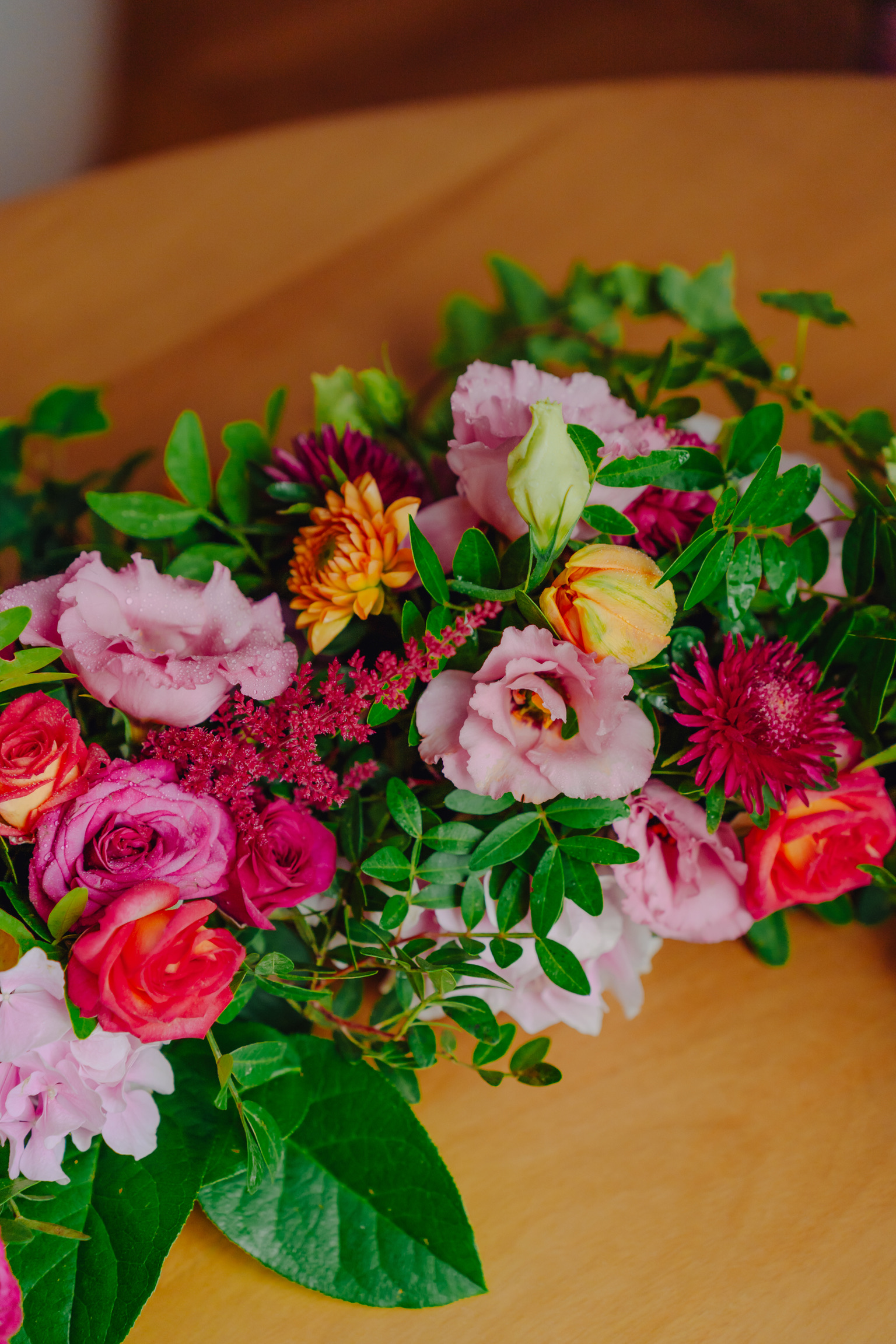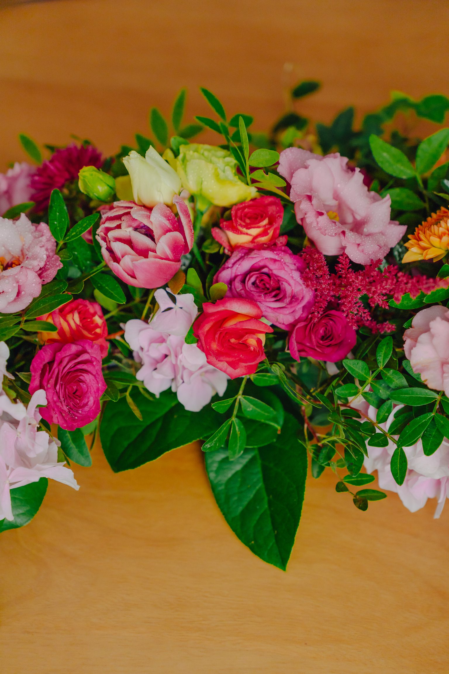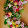 Aranjamentul din imagini a fost alcătuit din următoarele sortimente de flori: trandafiri, lisianthus, mini rose, trandafiri, lalele, salal, eucalipt etc.