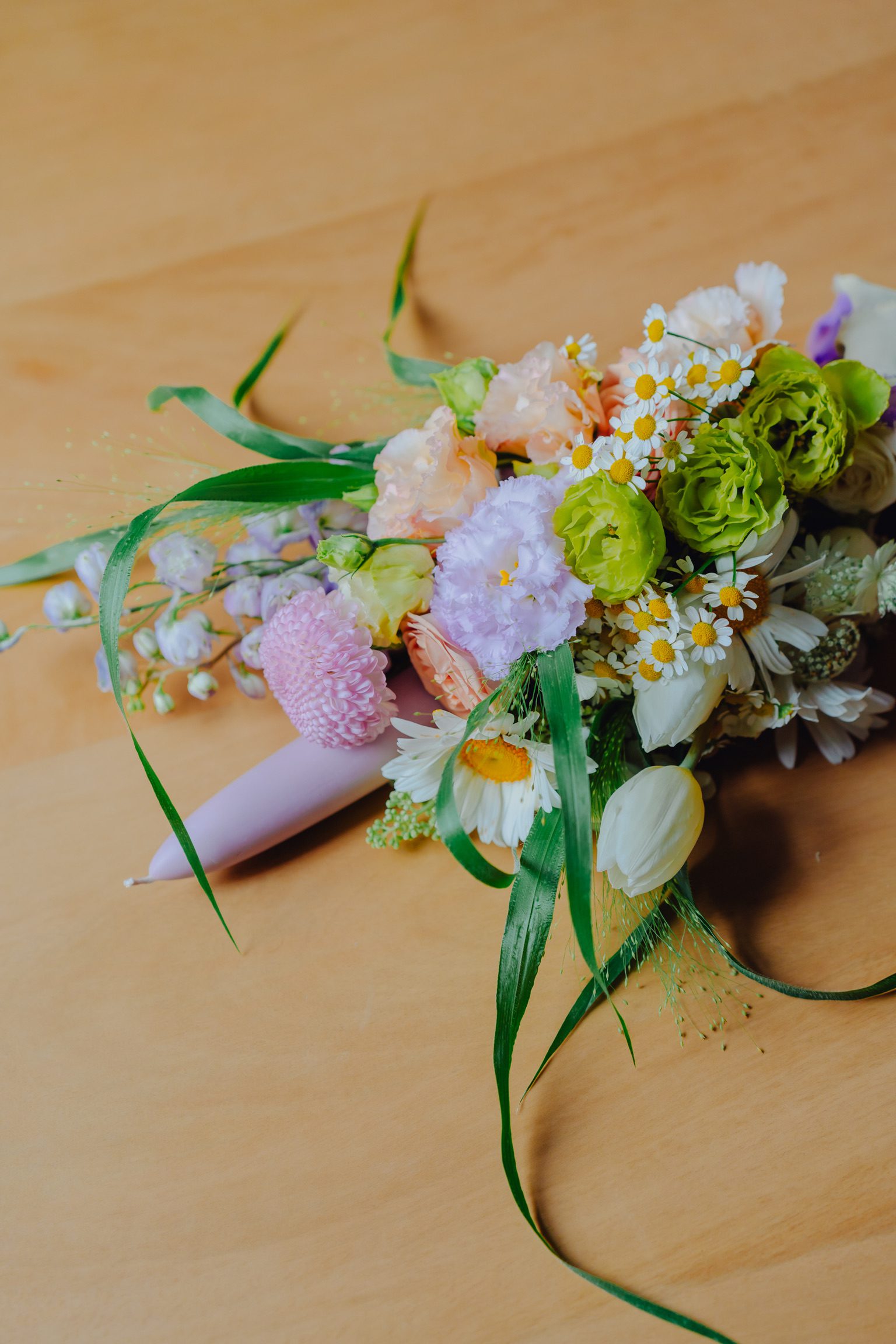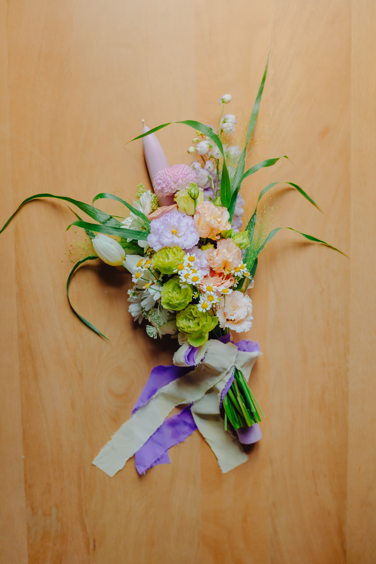 Lumânare de botez, cu lisianthus, lalele și mușețel