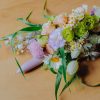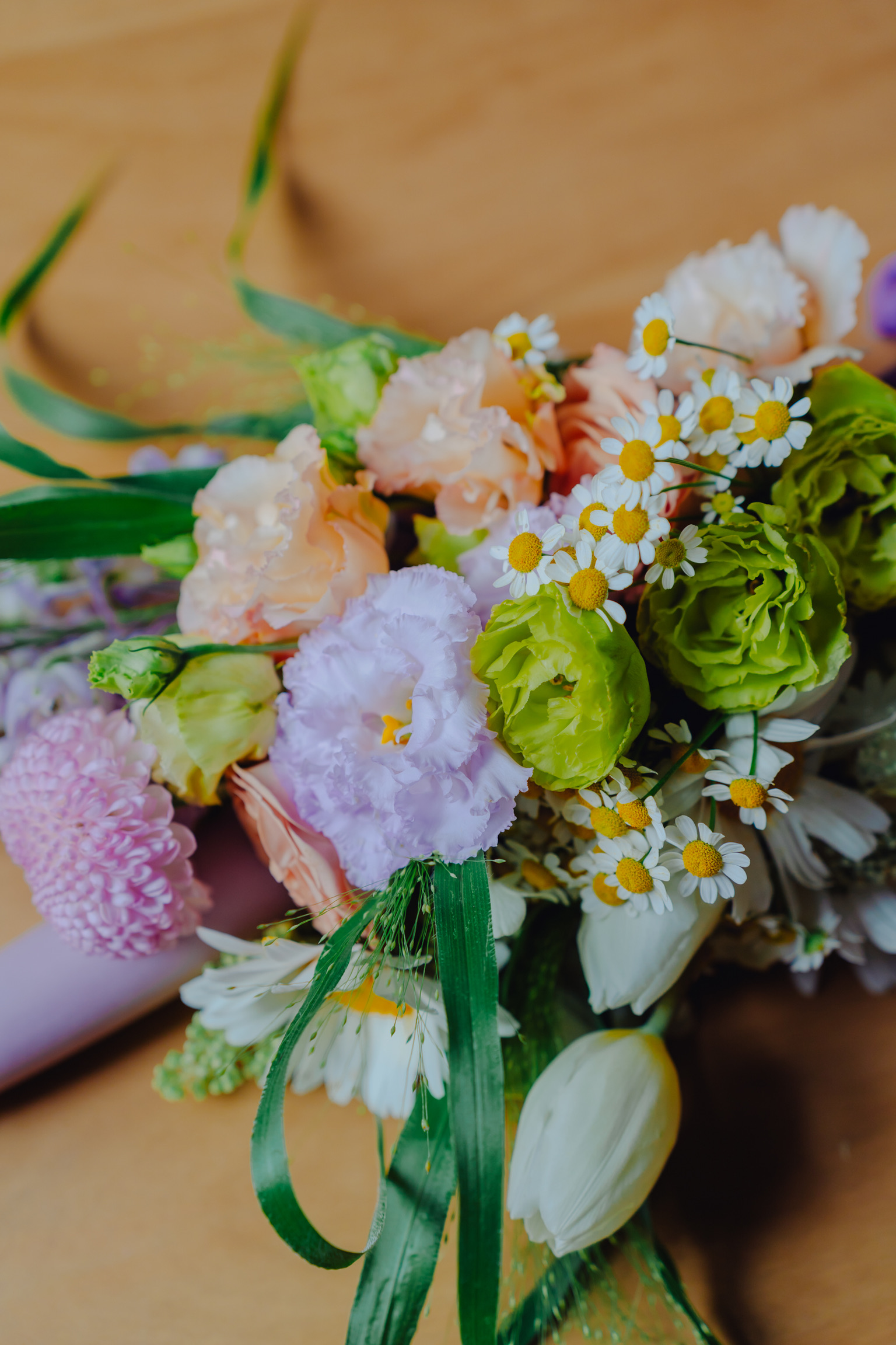 Componența florală: lisianthus verde și lila, margarete, mușețel, lalele, panicum, crizantemă Momoco, mini rose.