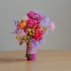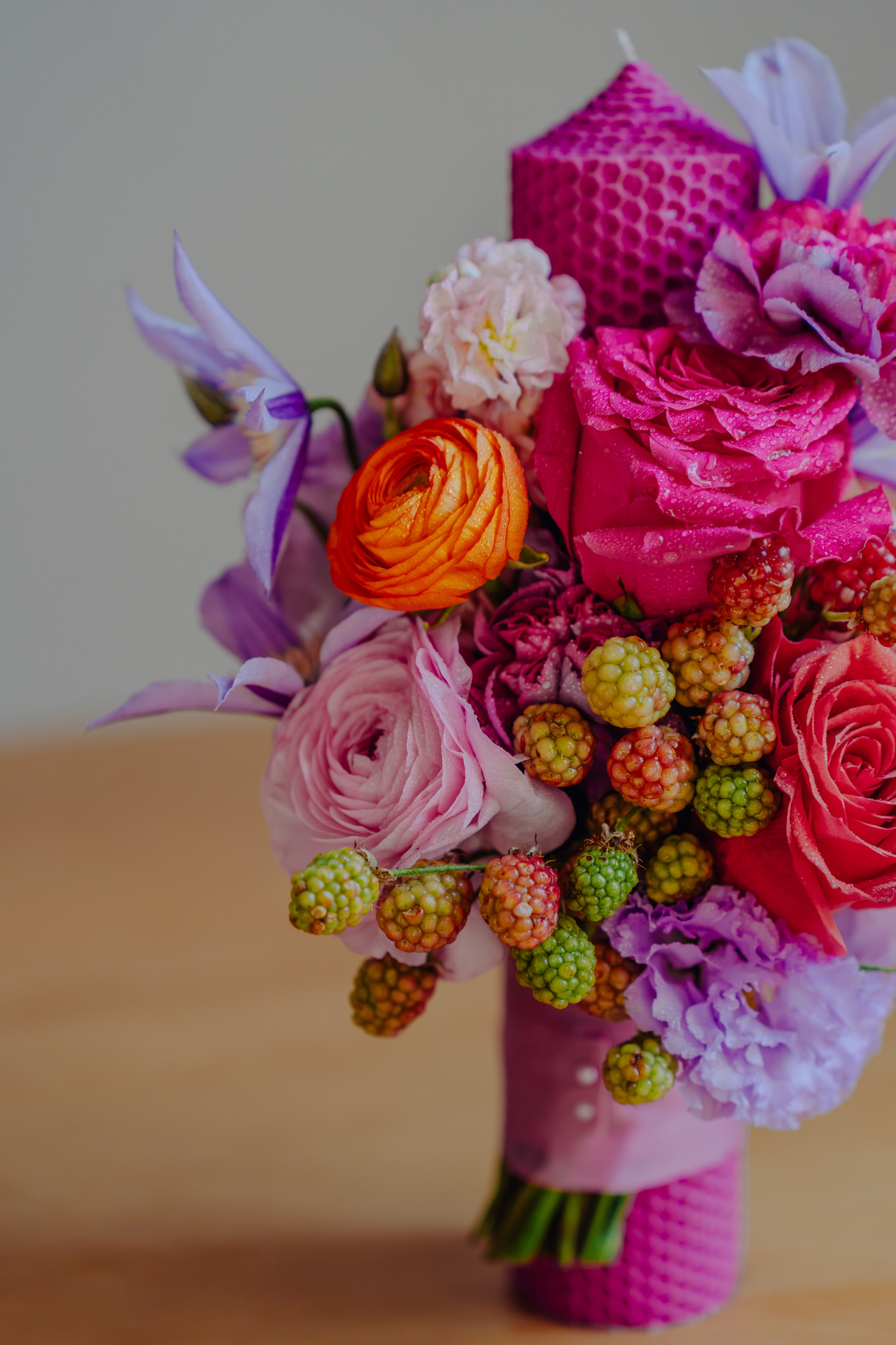 Lumânare de botez decorată cu lisianthus, ranunculus, mini rose, clematis, în nuanțe de roz pal, lila, portocaliu. Este potrivită pentru creștinarea fetițelor. Lumânarea are înălțimea de 35 cm, este confecționată din ceară naturală de albine, aspect de fagure, culoare fucsia, iar la bază am adăugat panglică din voal asortată.