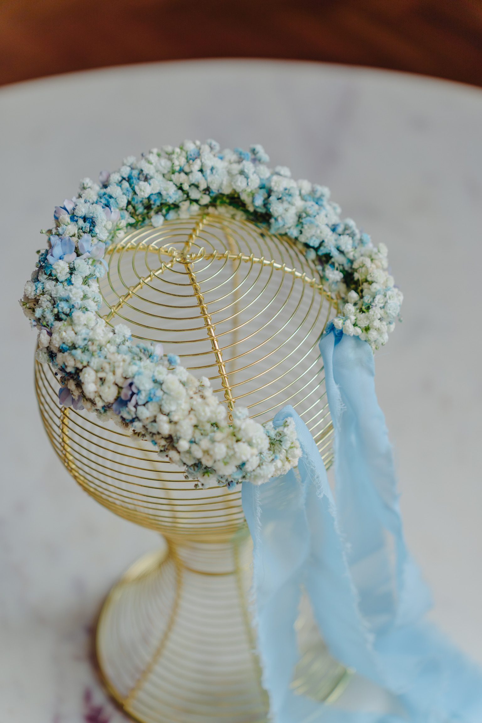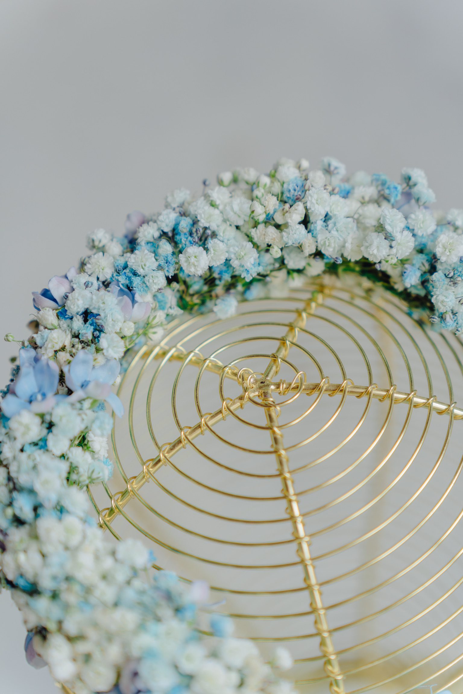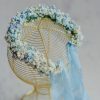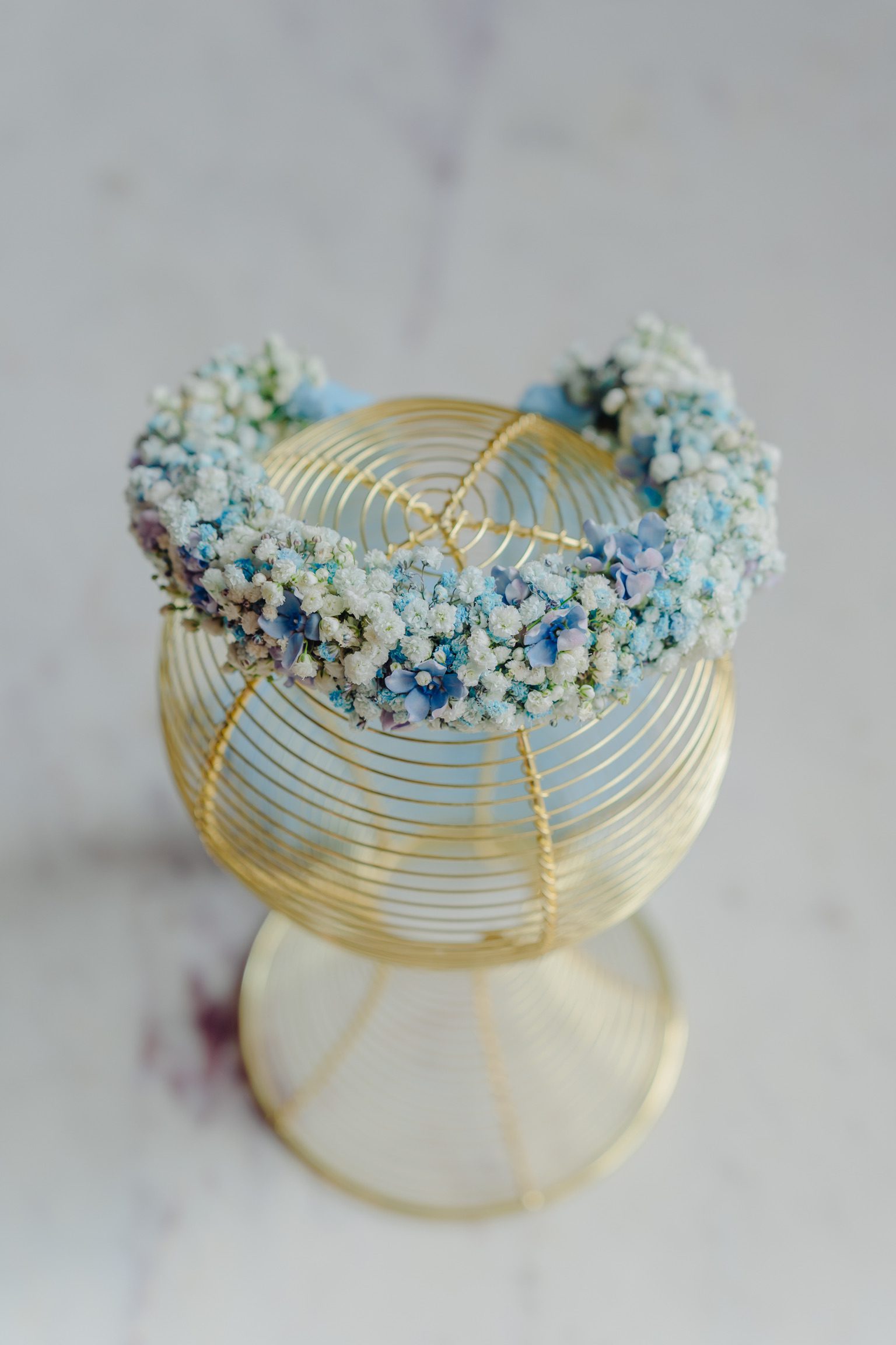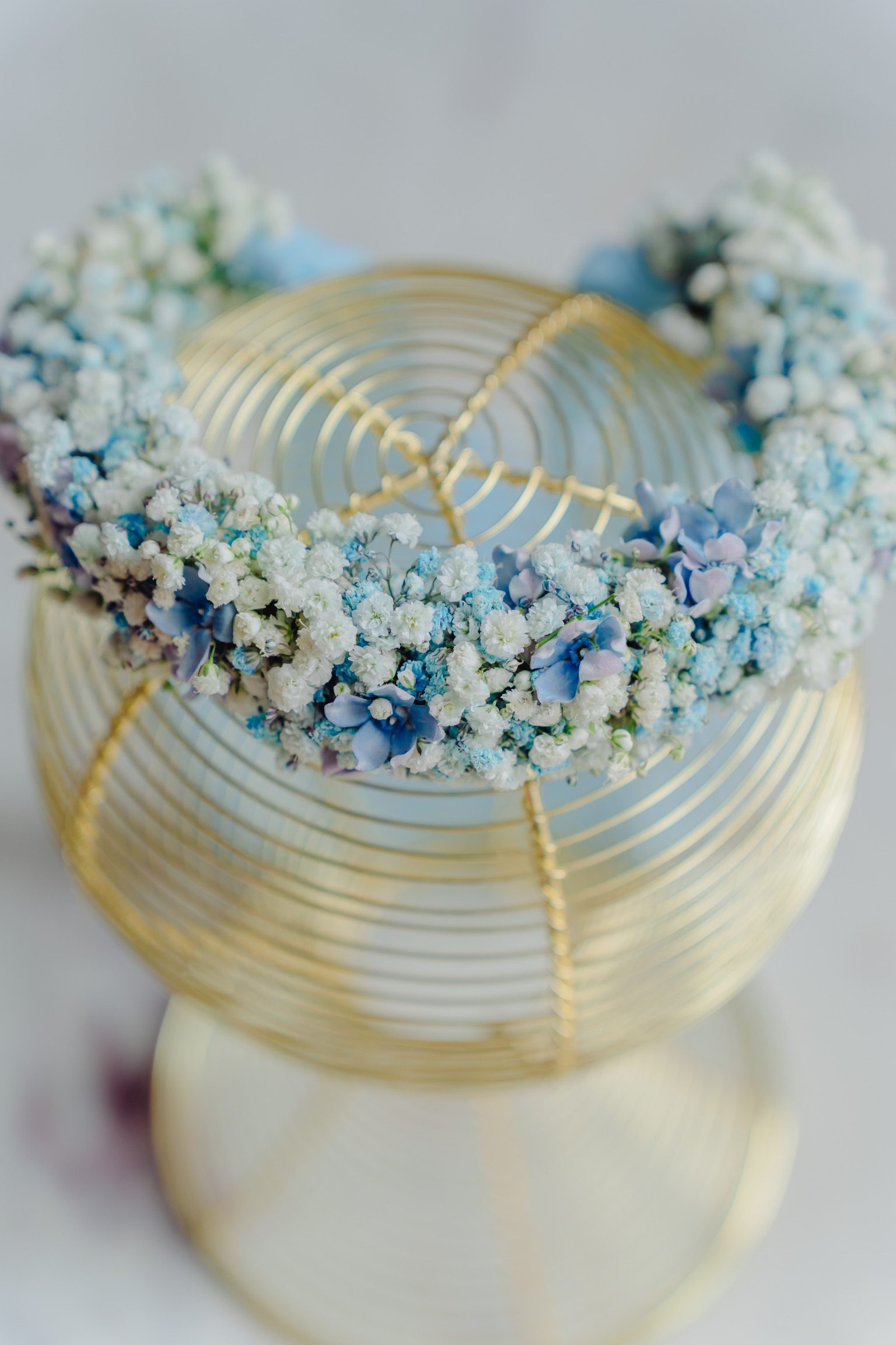 Coroniță din gypsophila, în nuanțe de alb și bleu