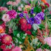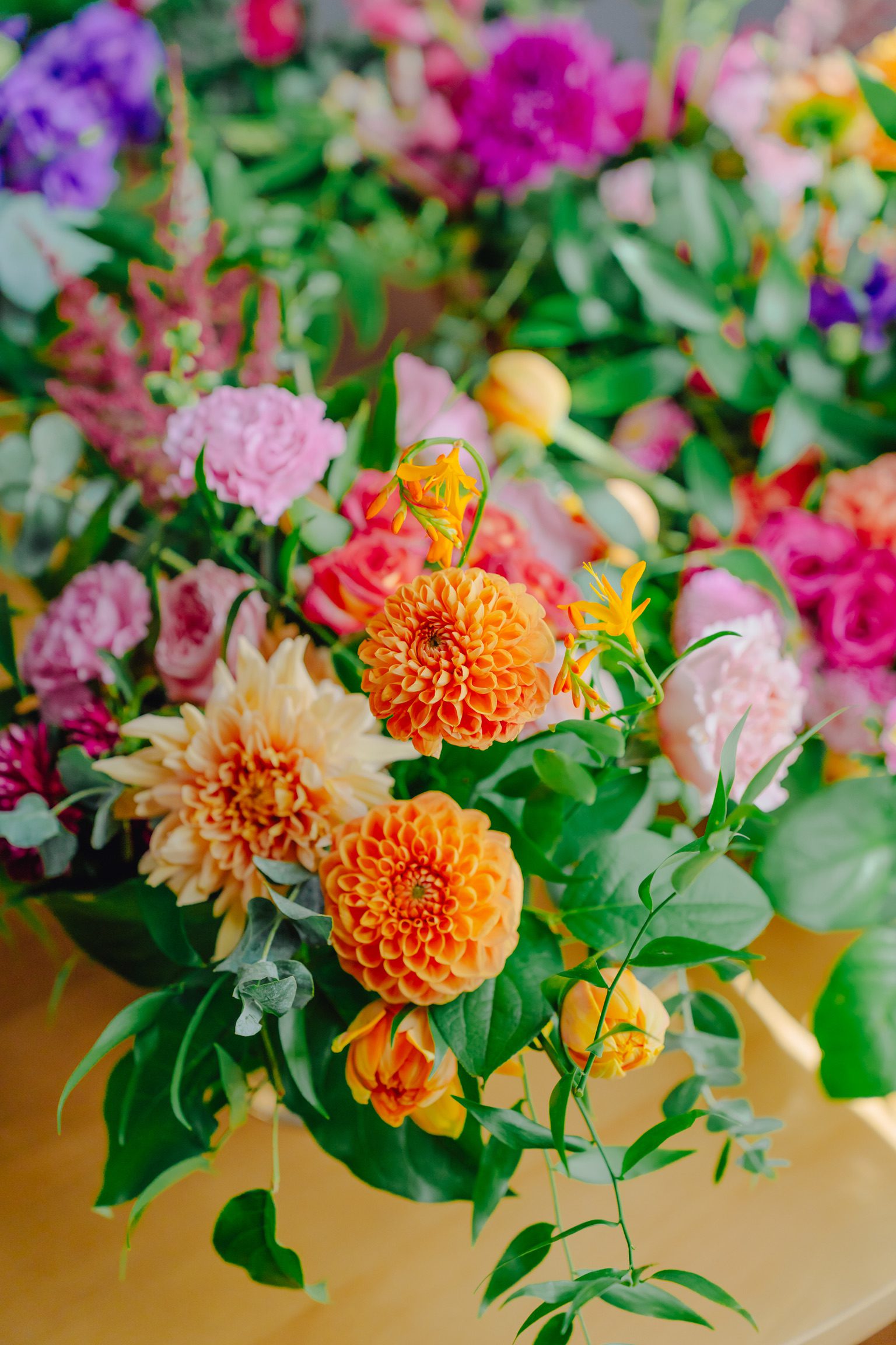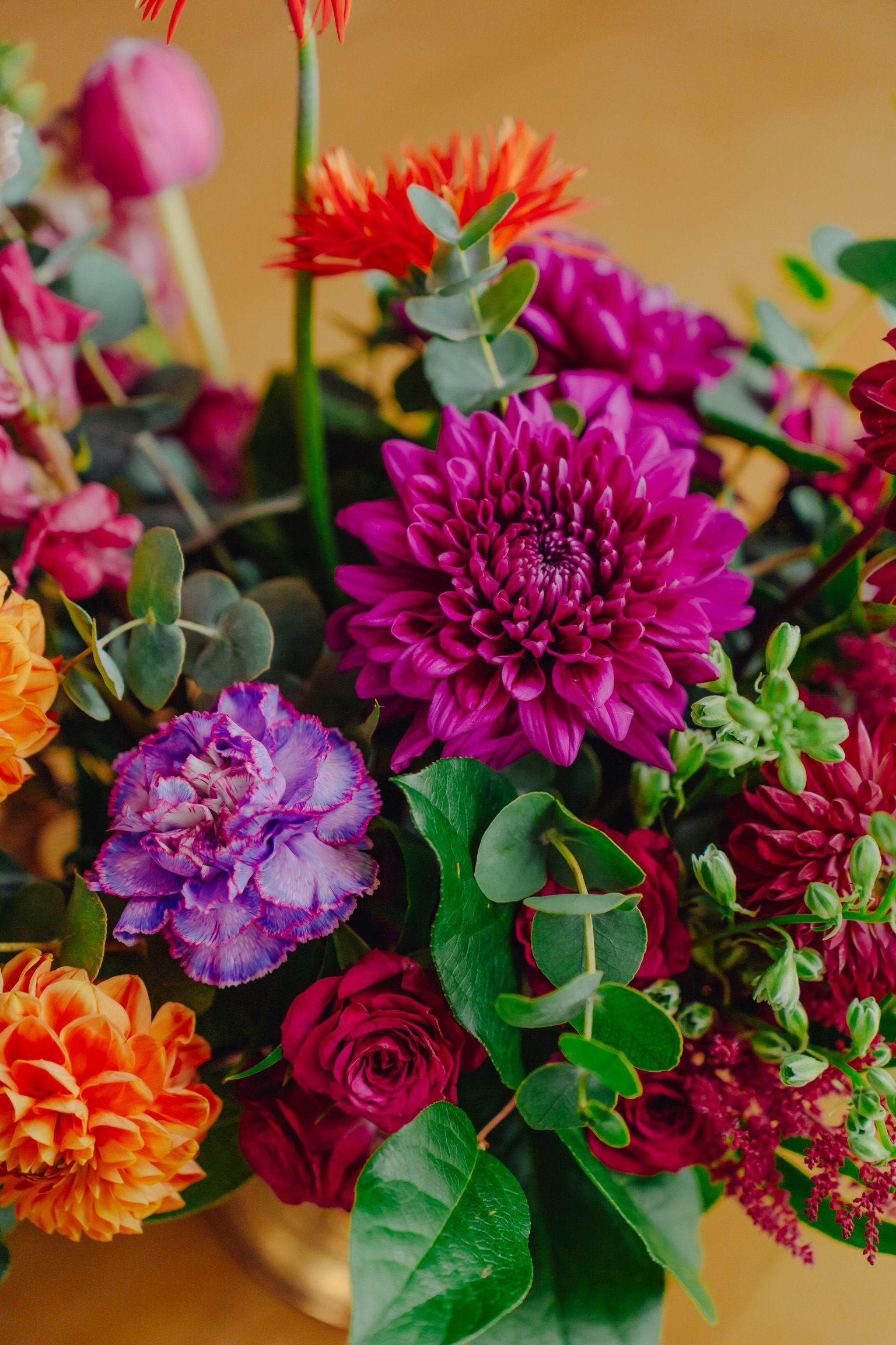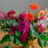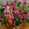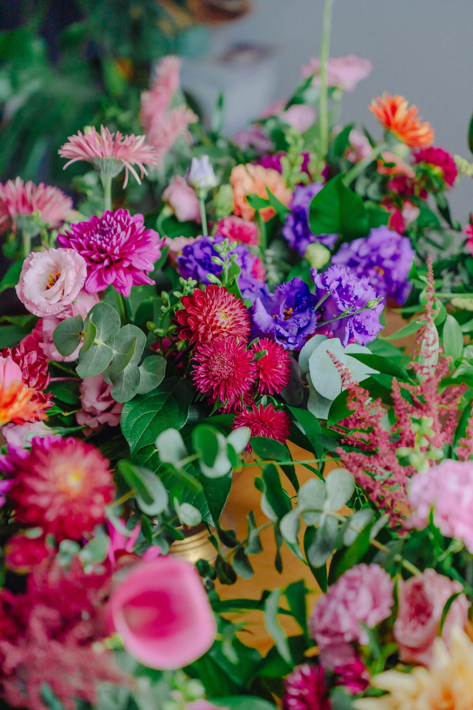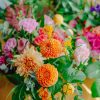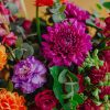 Componență florală: dalii, trandafiri, lisianthus, gerbera, eucalipt, salal, crocos, garoafe, mini rose, astilbe etc.
