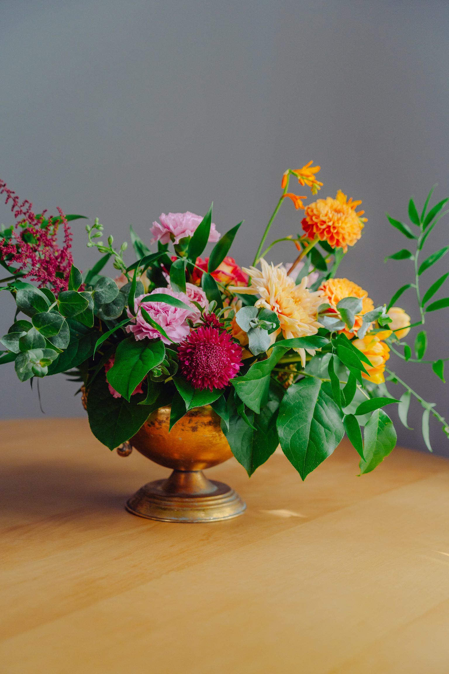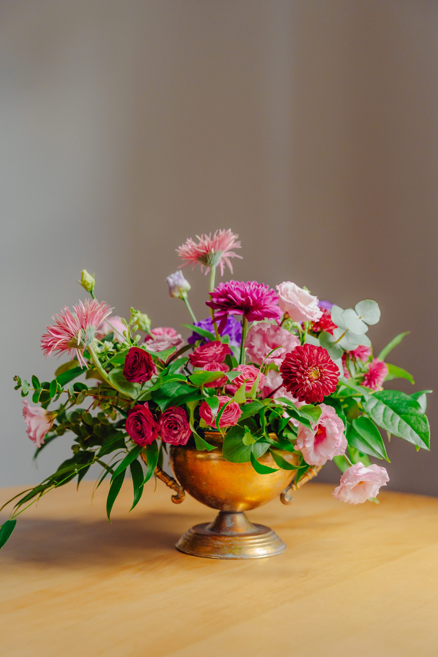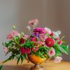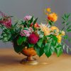 Aranjament floral de masă, dispus în pocal auriu