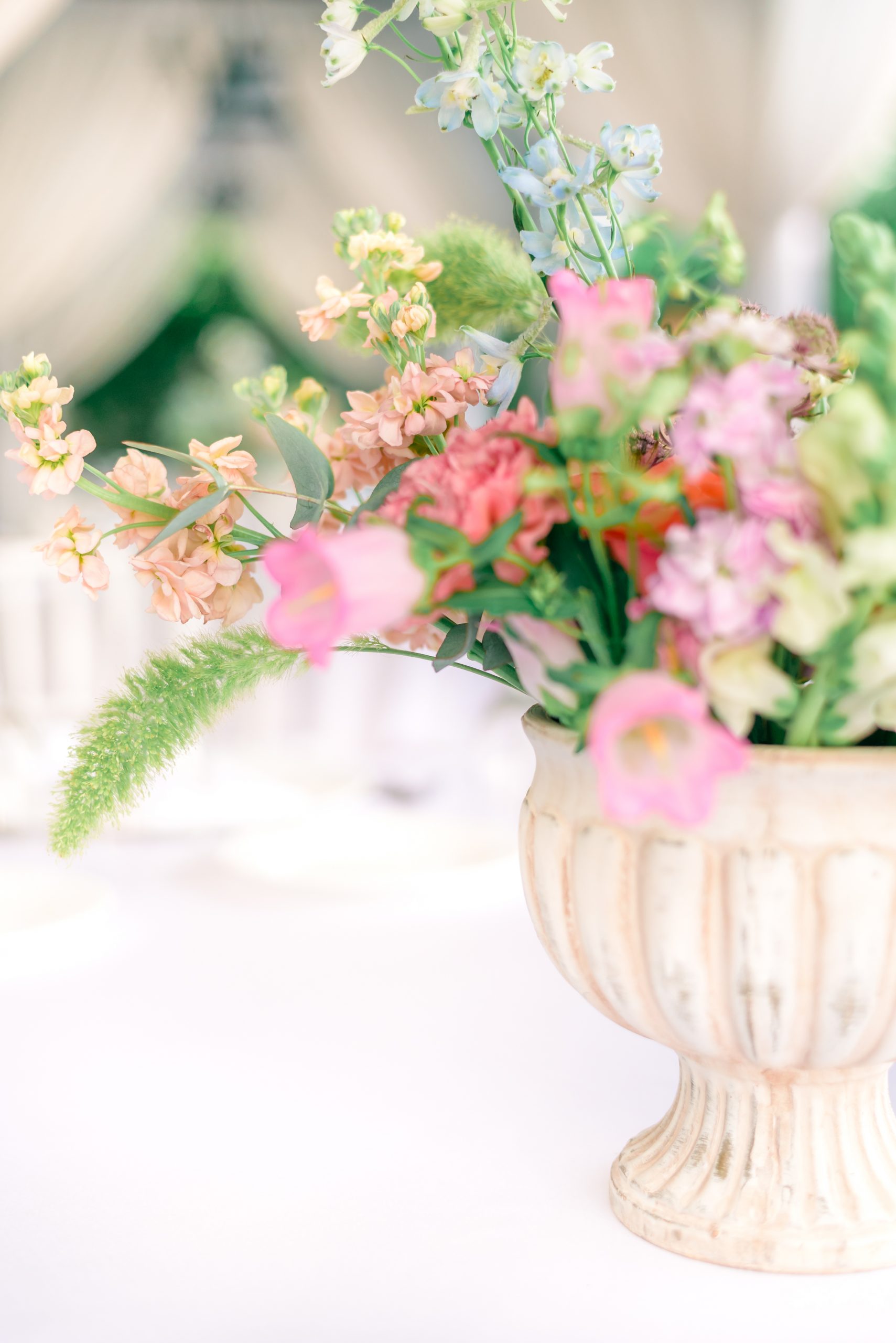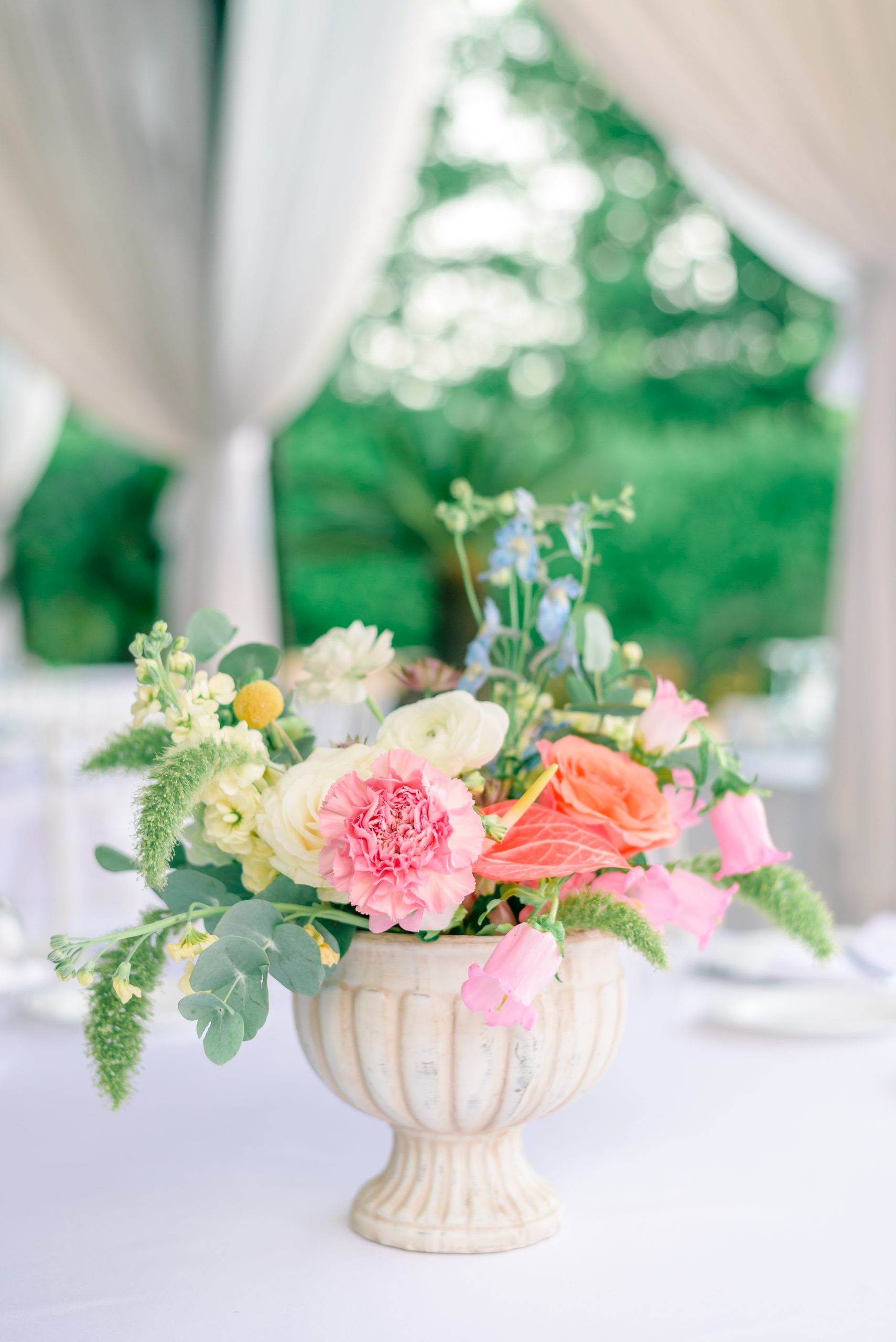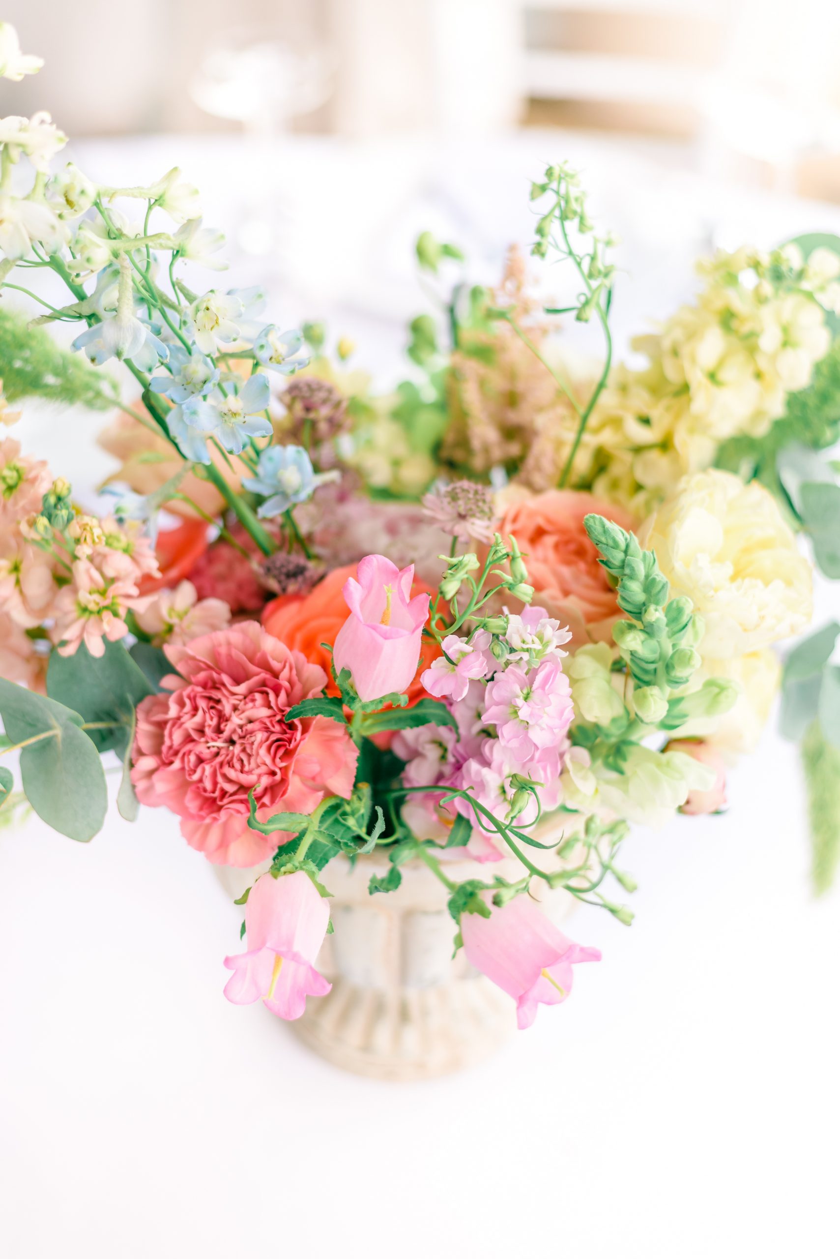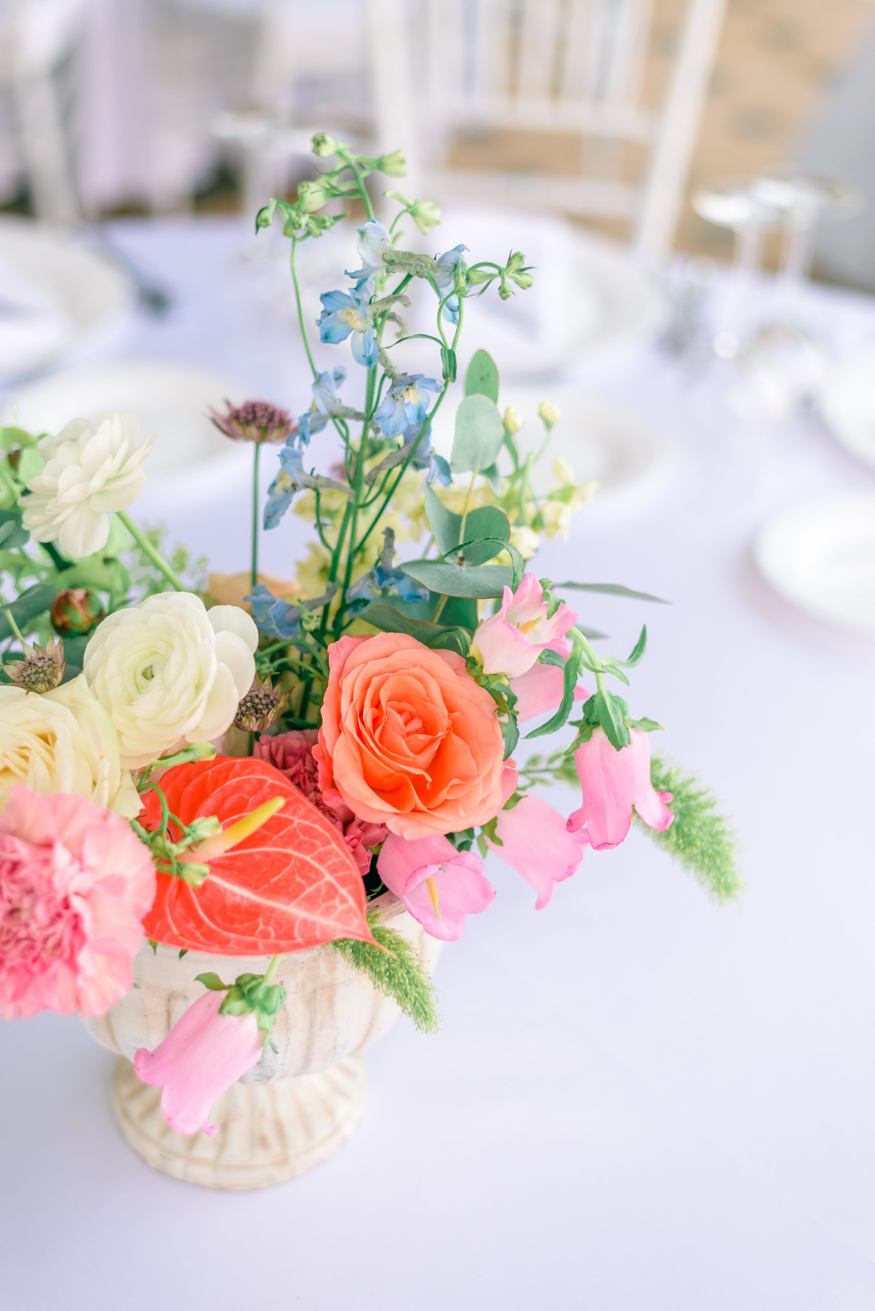 Aranjamentul floral poate reprezenta un punct de pornire în crearea design-ului de la evenimentele importante din viața ta: nuntă, botez sau aniversare. Poate fi oferit cadou unei persoane dragi sau te poți bucura de energia lui în intimitatea casei tale. S-au folosit următoarele sortimente de flori: trandafiri, campanula, anthurium, garoafe, delphinium, craspedia, ranunculus, alchemilla, mathiola, astrantia, celosia și mai multe tipuri de eucalipt.