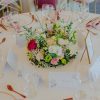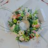 Modelul alăturat reprezintă o coroniță florală, în nuanțe pastelate, ce are un diametru de 35-40 cm, iar în interiorul ei am poziționat un cilindru din sticlă cu lumânări plutitoare, pentru un efect romantic.
