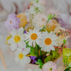 Decor floral de masă potrivit pentru nuntă sau botez, realizat într-o cromatica pastelată, cu touch-uri fine de galben și fucsia.