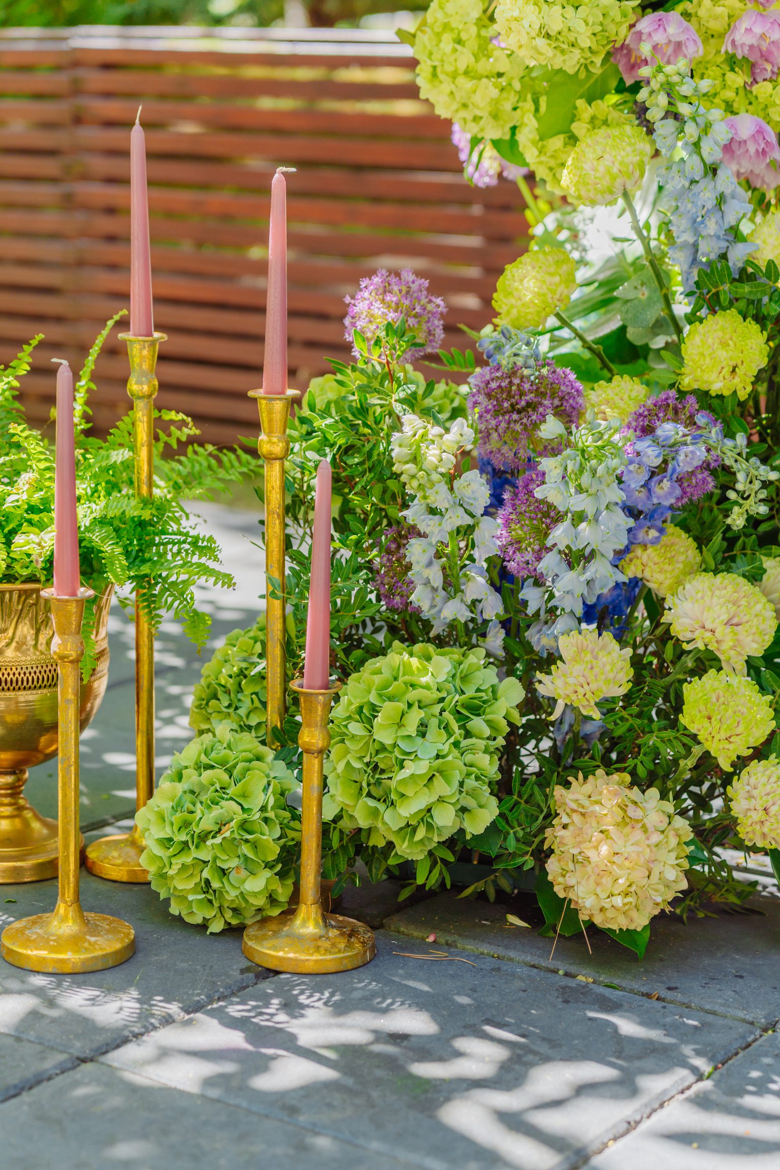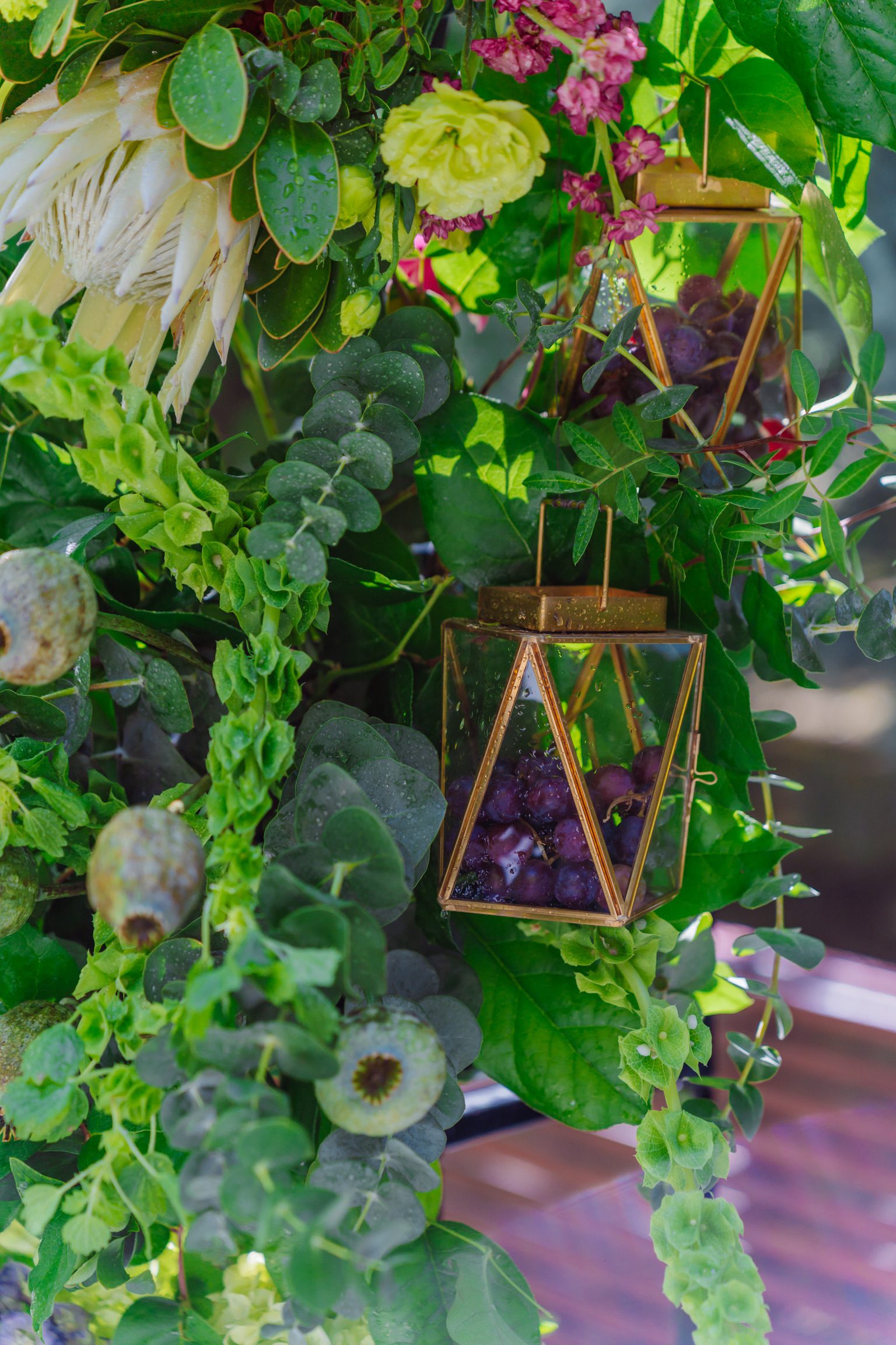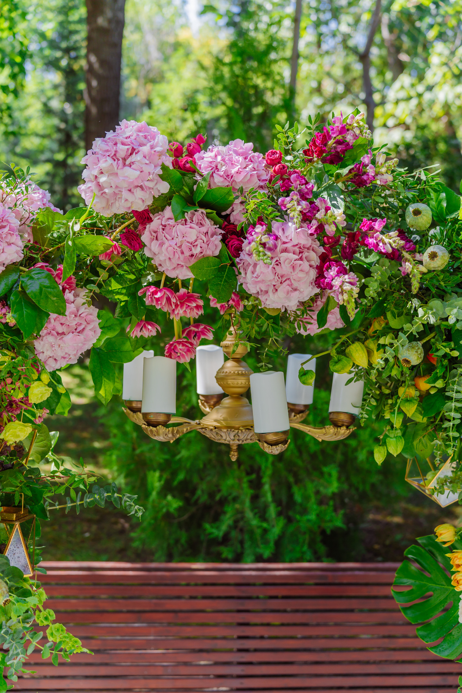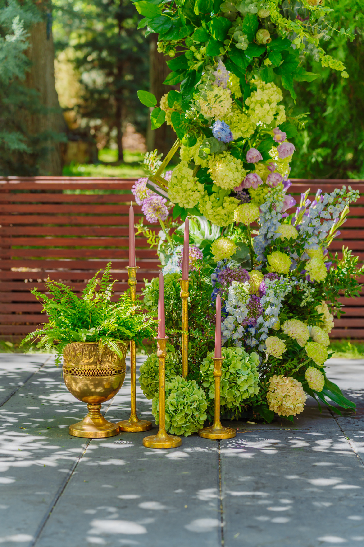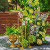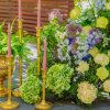 Sunt incluse în buget accesoriile decorative: felinare din metal, terarii cu fructe, sfeșnice individuale aurii, candelabru auriu dispus pe arcadă, pocaluri aurii cu ferigi la ghiveci.
