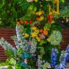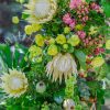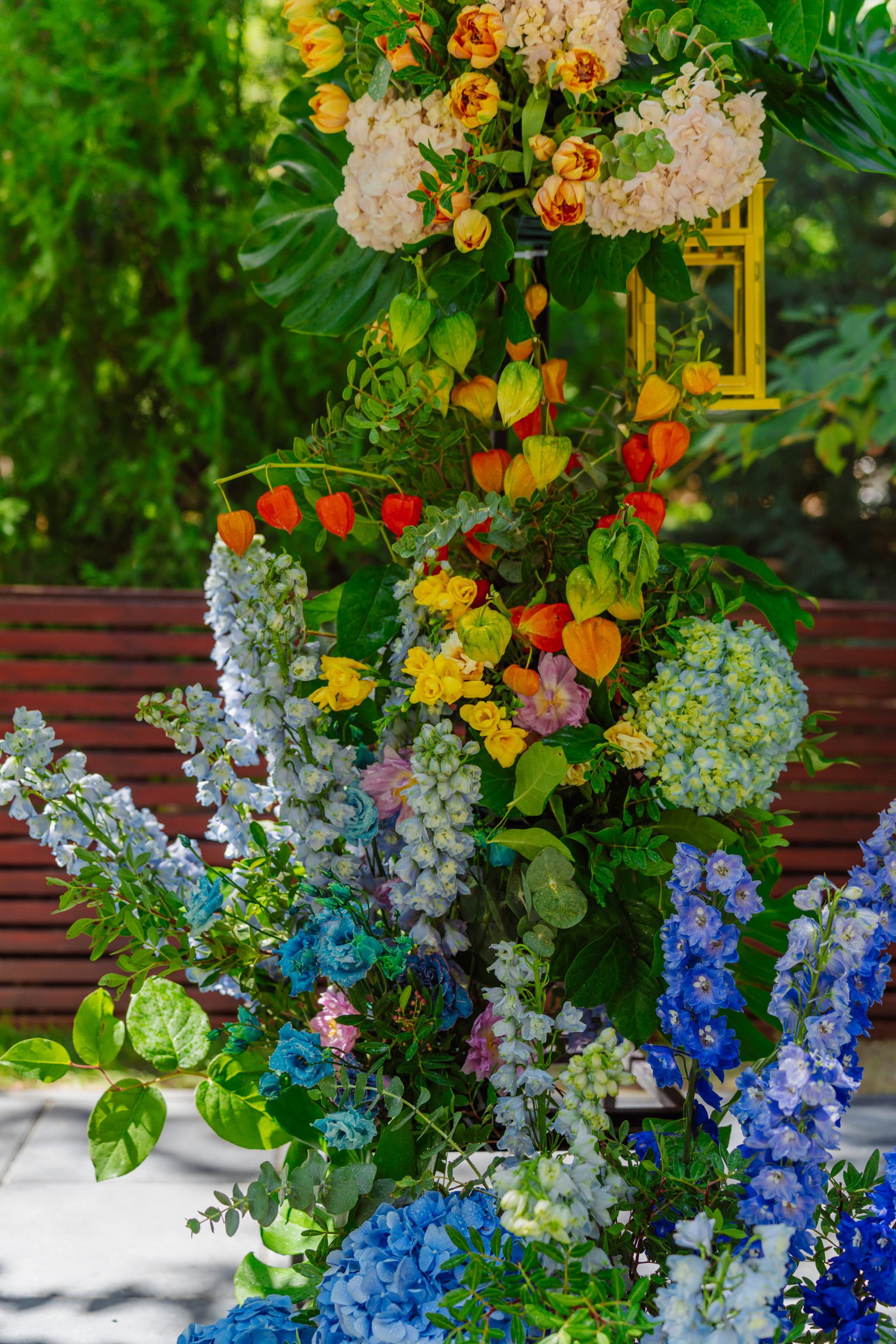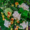 Modelul alăturat este construit pe un cadru metalic negru, de formă semi-ovală, unită în partea de sus, se folosește burete hidratat pentru susținerea florilor, astfel că vor rezista mult mai bine. Volumul este amplu, stilul de lucru natural, gardening, dezordonat, ca și tipuri de flori, am folosit: hortensii, molucella, delphinium, mini rose, trandafiri, anemone, physallis, mix greenery.