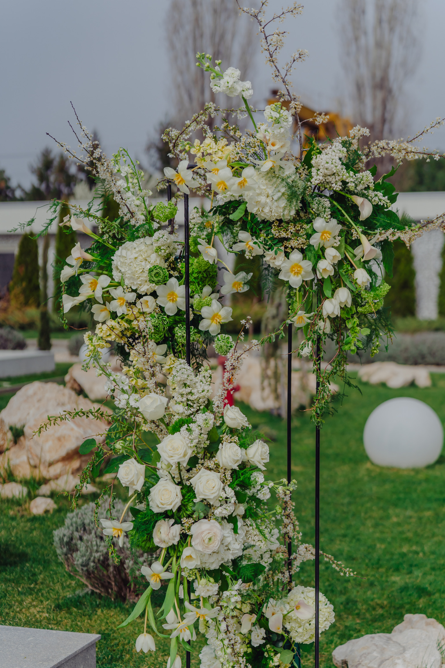 Am folosit o mare varietate de flori naturale, în nuanțe de alb și verde: lalele, viburnum, anthurium, trandafiri, hortensie, ranunculus, mathiola, cale, crenguțe, molucella, frezii, eucalipt, pistachia, asparagus, etc.