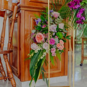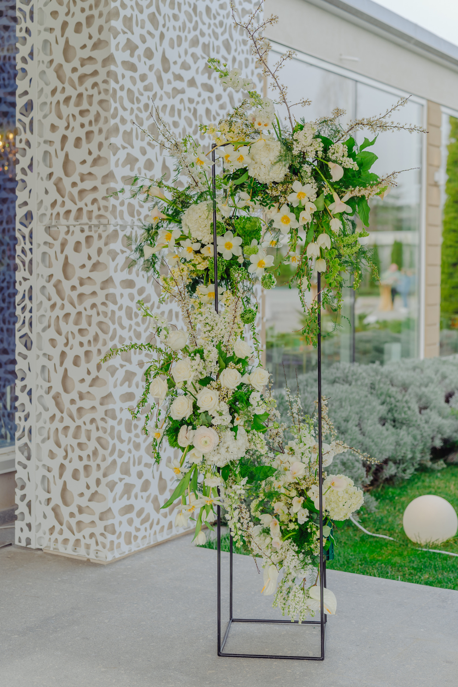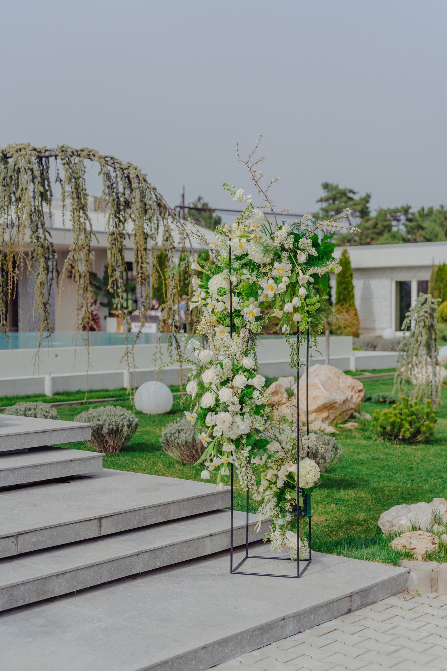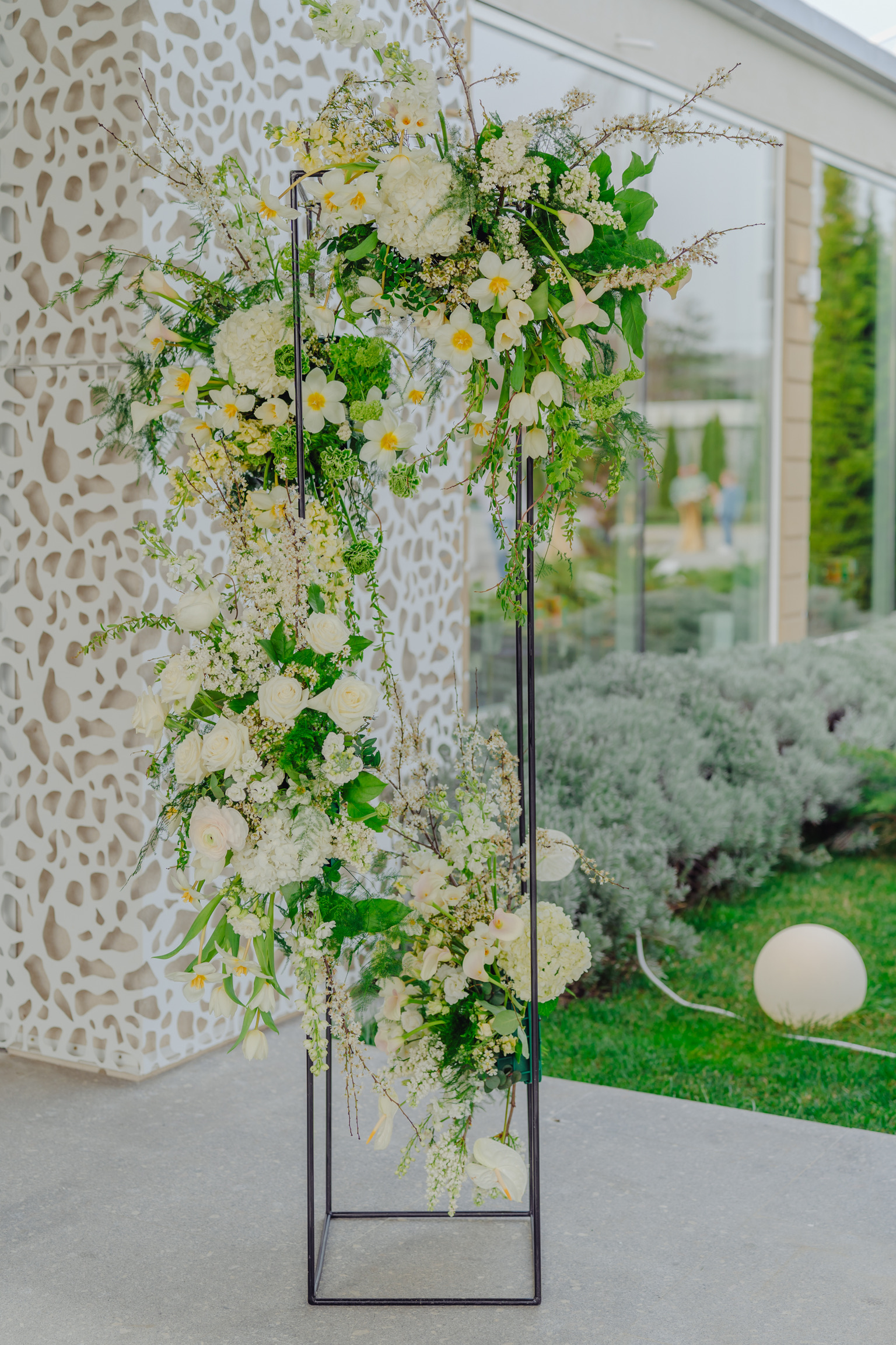 Aranjamentul floral este construit pe un suport din metal, cu aspect industrial, aranjamentele florale fiind dispuse asimetric. Volumul este amplu, stilul de lucru natural, gardening, dezordonat.