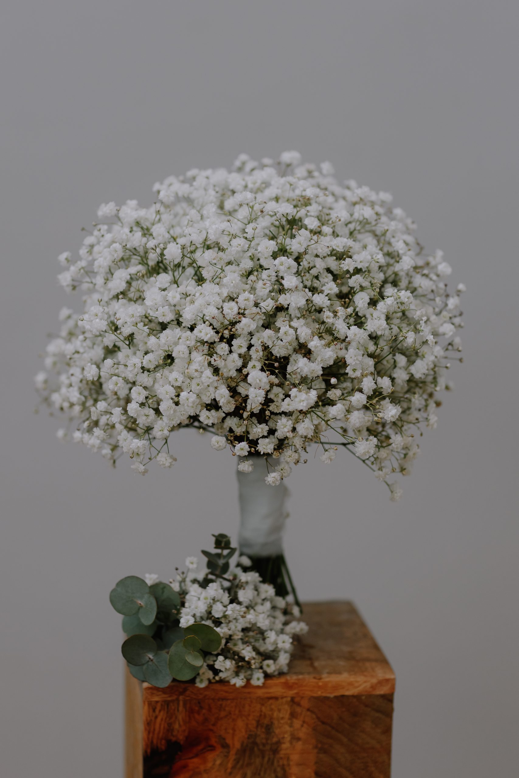 Componența acestui buchet: exclusiv gypsophila (sau floarea miresei). Are o semnificație simbolică legată de puritate, nevinovație, succes si dragoste de durată. Forma buchetului este rotundă, compactă, iar panglica decorativă – albă, potrivit pentru o rochie de mireasă elegantă și rafinată.