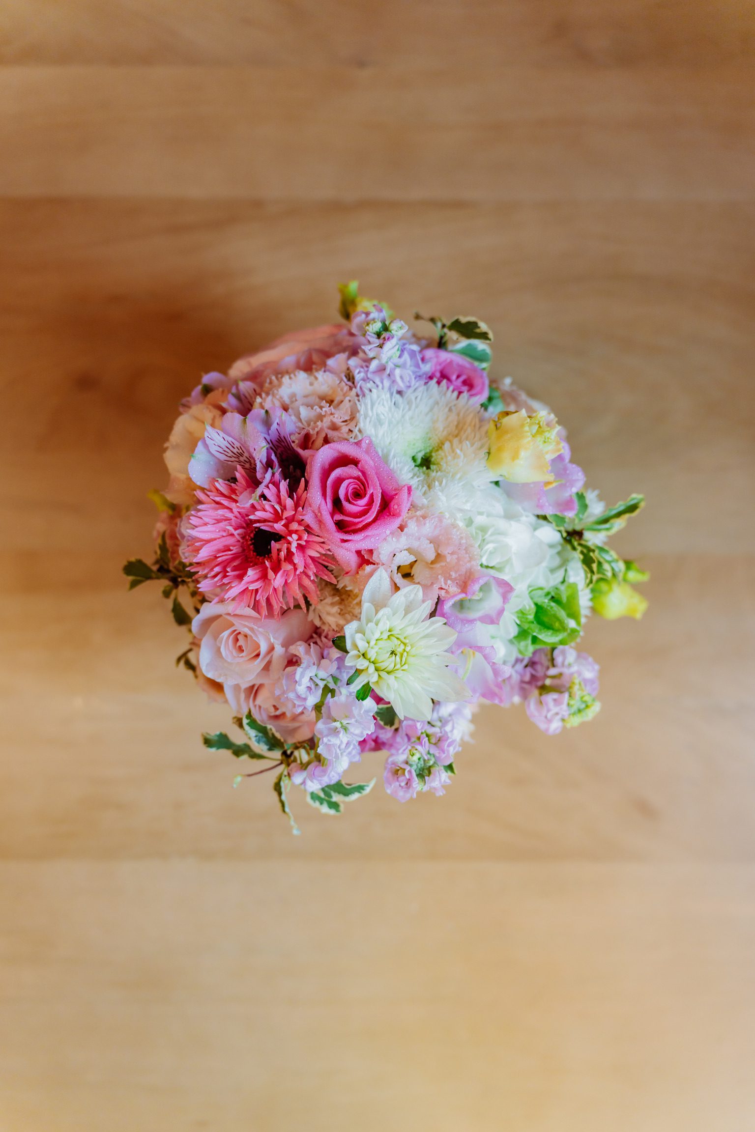 Buchet compact, pastelat, cu trandafiri și mini rose