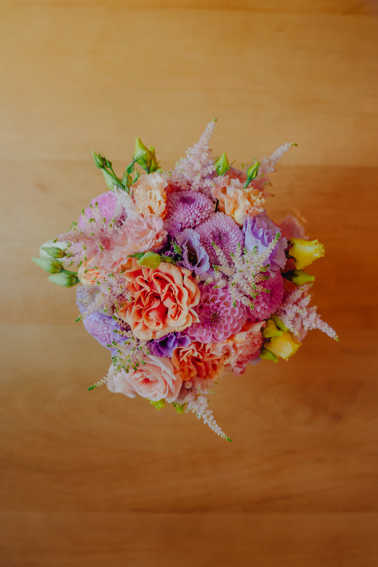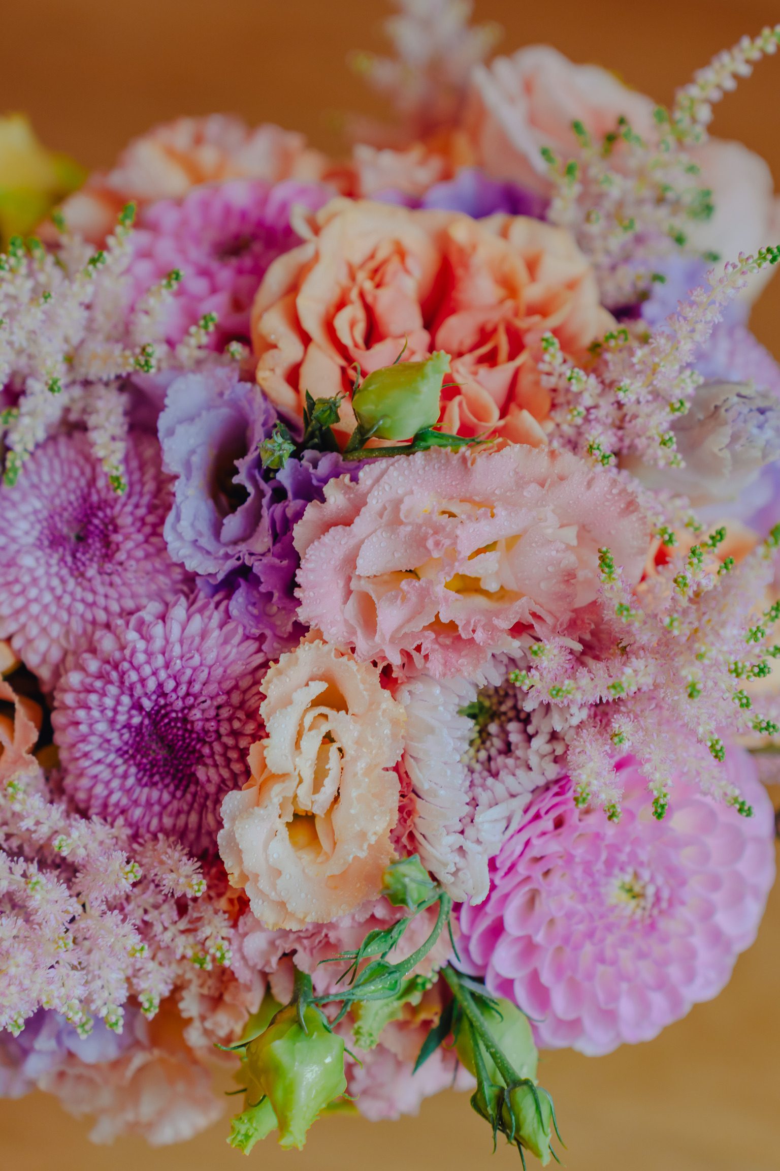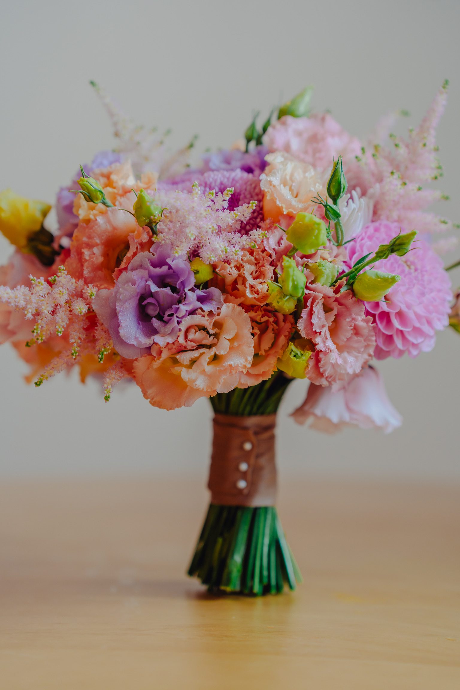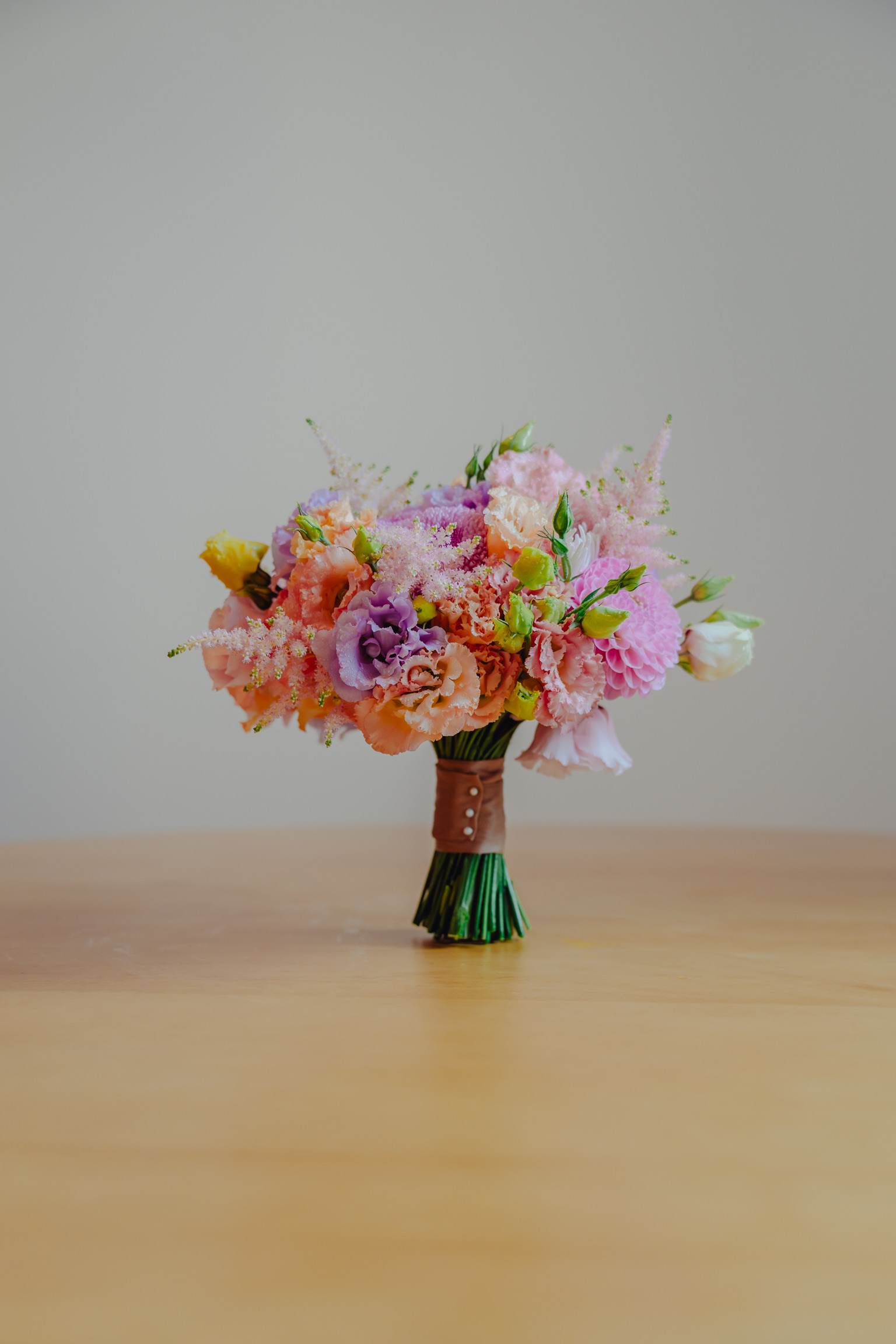 Buchet de cununie, cu lisianthus, dalii și astilbe