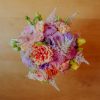 Componență florală: dalii, lisianthus, astilbe, trandafiri de grădină, crizanteme etc.