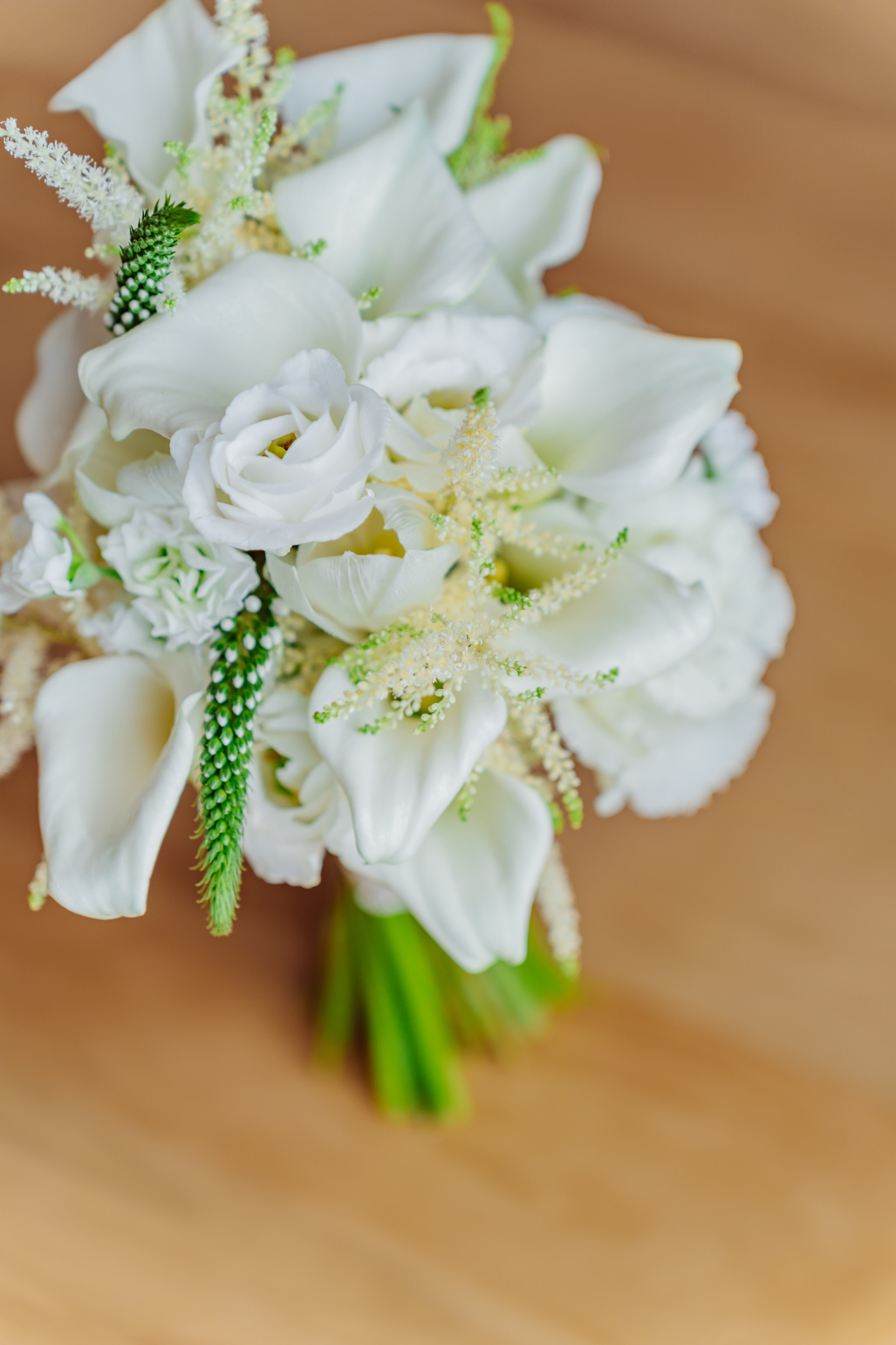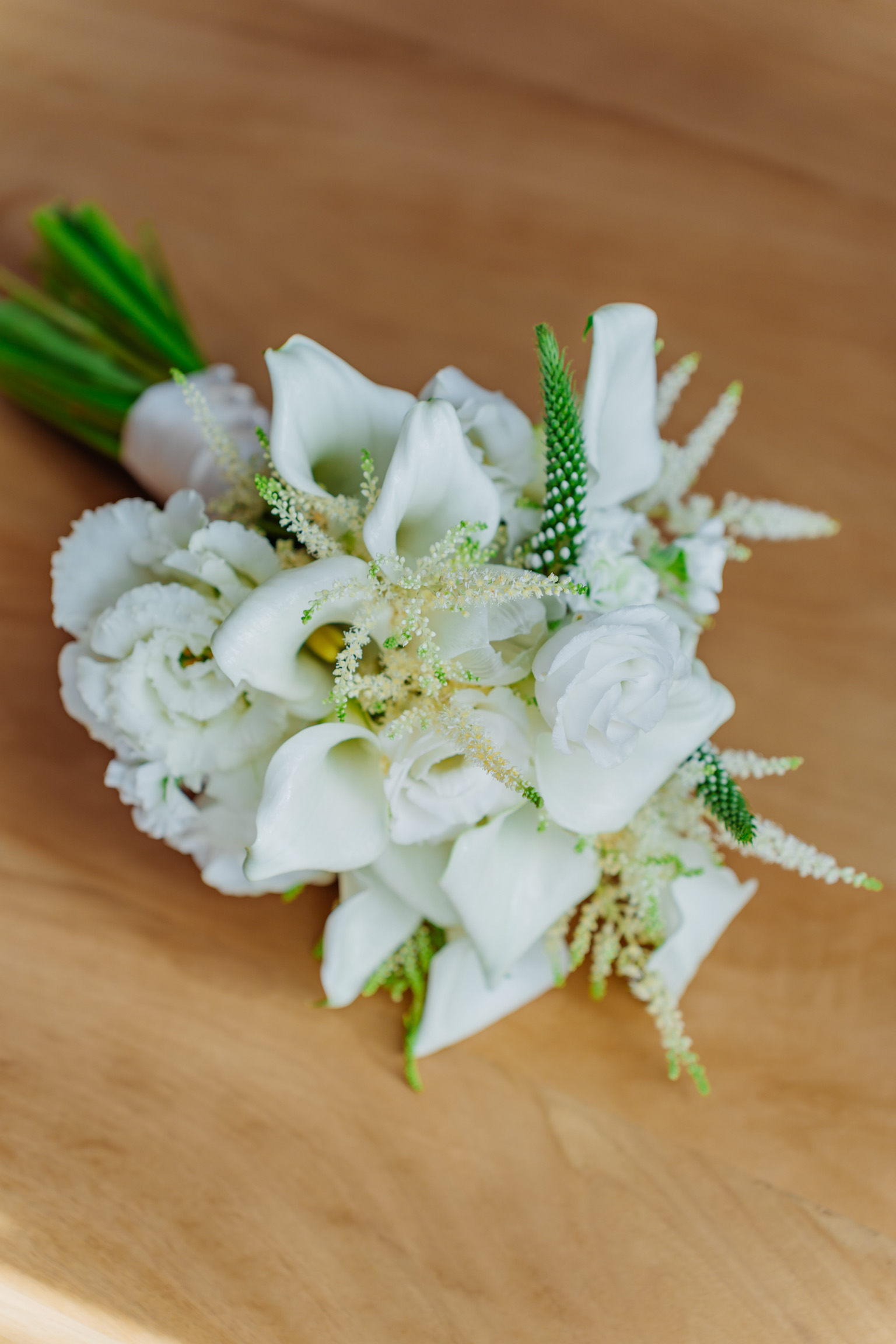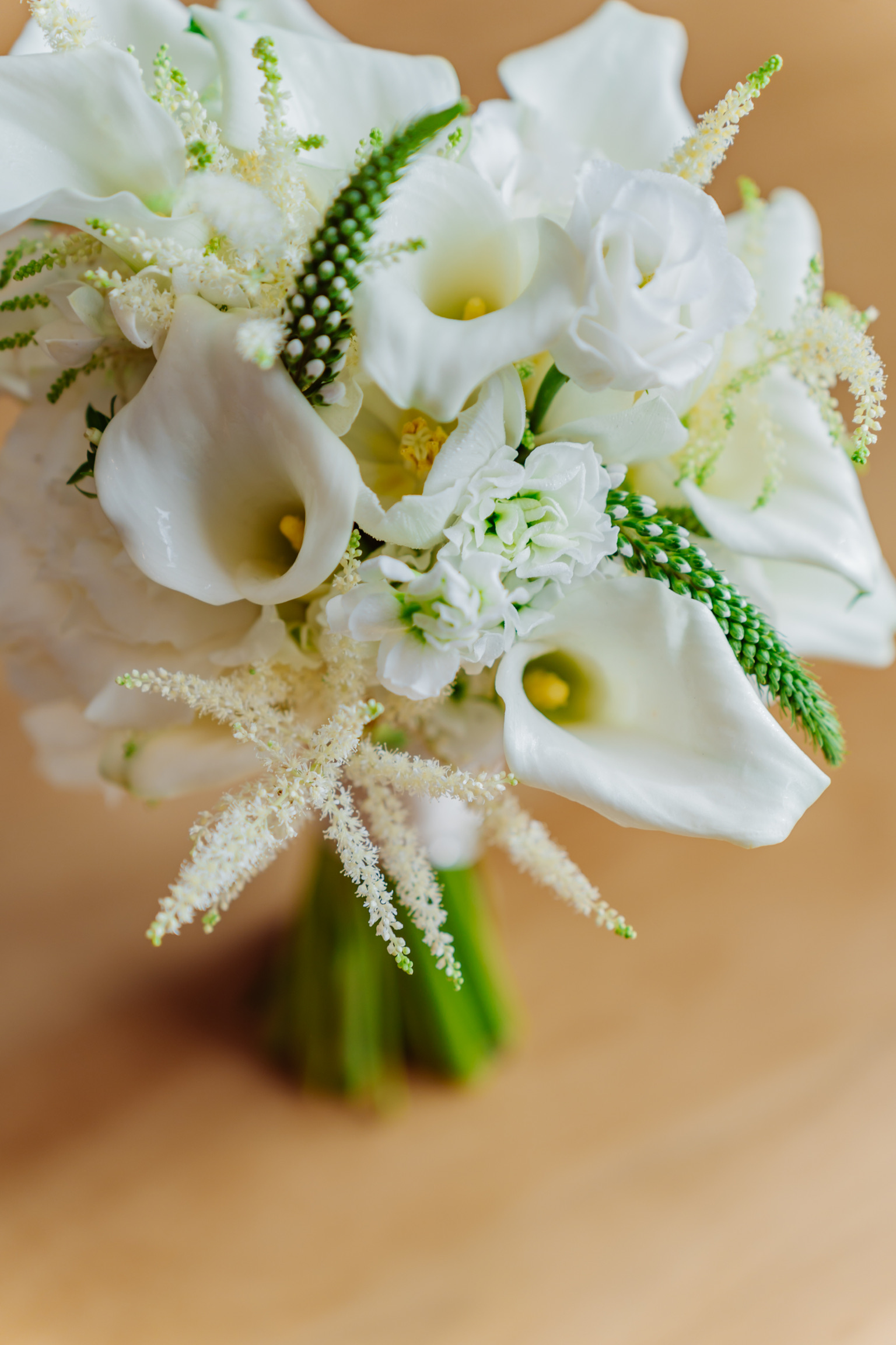 Buchet de mireasă cu cale albe, astilbe și veronica