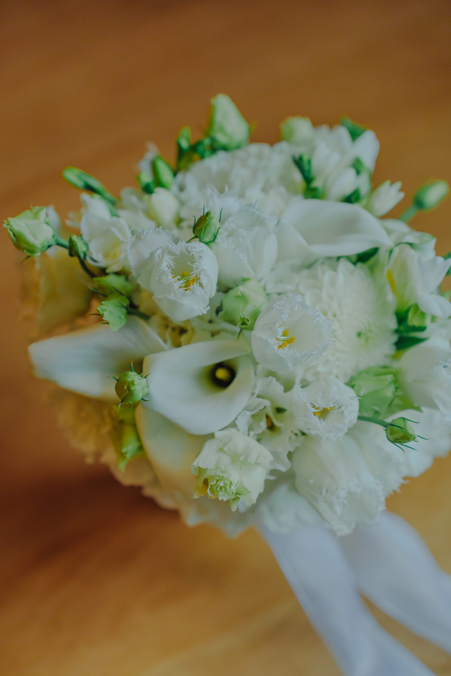 Componență florală: cale albe, lisianthus, lalele, dalii.