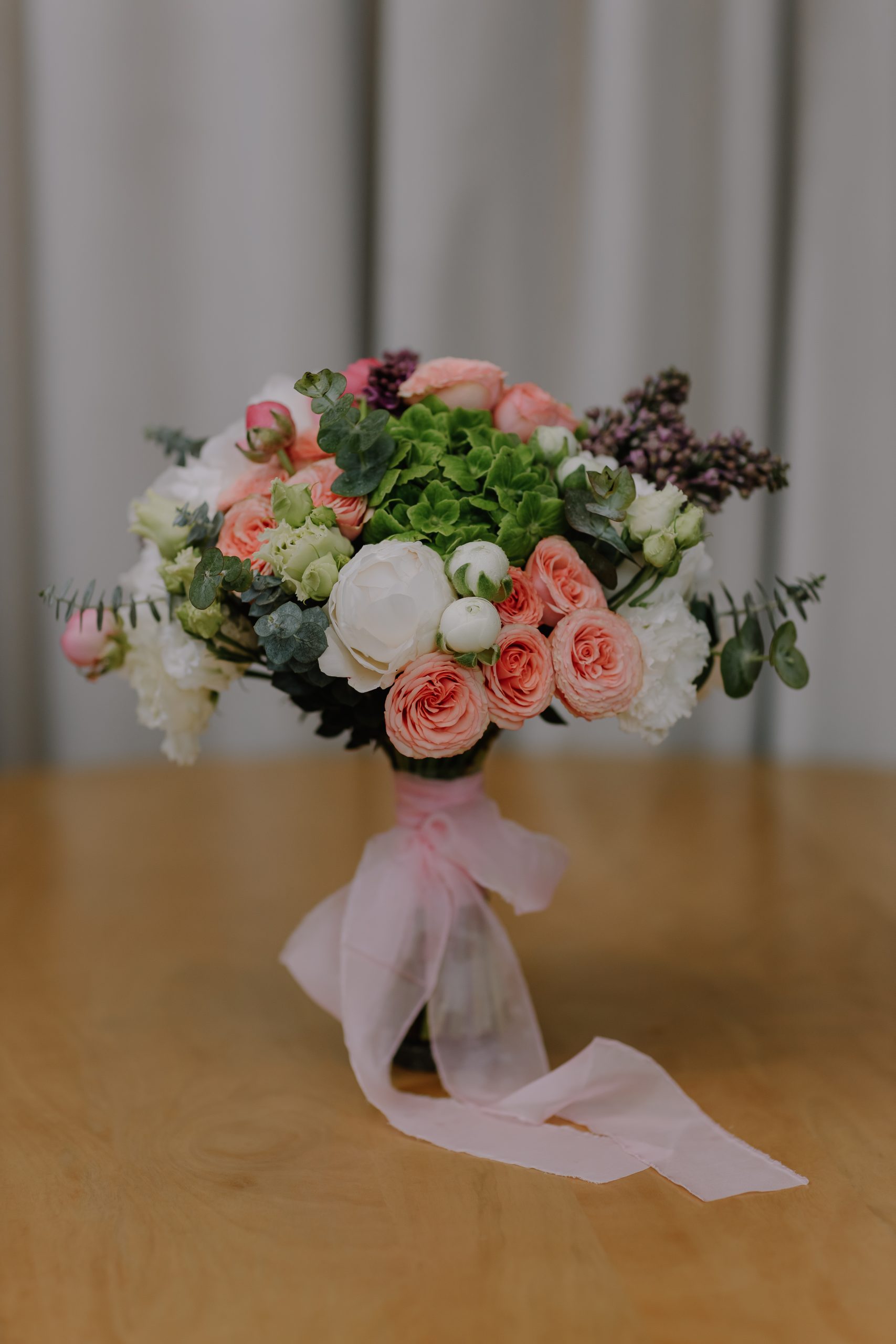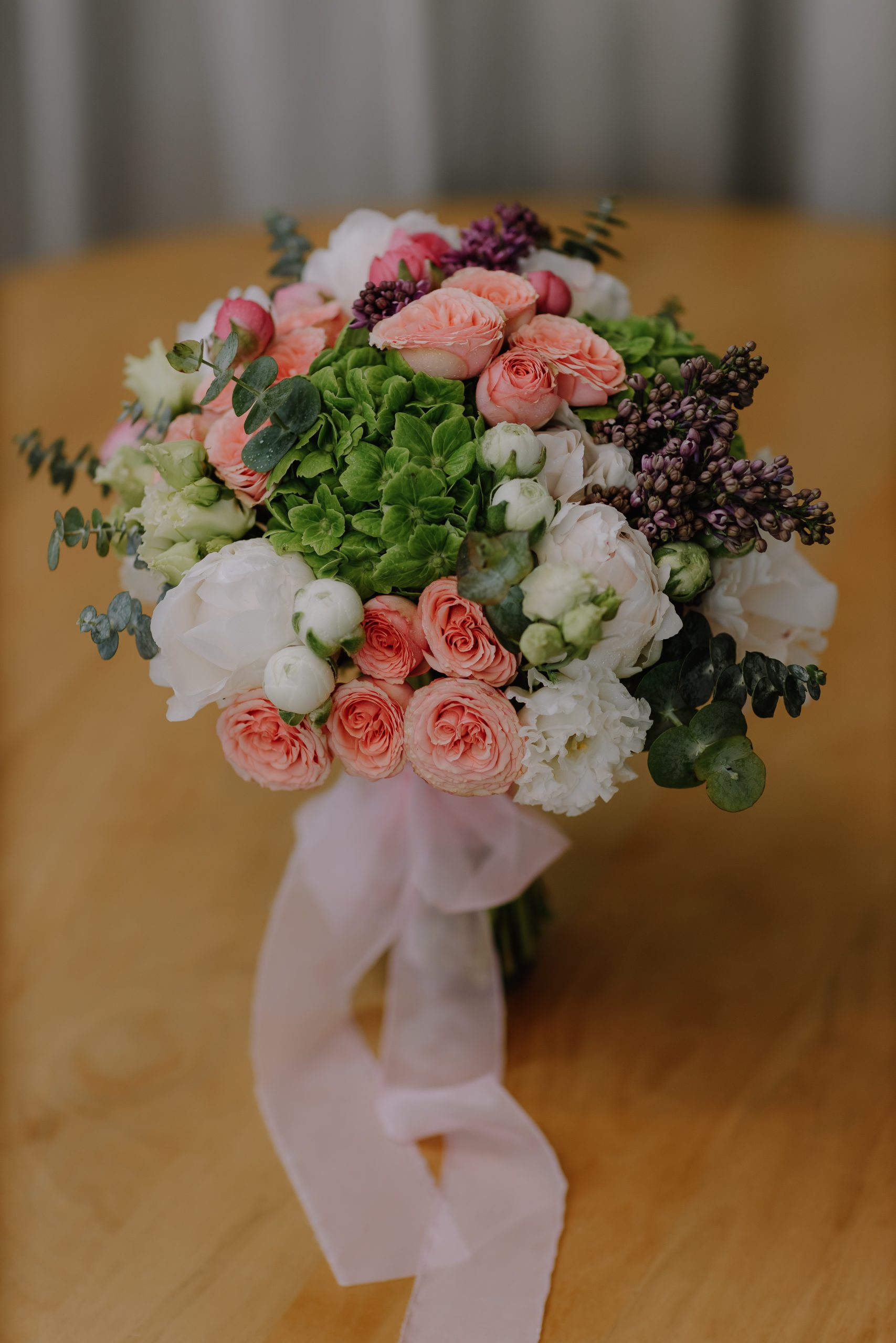 Componența acestui buchet de primăvară: mini rose peach, hortensie verde, liliac, bujori, ranunculus, lisianthus.