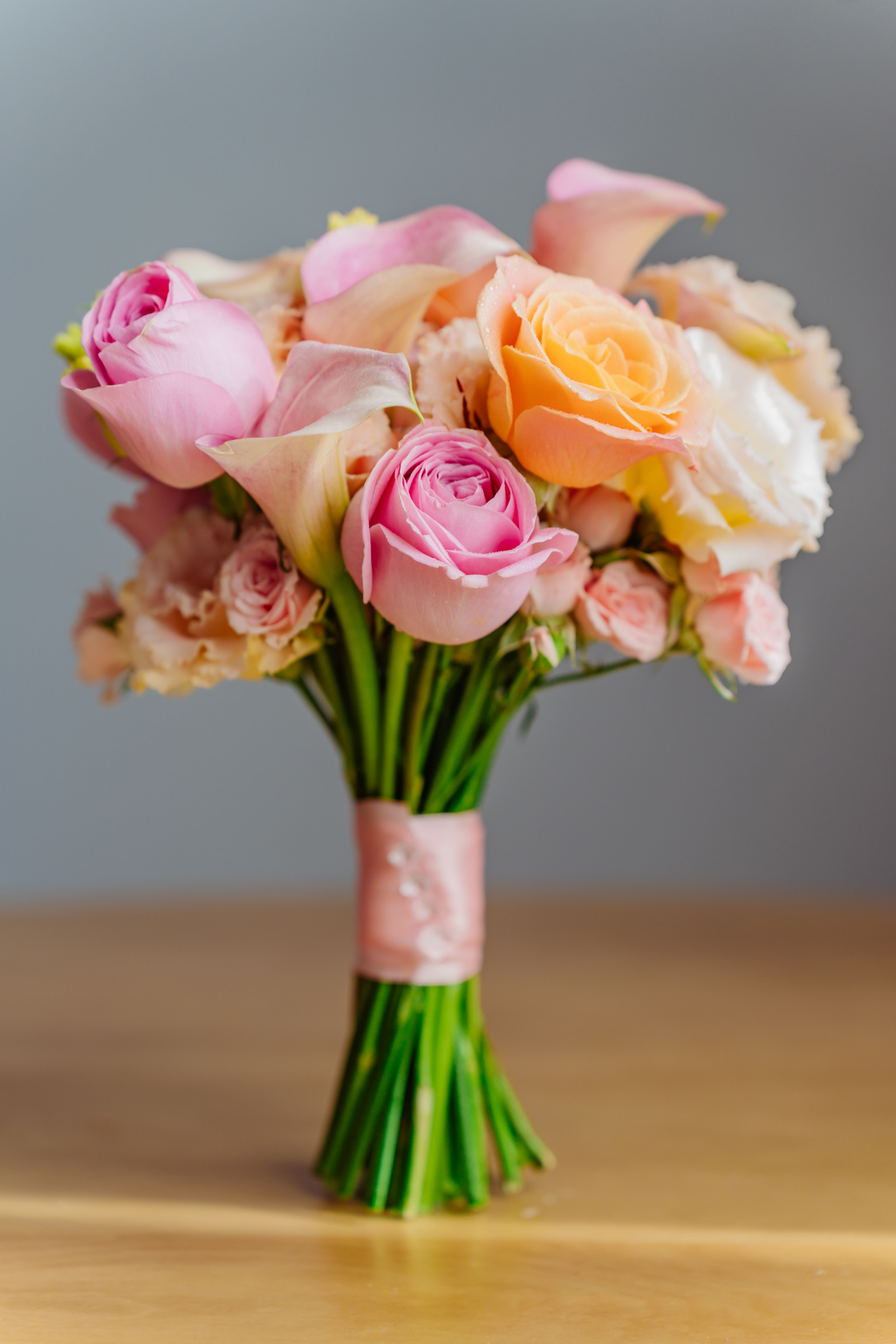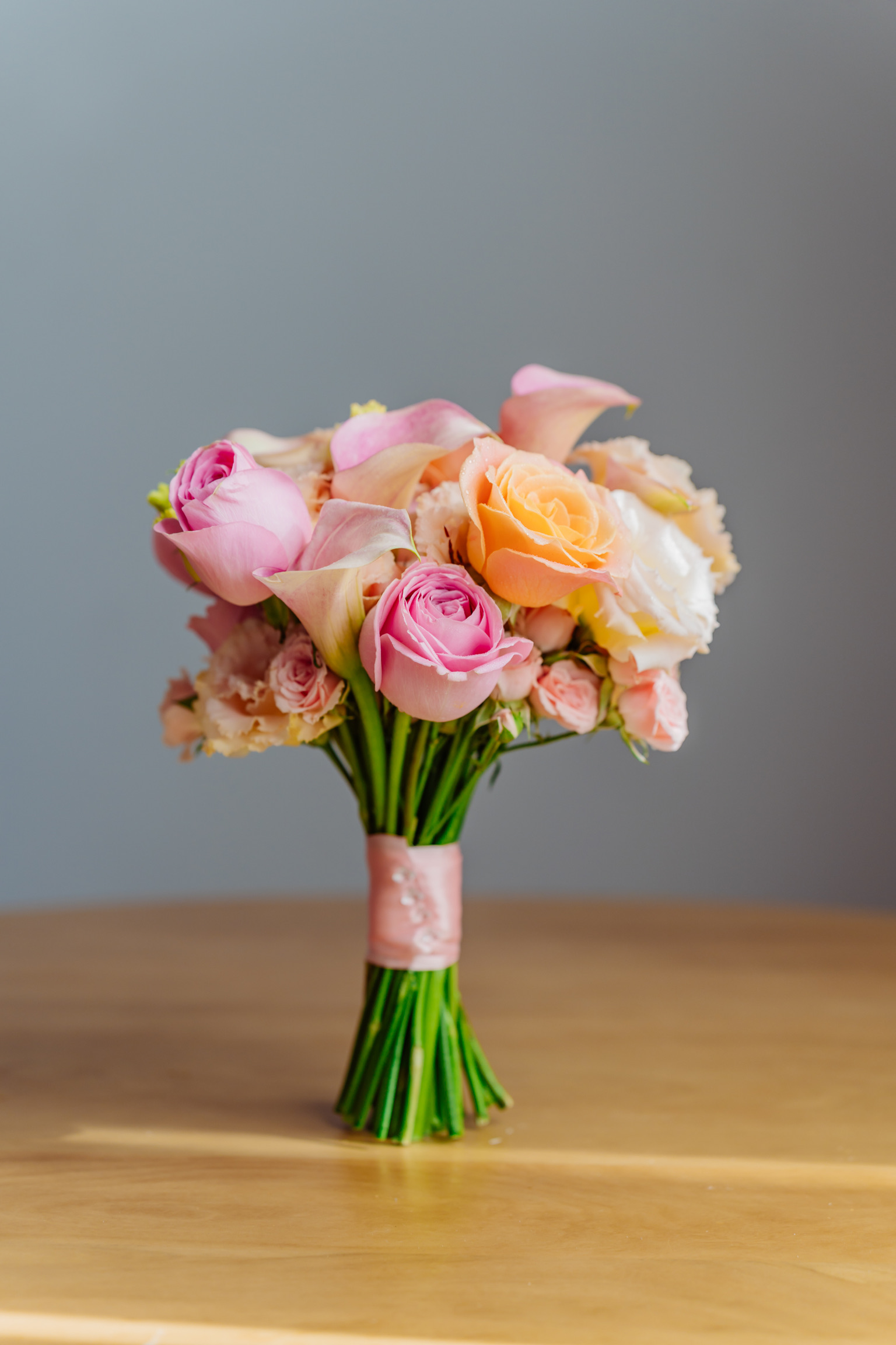 Componență florală: cale roz pal, mini rose și trandafiri peach, lisianthus.