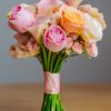 Buchetele realizate în atelierul nostru sunt prinse cu panglică decorativă din mătase, voal sau satin, asortată cromatic florilor. Alegem materialul ce se potrivește cel mai bine cu forma și stilul buchetului.