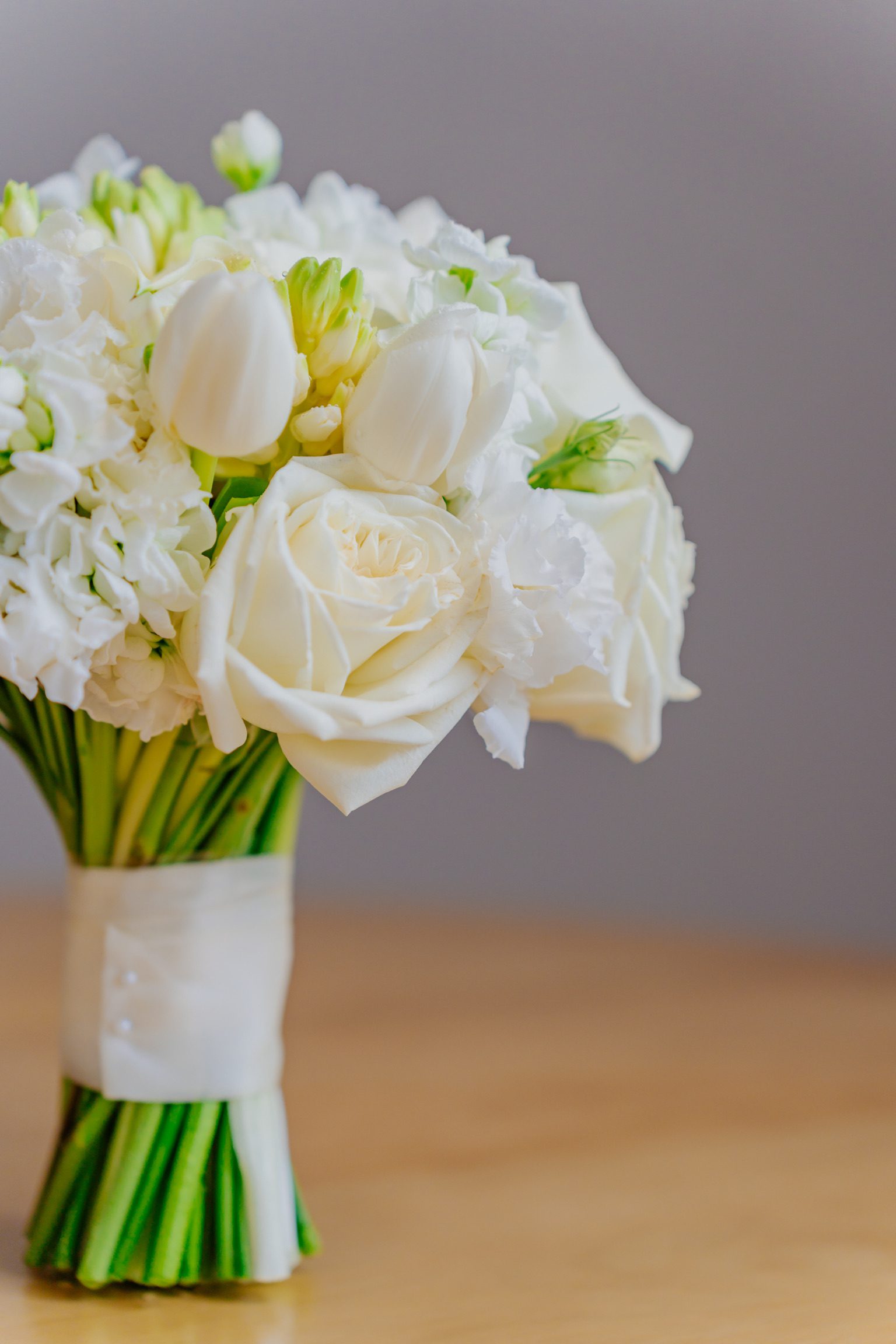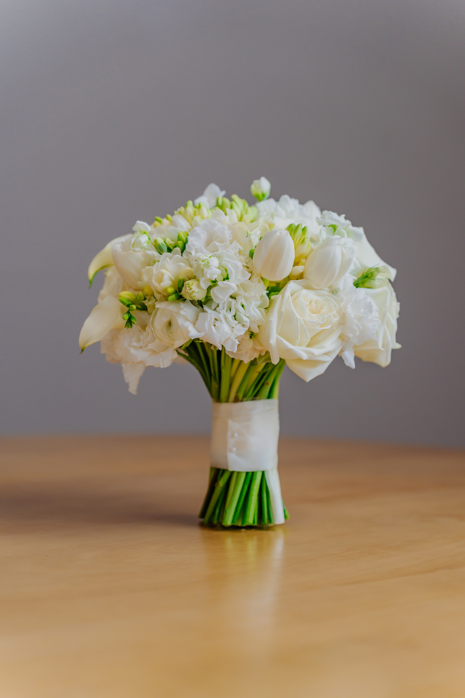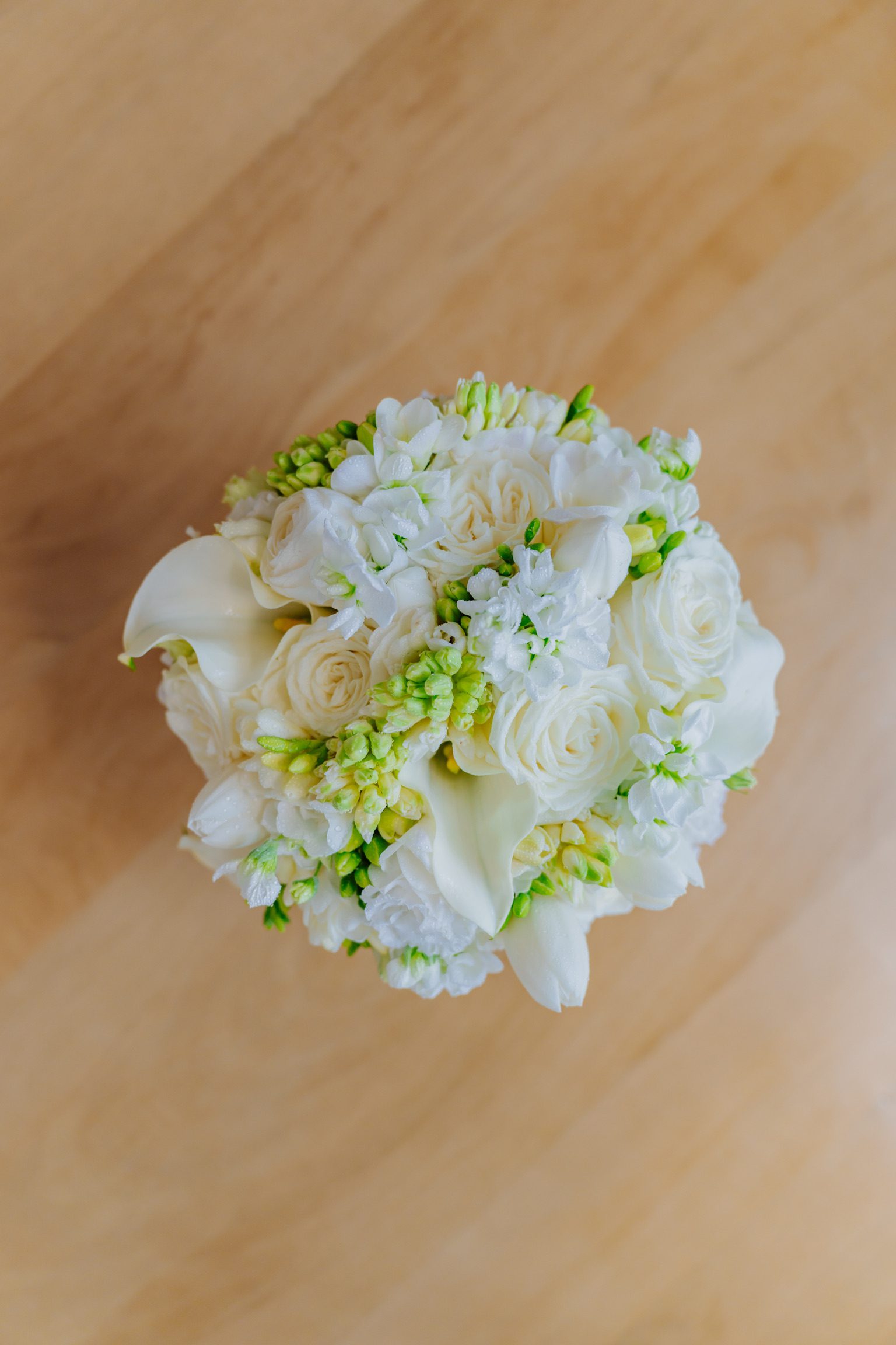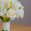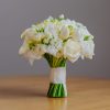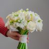 Buchet de mireasă, cu formă rotundă, compactă. Am alăturat următoarele sortimente de flori albe: lalele, trandafiri, frezii, mini rose, mathiola etc. Buchetul are un aer pur, fin, diafan.