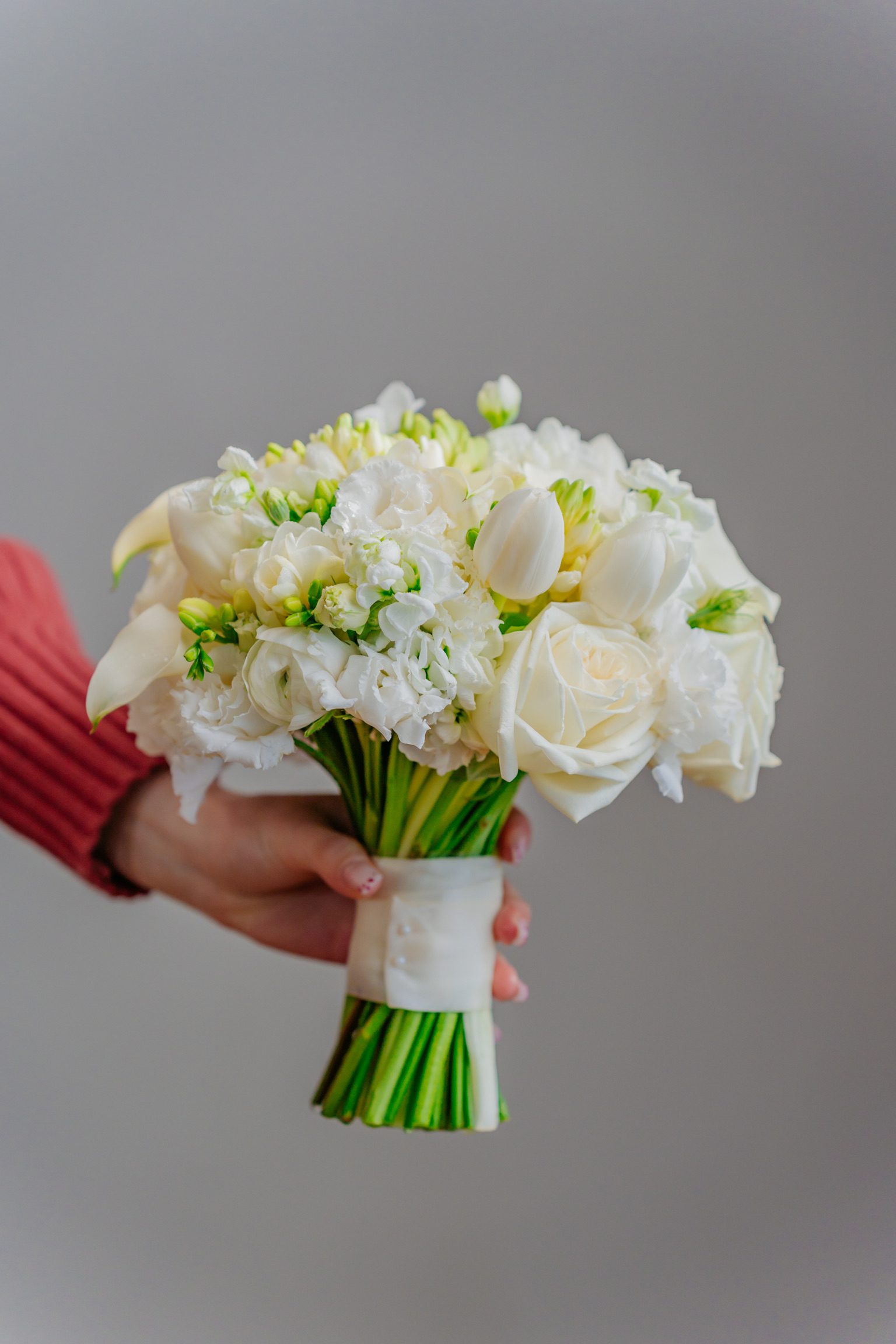 În atelierul nostru, obișnuim să prindem buchetele cu panglică decorativă din voal, satin sau mătase, asortată florilor, conferind un aspect natural, ușor curgător, boem.