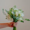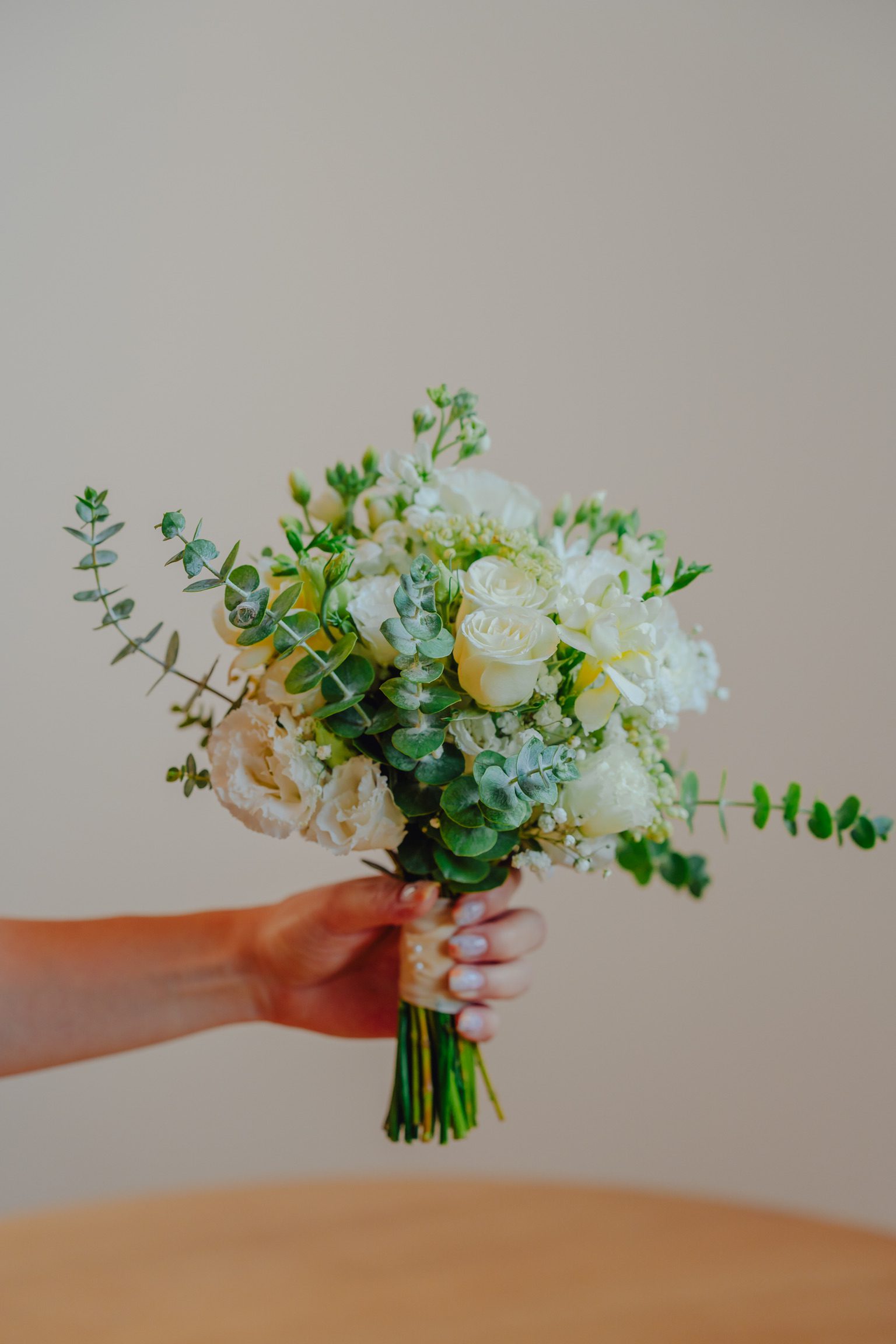 Componență florală: eucalipt, mini rose, lisianthus, gypsophila.