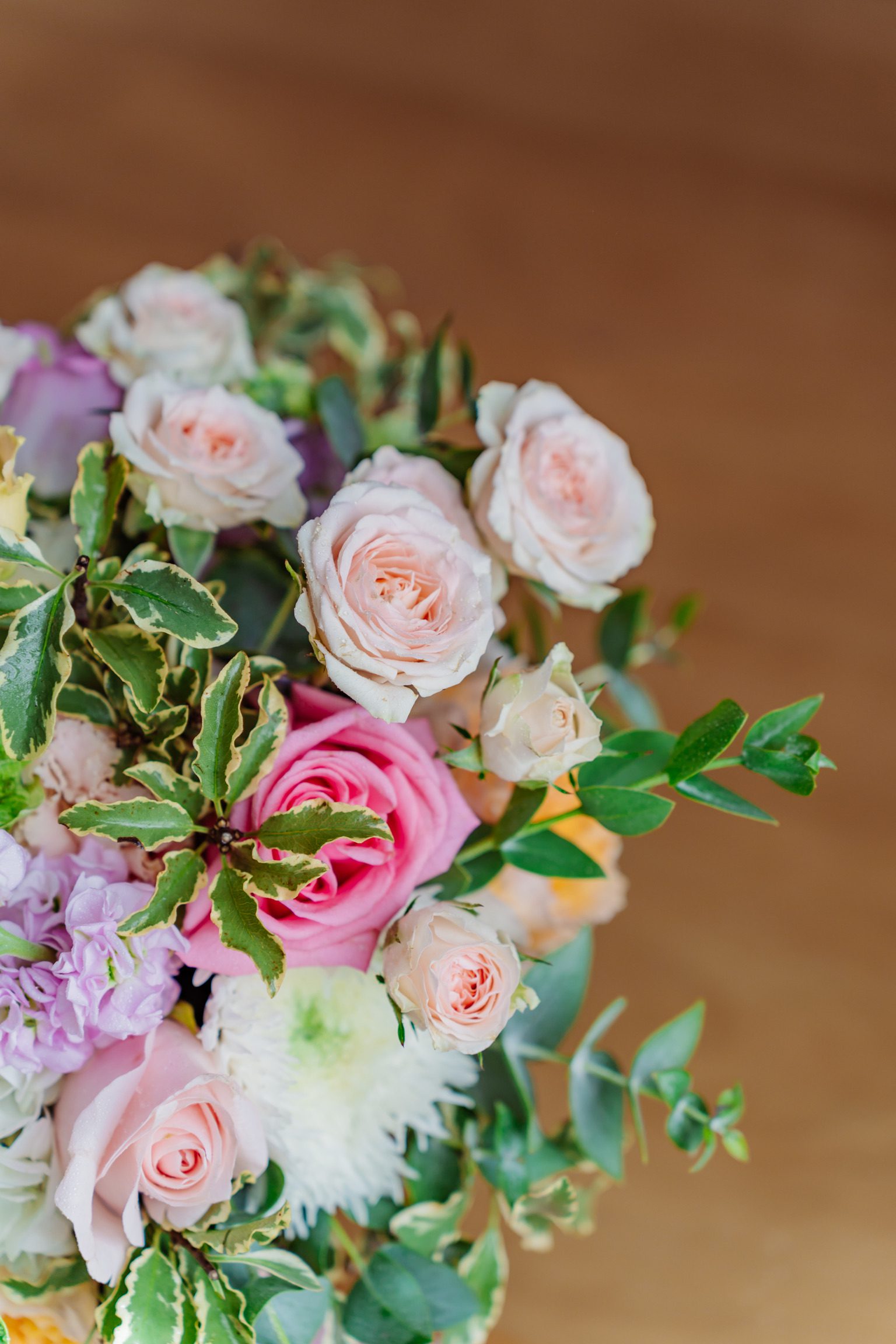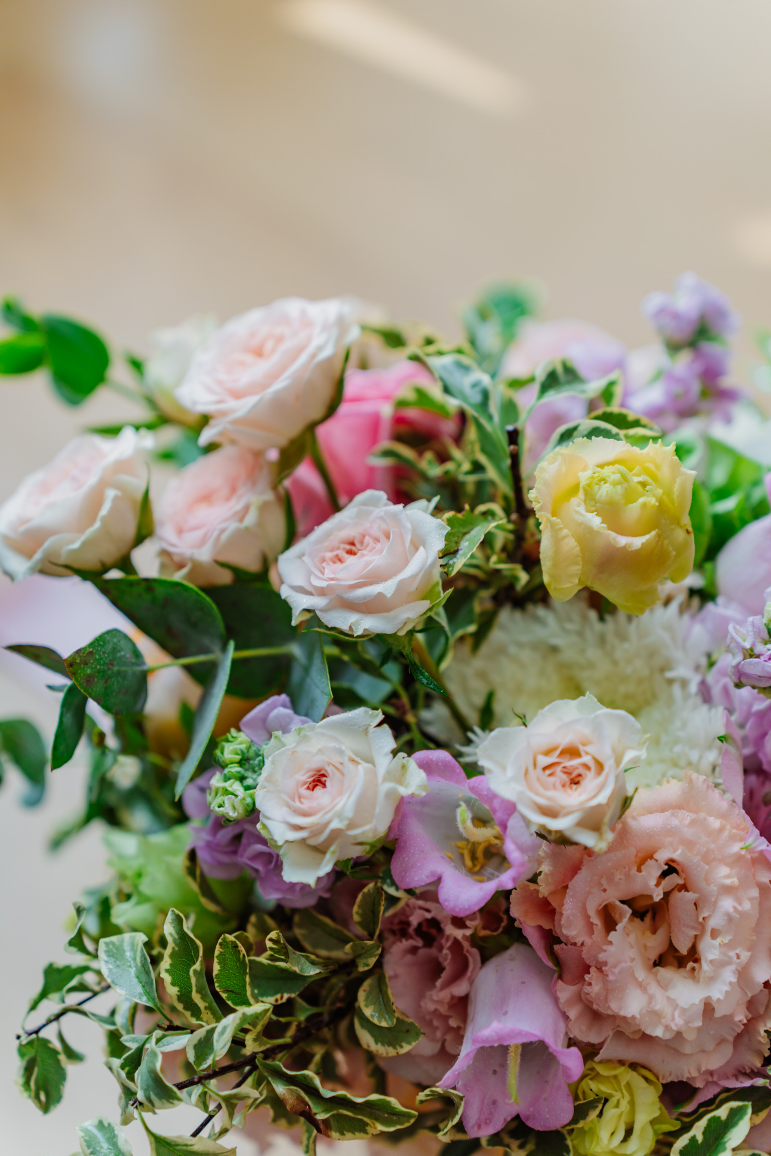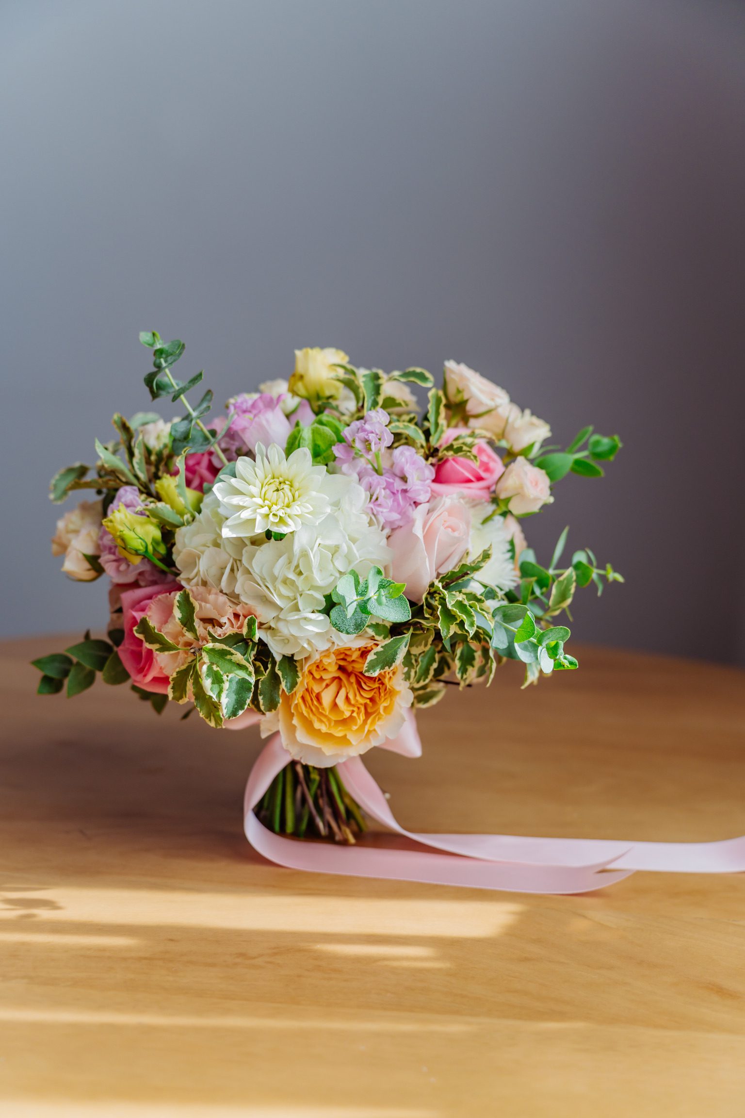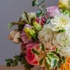 Componență florală: dalii, trandafiri de grădină, mini rose, hortensii, pittosporum, lisianthus, campanula etc.