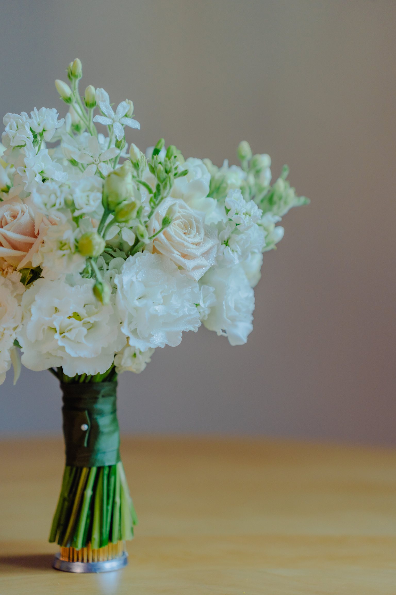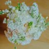 Buchet de mireasă compact, cu lisianthus și tradafiri
