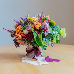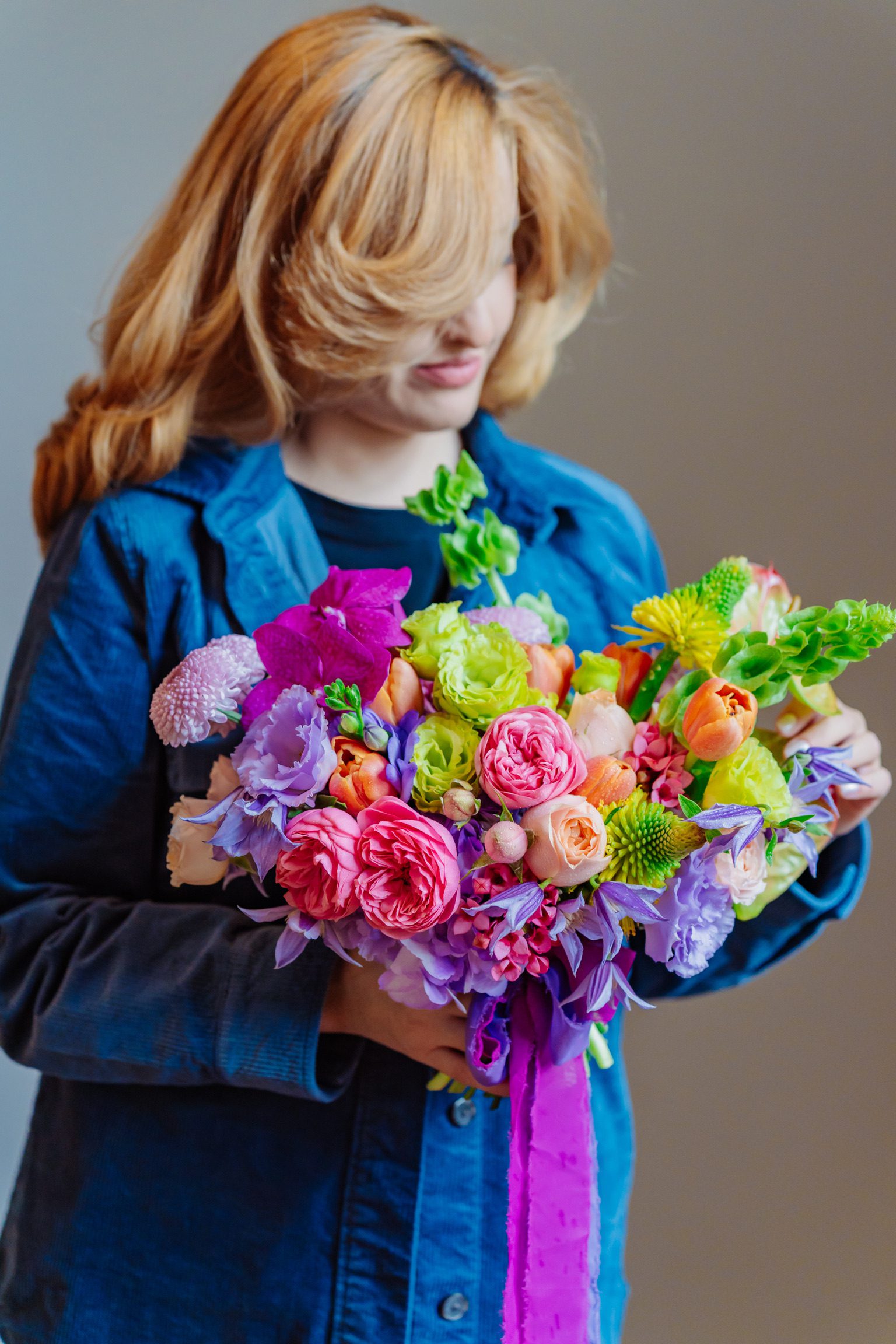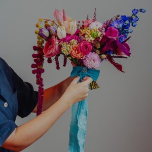 Buchetele realizate în atelierul nostru sunt prinse cu panglică decorativă din mătase, voal sau satin, asortată cromatic florilor. Alegem materialul ce se potrivește cel mai bine cu forma și stilul buchetului.