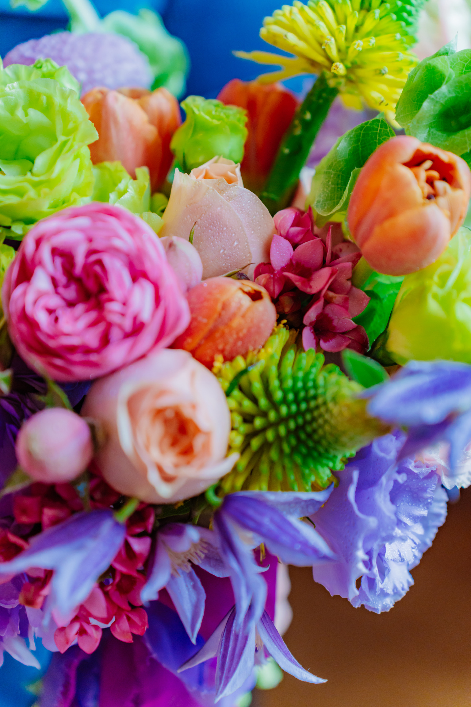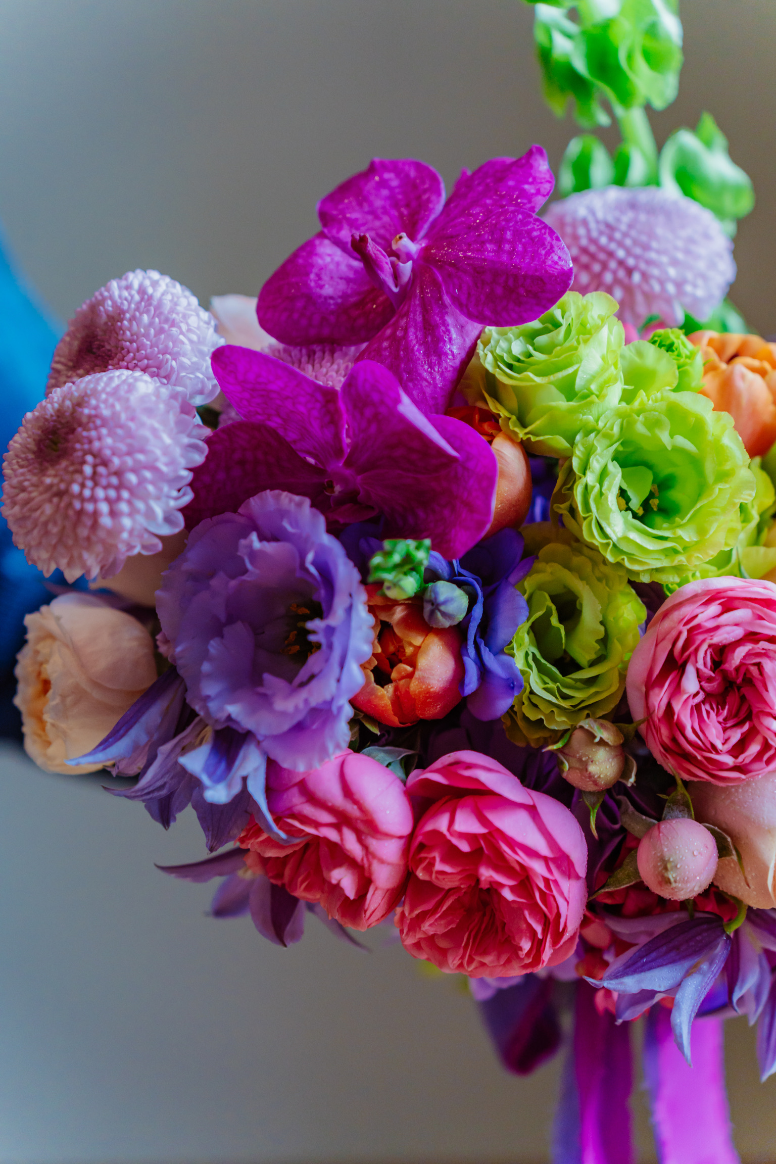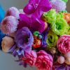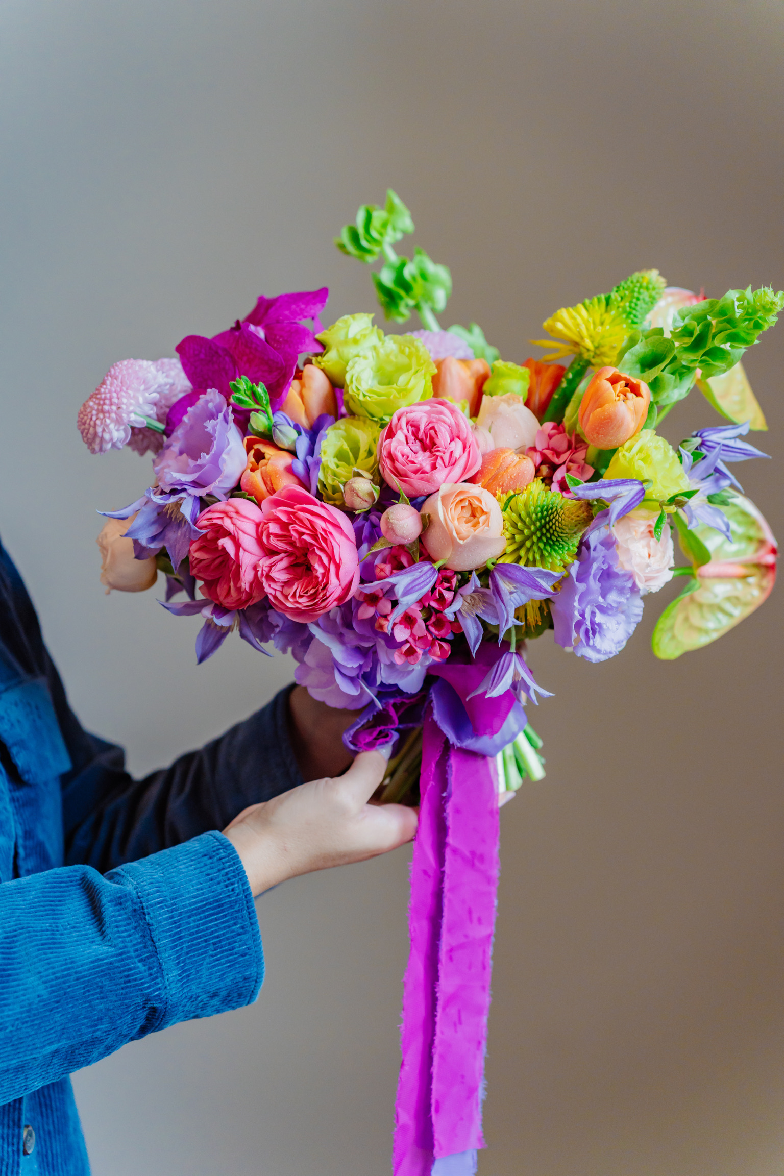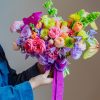 Componență florală: lisianthus, mini rose, anthurium, clematis, molucela, vanda, crizantemă, bouvardia, lalele etc.