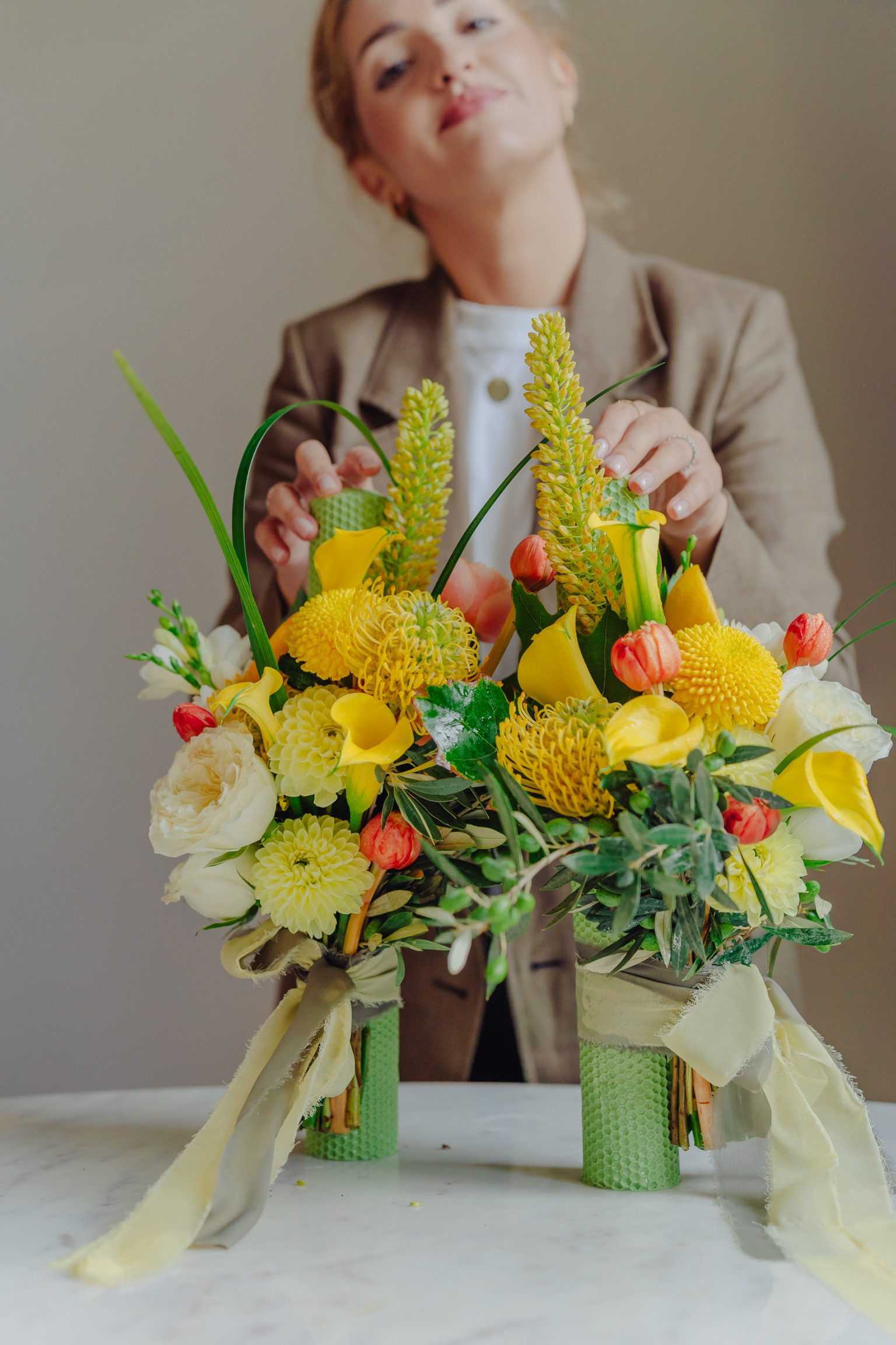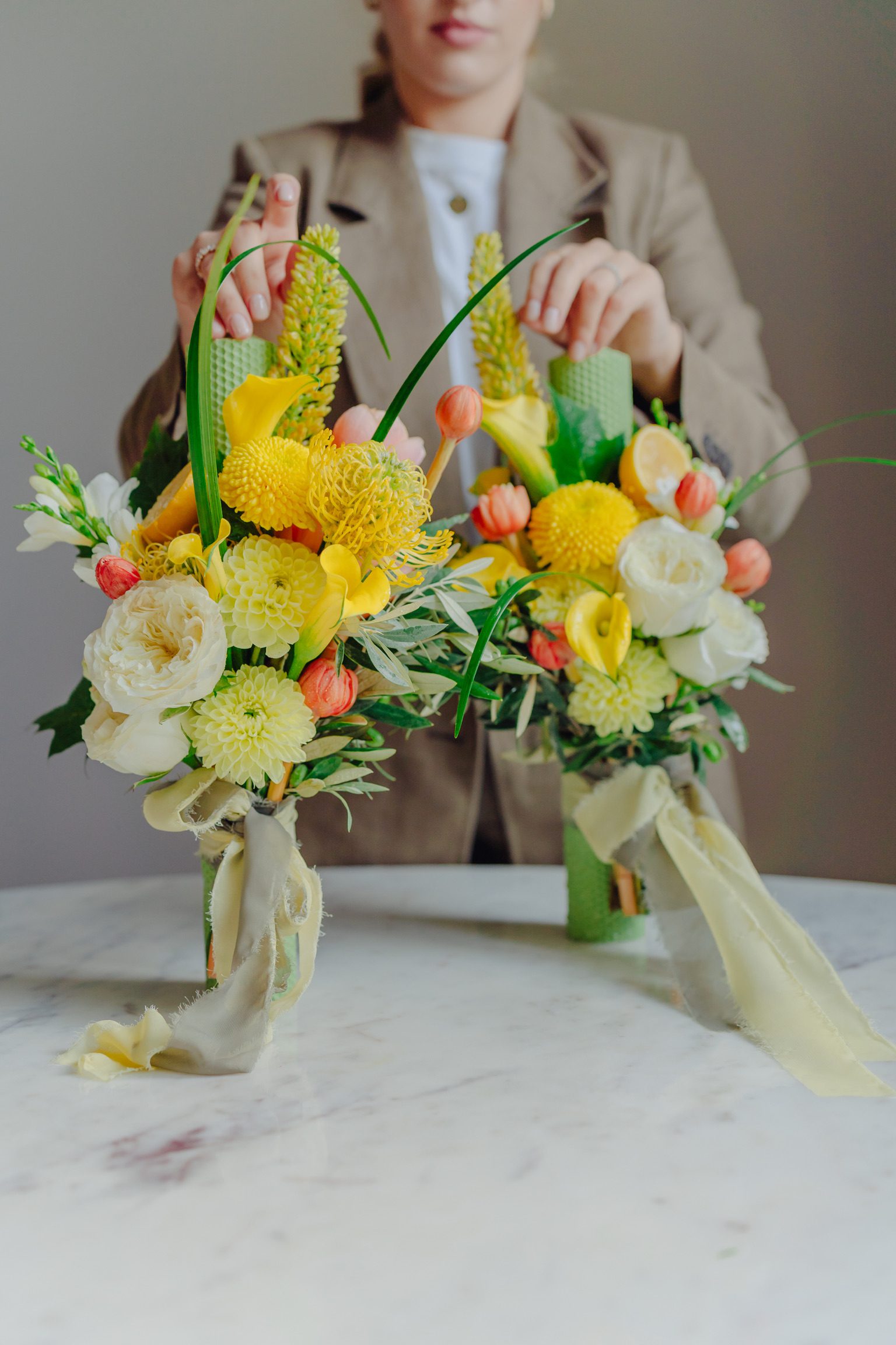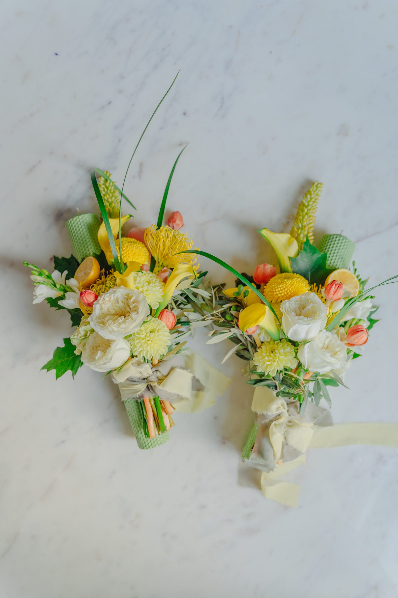 Seturile de lumânări pentru ceremonia religioasă, create în Atelierul nostru sunt întotdeauna inspirate din componența și cromatica de ansamblu a buchetului de mireasă. Lumânările sunt decorate cu flori naturale, au o înălțime de 35 – 40 cm, fiind confecționate din parafină sau ceară naturală de albine. Accesorizăm întodeauna lumânările cu o panglică decorativă, din voal, mătase sau satin, într-o culoare asortată.