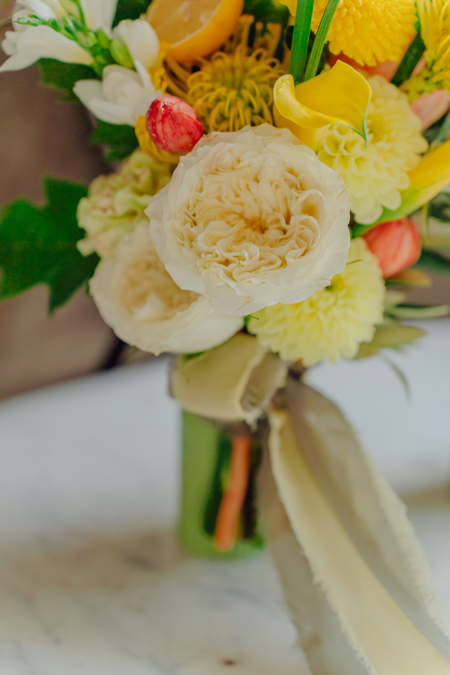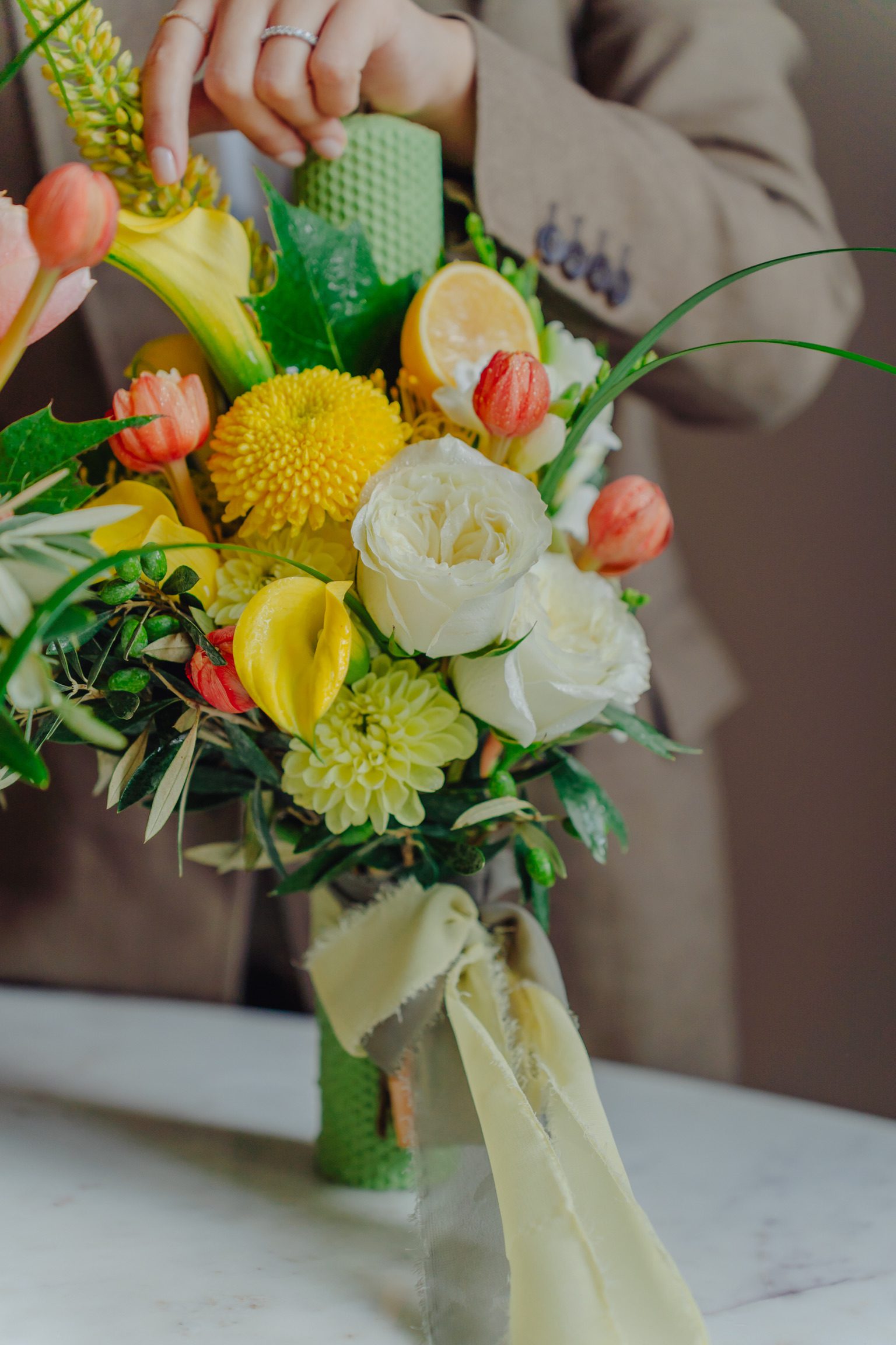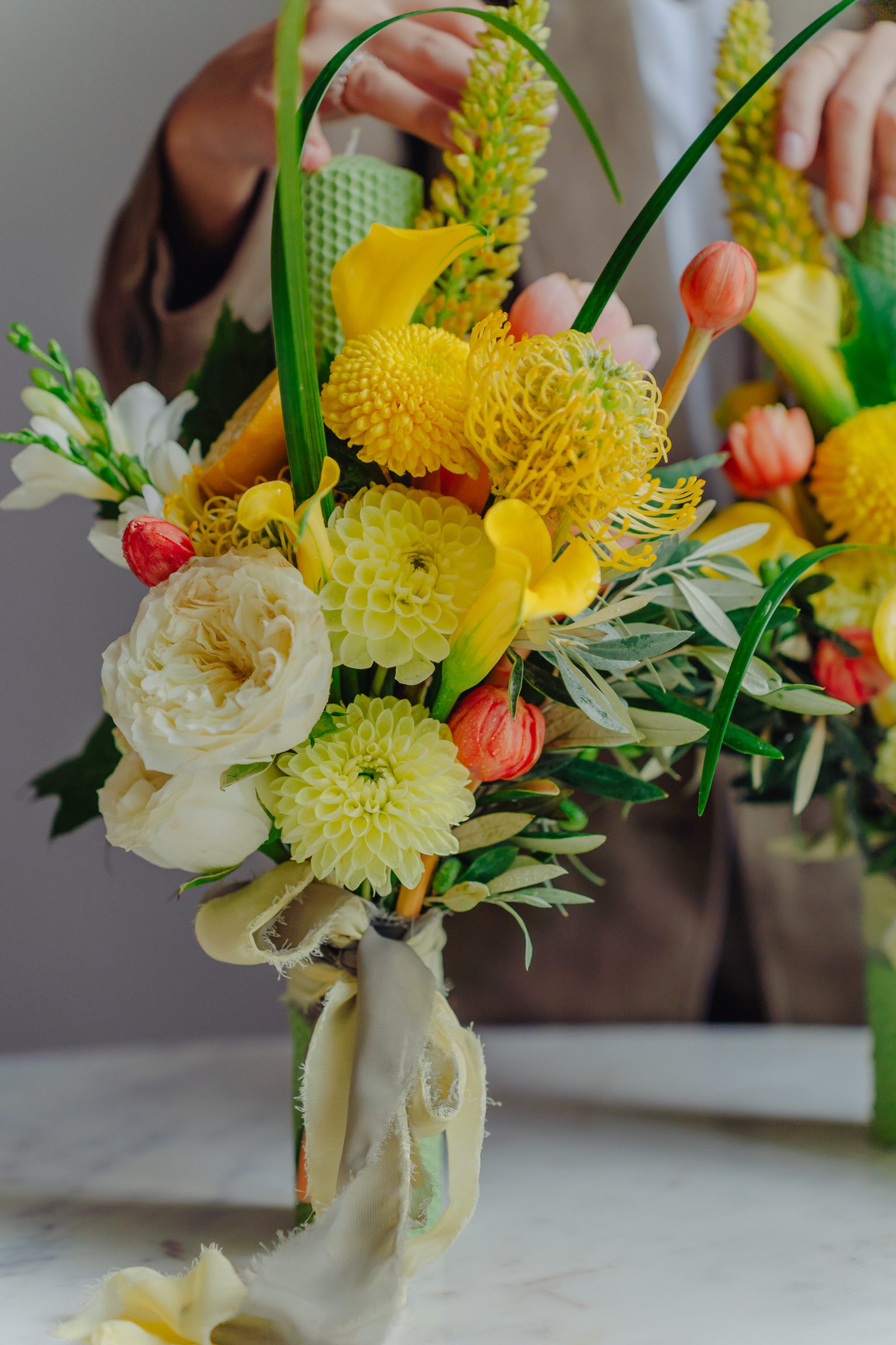 Seturile de lumânări pentru ceremonia religioasă, create în Atelierul nostru sunt întotdeauna inspirate din componența și cromatica de ansamblu a buchetului de mireasă. Lumânările sunt decorate cu flori naturale, au o înălțime de 35 – 40 cm, fiind confecționate din parafină sau ceară naturală de albine. Accesorizăm întodeauna lumânările cu o panglică decorativă, din voal, mătase sau satin, într-o culoare asortată.