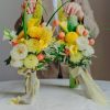 Setul alăturat este confecționat din ceară naturală de albine, de culoarea verde, având o înălțime de 40 cm. Compoziția florală: crizanteme momoco galbene, frezii, trandafiri, celosia, dalii, leucospermum, lalele portocalii, cale galbene, tuberoze, crenguțe de măslin,etc.