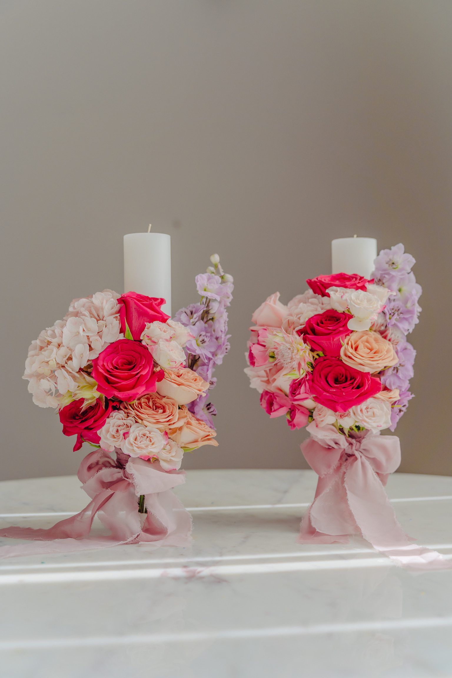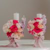Seturile de lumânări pentru ceremonia religioasă, create în Atelierul nostru sunt întotdeauna inspirate din componența și cromatica de ansamblu a buchetului de mireasă. Lumânările sunt decorate cu flori naturale, au o înălțime de 35 – 40 cm, fiind confecționate din parafină sau ceară naturală de albine. Accesorizăm întodeauna lumânările cu o panglică decorativă, din voal, mătase sau satin.