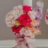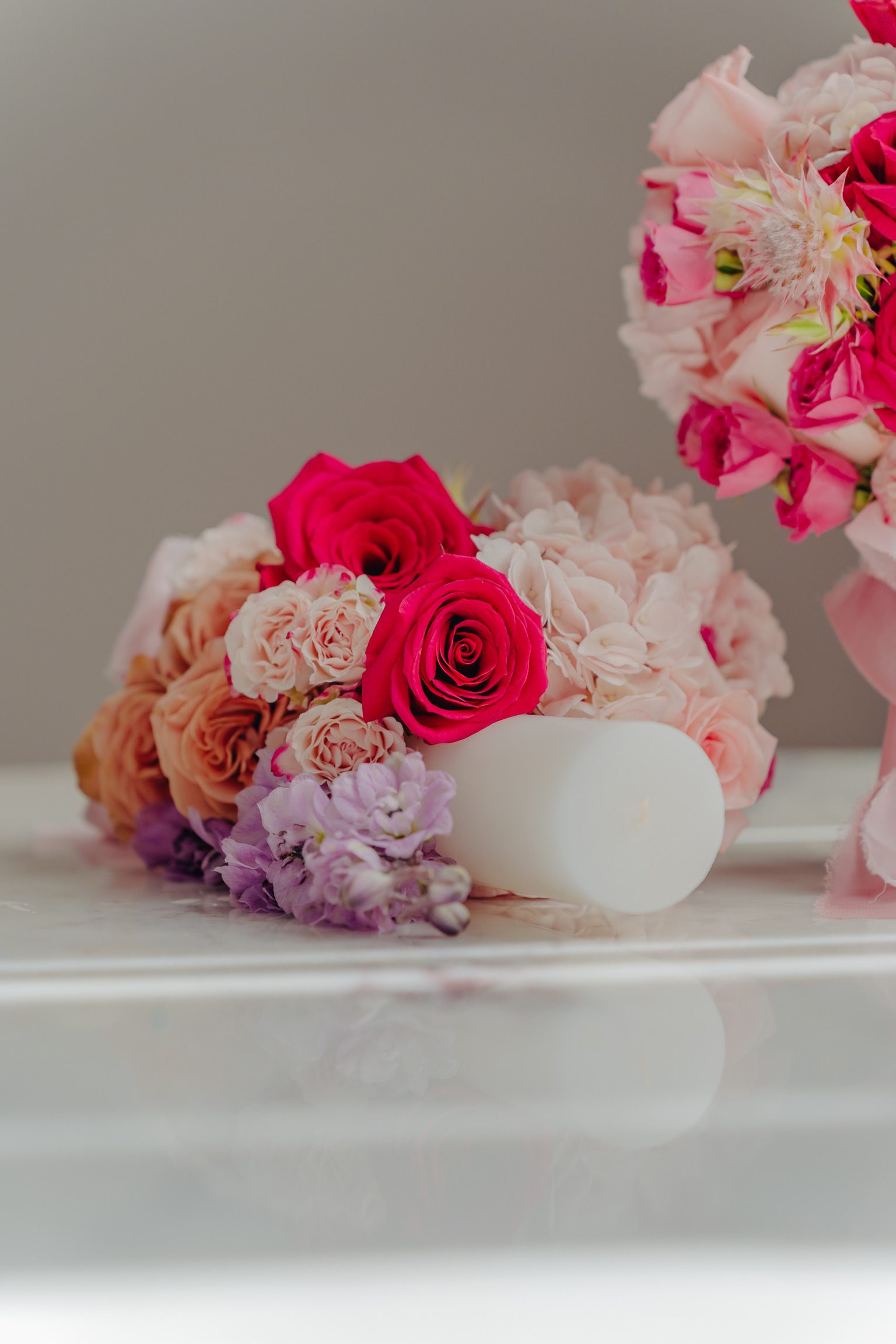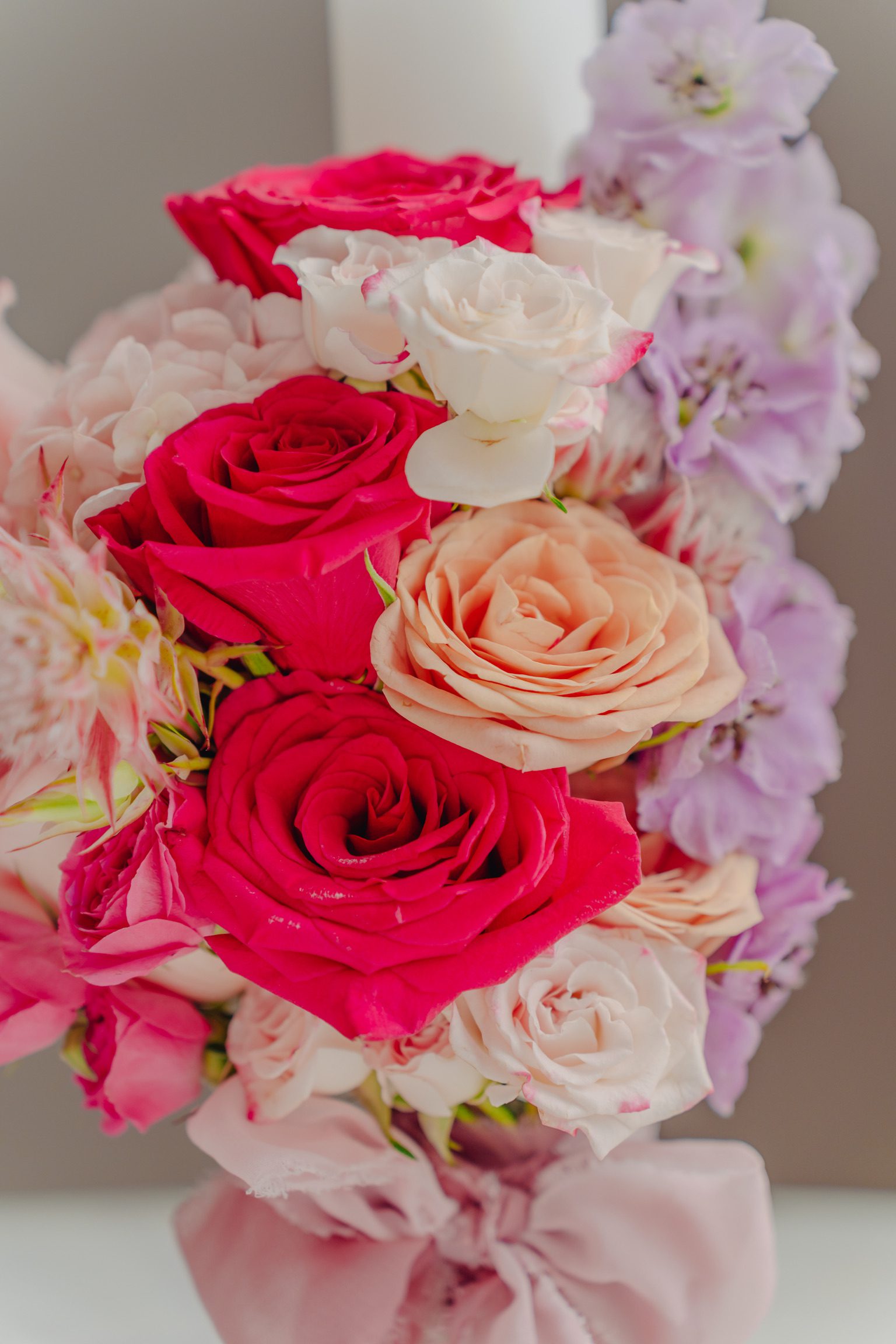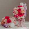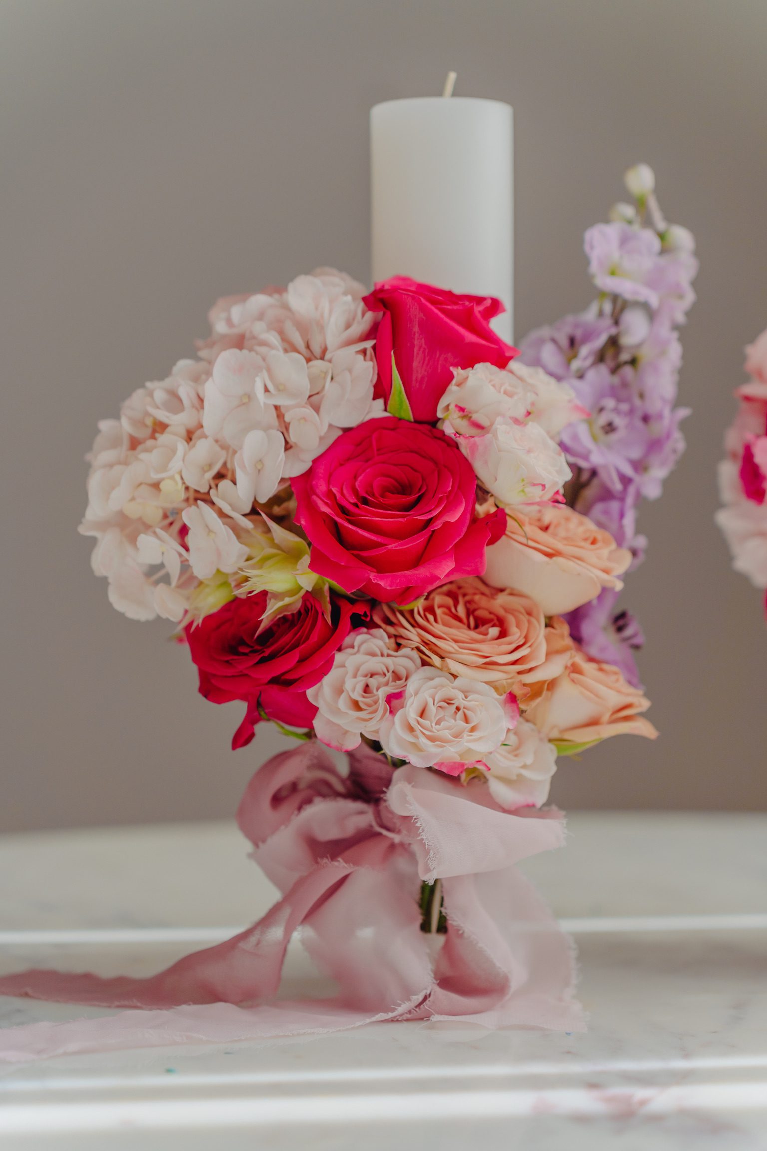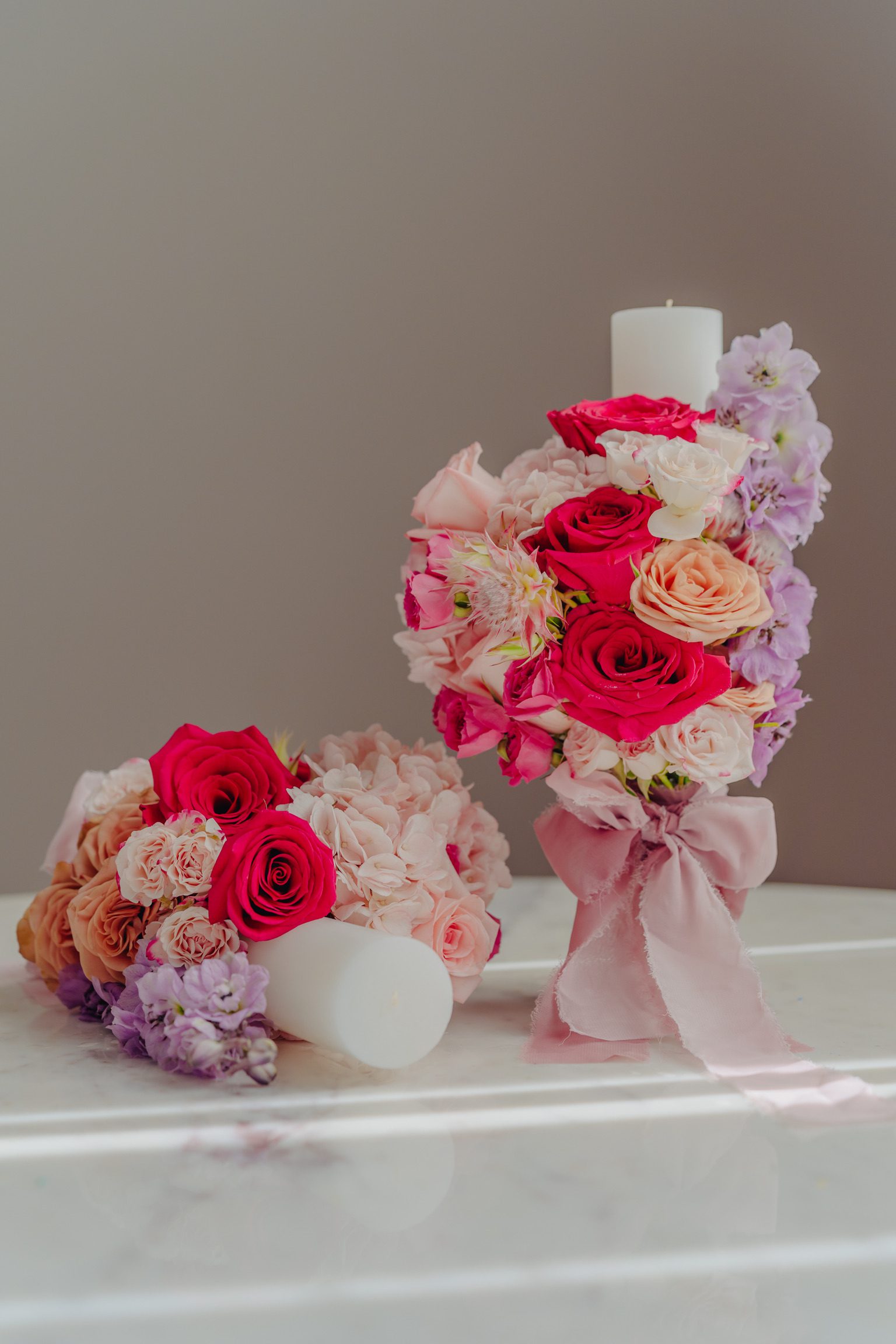 Setul alăturat este confecționat din parafină albă, având o înălțime de 40 cm. Compoziția florală: mix de trandafiri și delphinium, asortate într-un stil compact și feminin, așa cum am realizat și buchetul de mireasă.