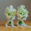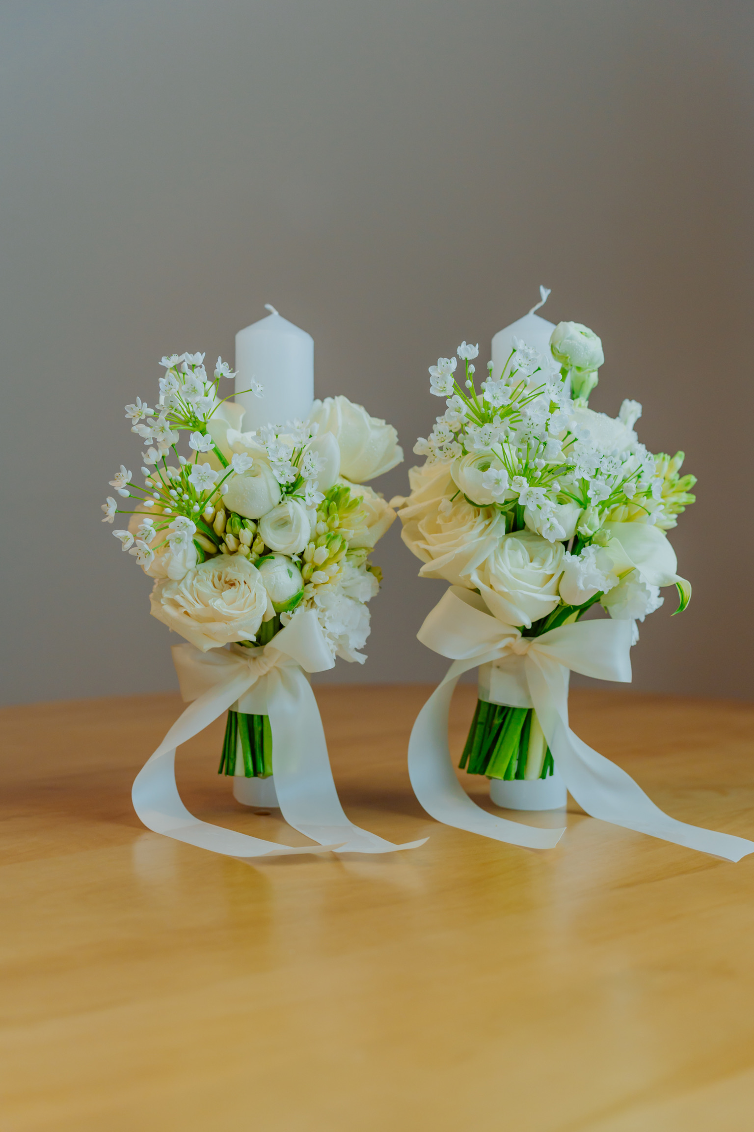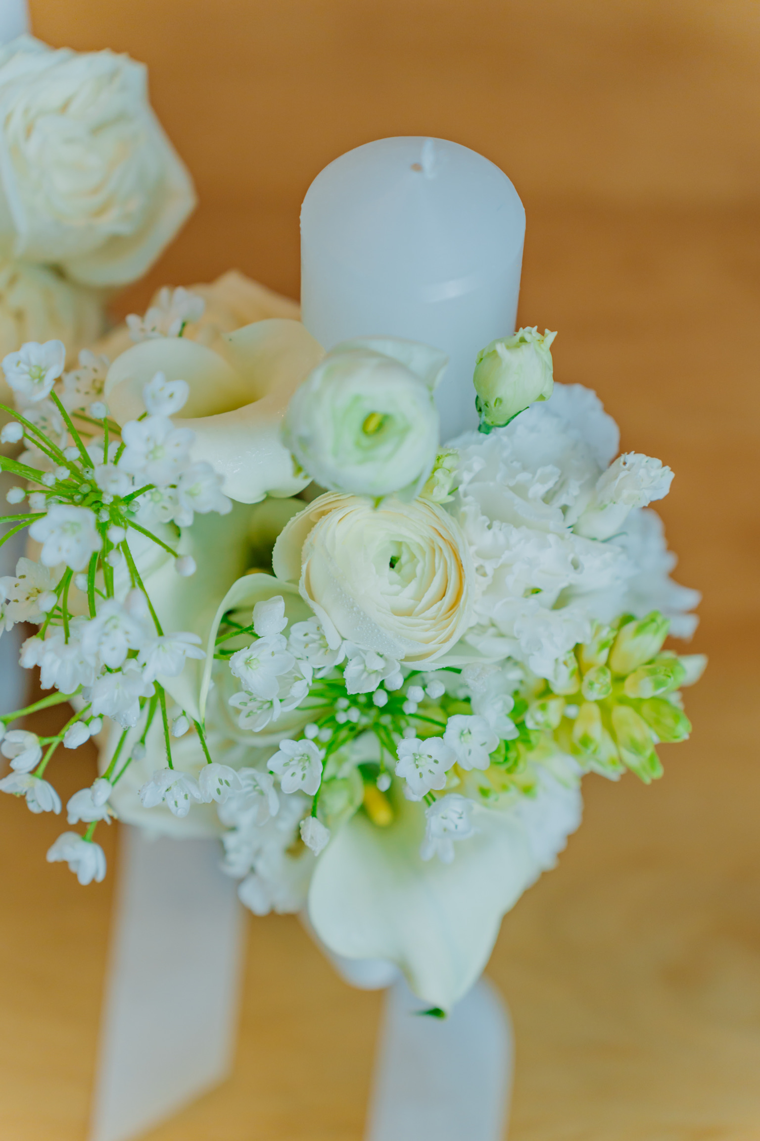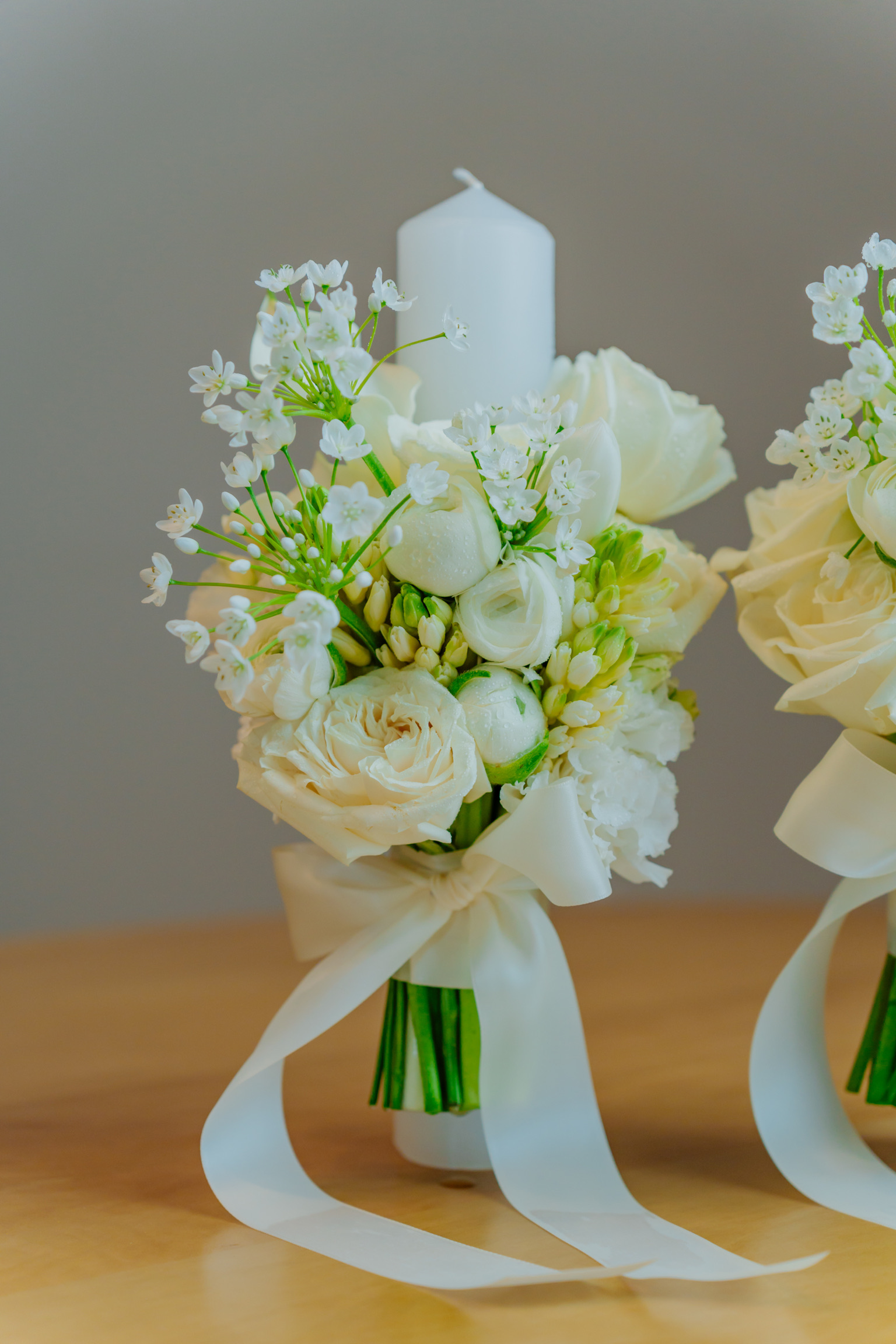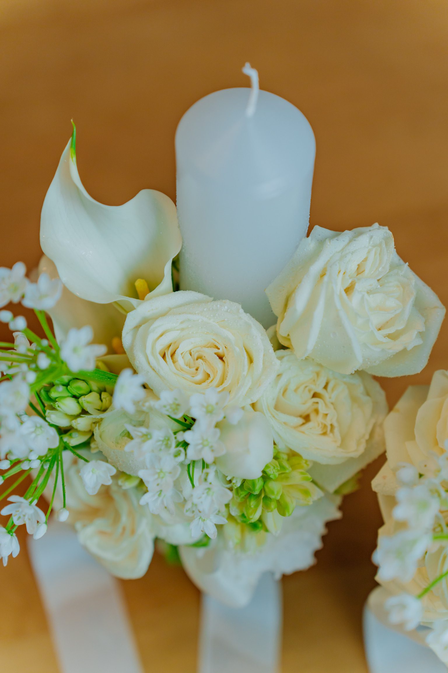 Setul de lumânări alăturat este potrivit pentru ceremonia religioasă, fiind decorat cu flori naturale, într-o cromatică luminoasă, inocentă: alb, ivory, crem. Lumânările au o înălțime de 40 cm, sunt confecționate din parafină de culoarea alb, cu aspect neted, iar la bază au fost accesorizate cu panglică din satin, asortată.