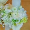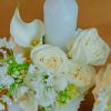 Compoziția florală: mix de flori albe și ivory: mathiola, mini rose, ranunculus, trandafiri, lalele, zambile. allium, cale etc.