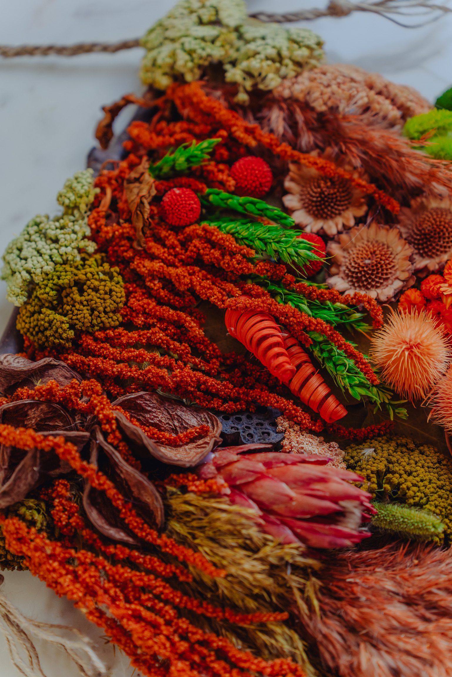 Componență: amaranthus conservat, frunze de pamier, proteea, pampas, lagurus etc.