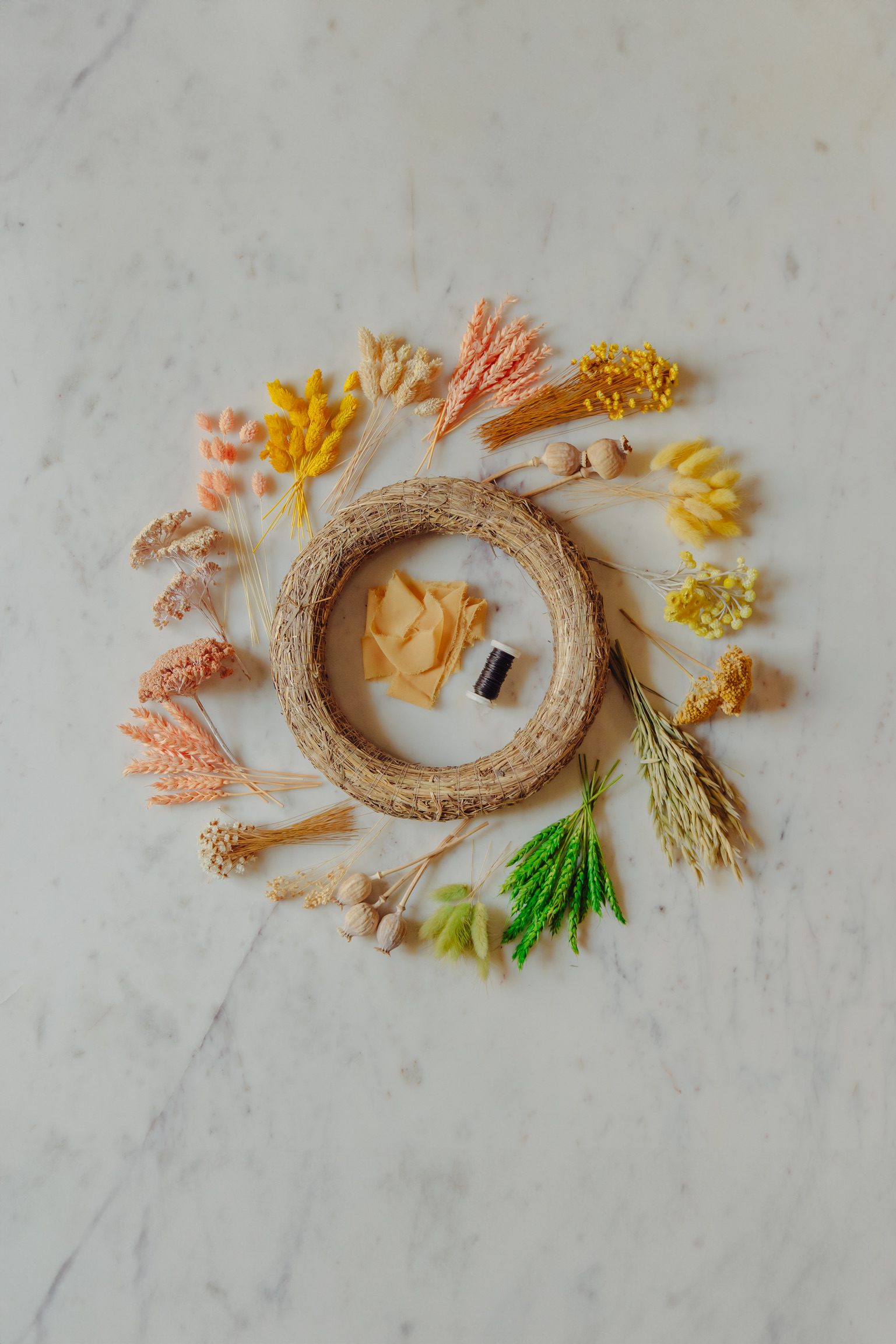Kit-ul conține o varietate de plante uscate, în nuanțe senine de galben pal, crem și verde: spice de grâu, lagurus, tallaris, mac, glixia, achillea etc.; o coroniță confecționată din paie, sârmă și panglică decorativă.