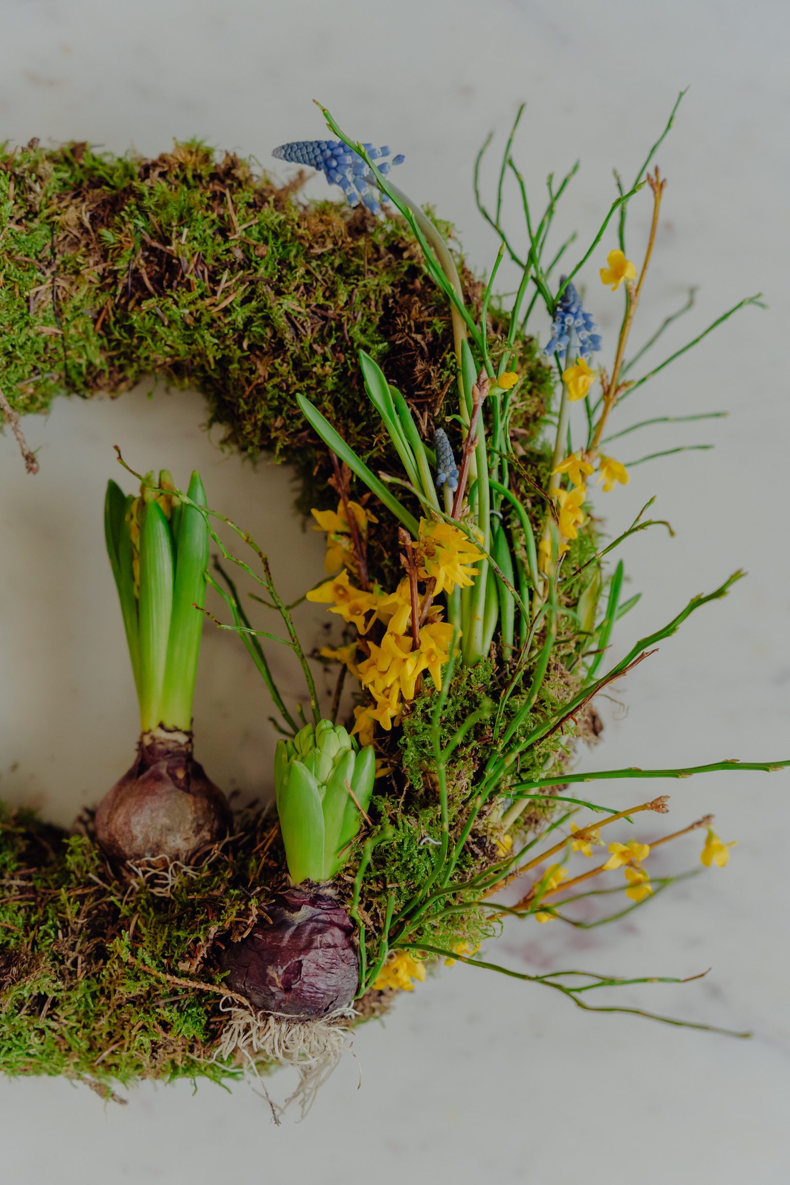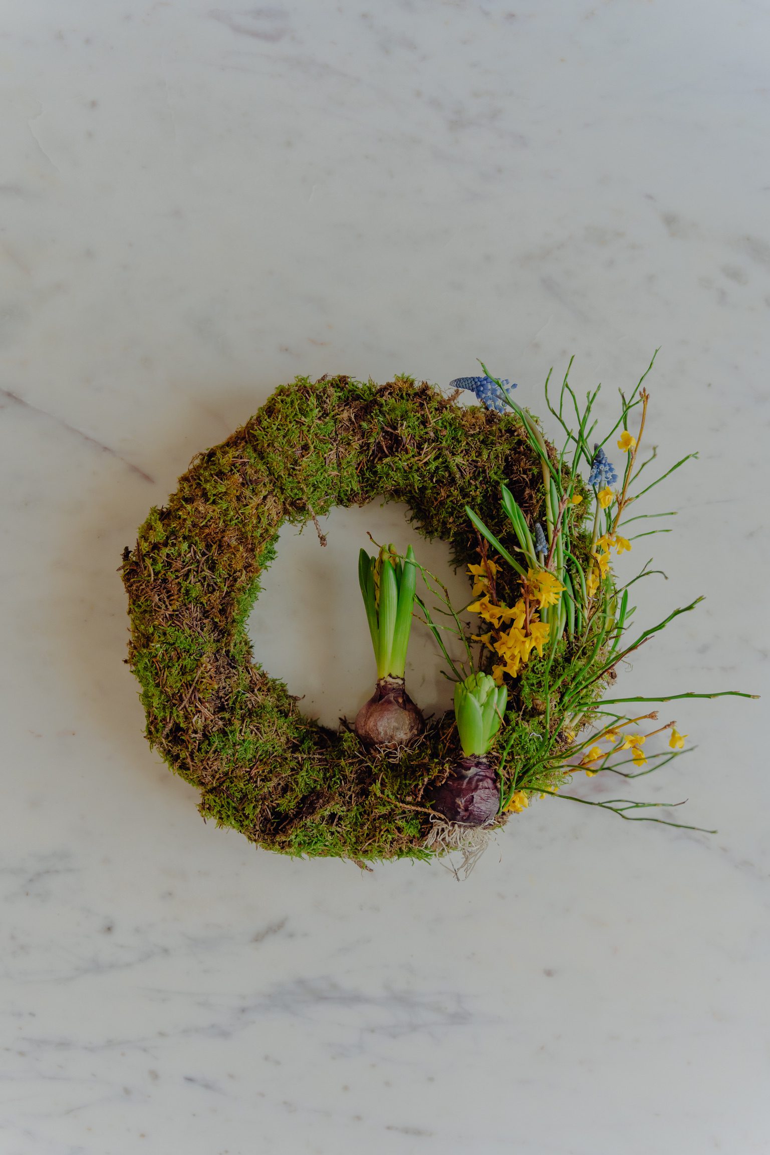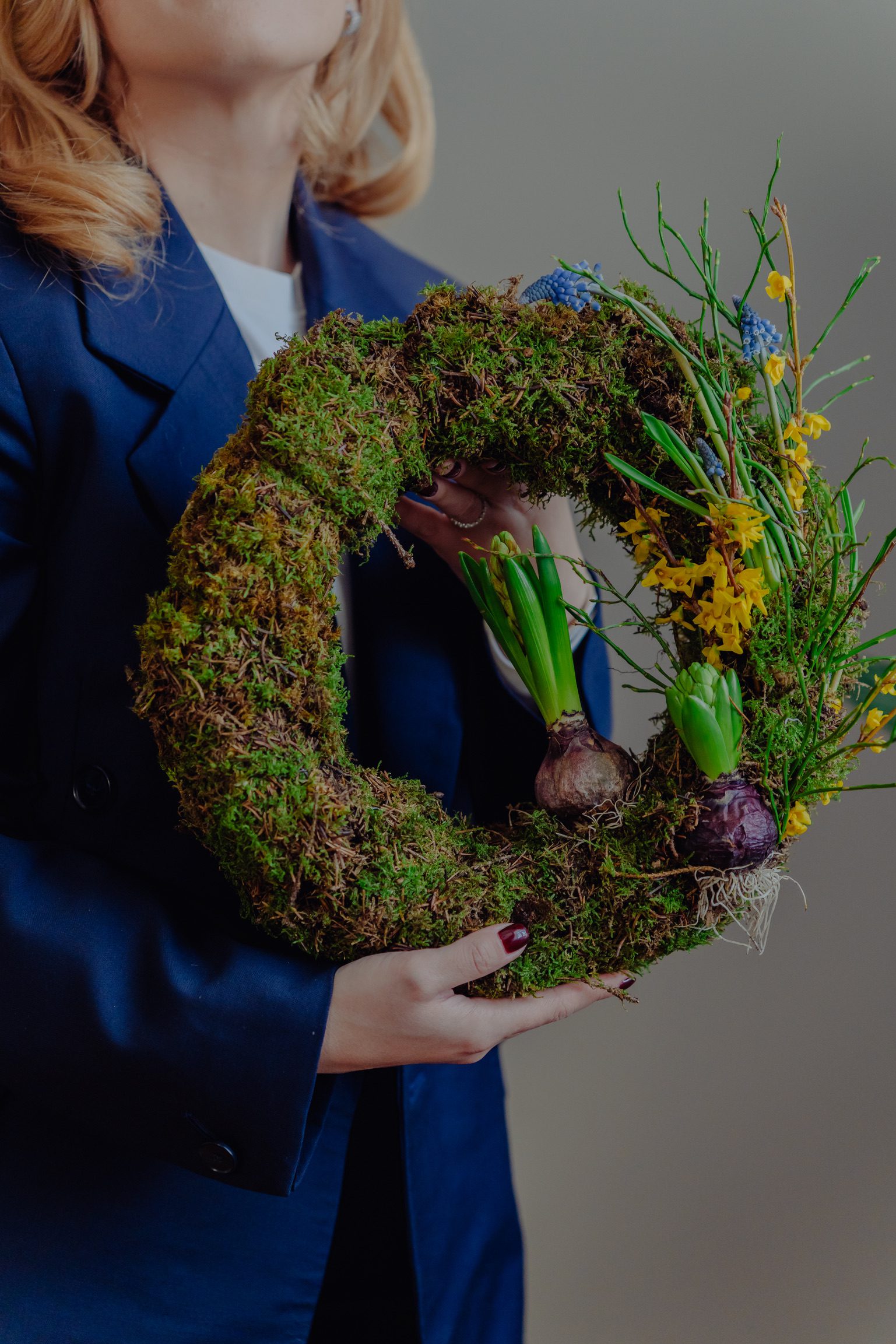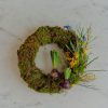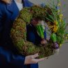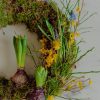 Coroniță de primăvară, decorată cu mușchi verde natural, bulbi de zambile, narcise, muscari și vaccinium. Reprezintă un cadou ideal, cu ocazia zilelor de 1 și 8 Martie, fiind un simbol desăvârșit al naturii.