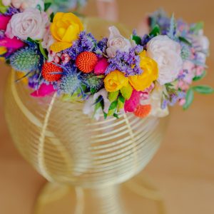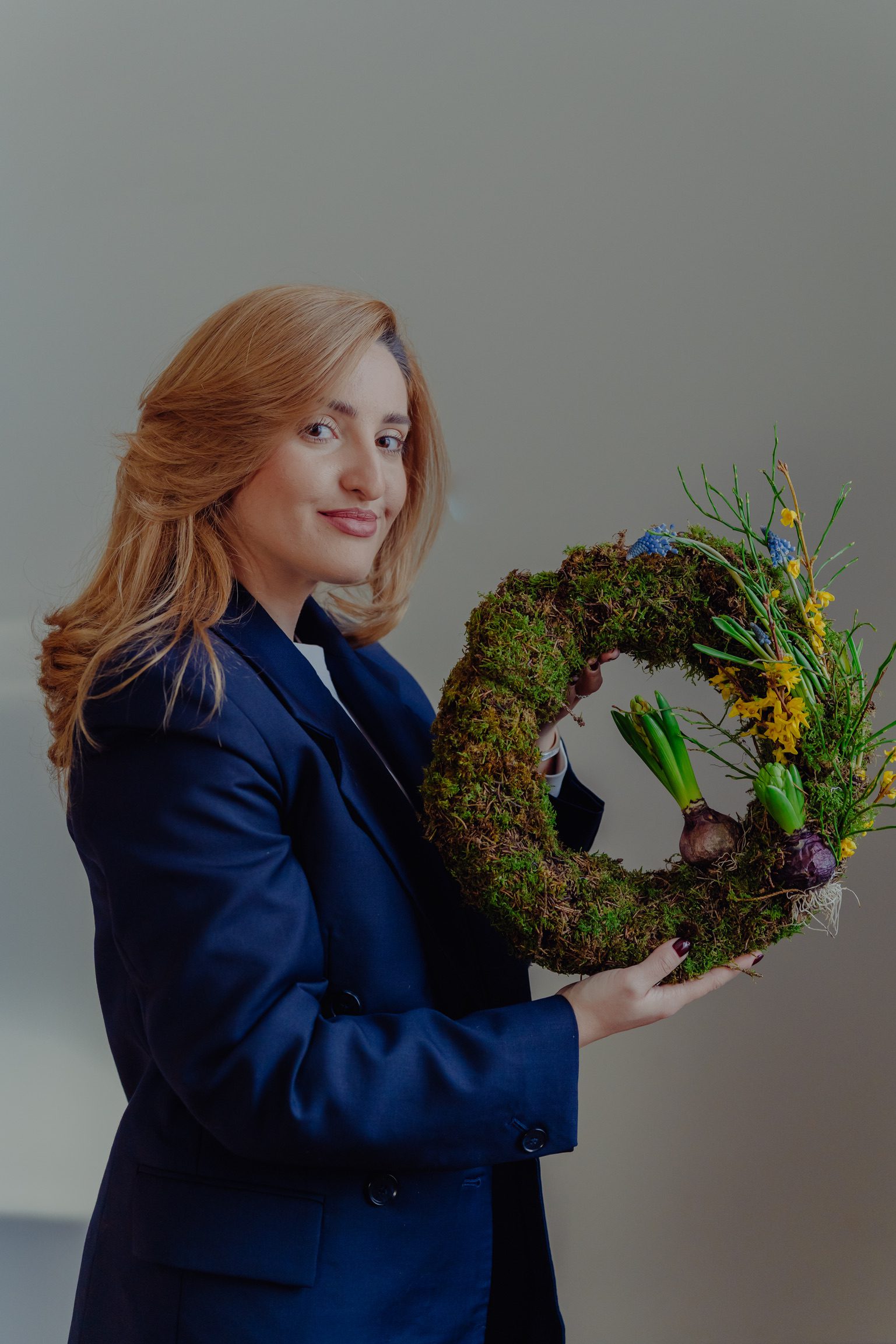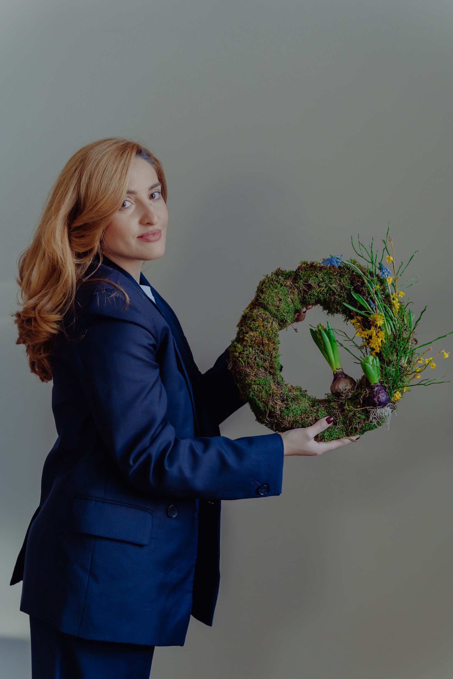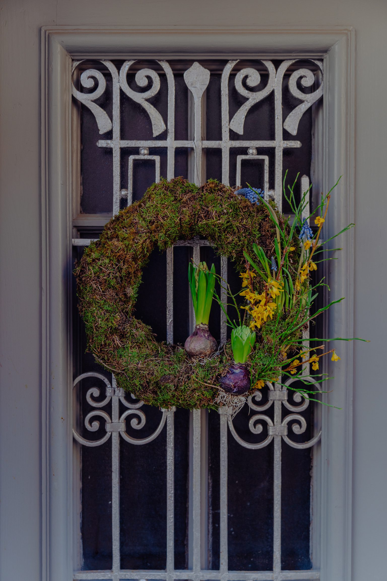 Coroniță de primăvară, decorată cu mușchi verde natural, bulbi de zambile, narcise, muscari și vaccinium. Reprezintă un cadou ideal, cu ocazia zilelor de 1 și 8 Martie, fiind un simbol desăvârșit al naturii.