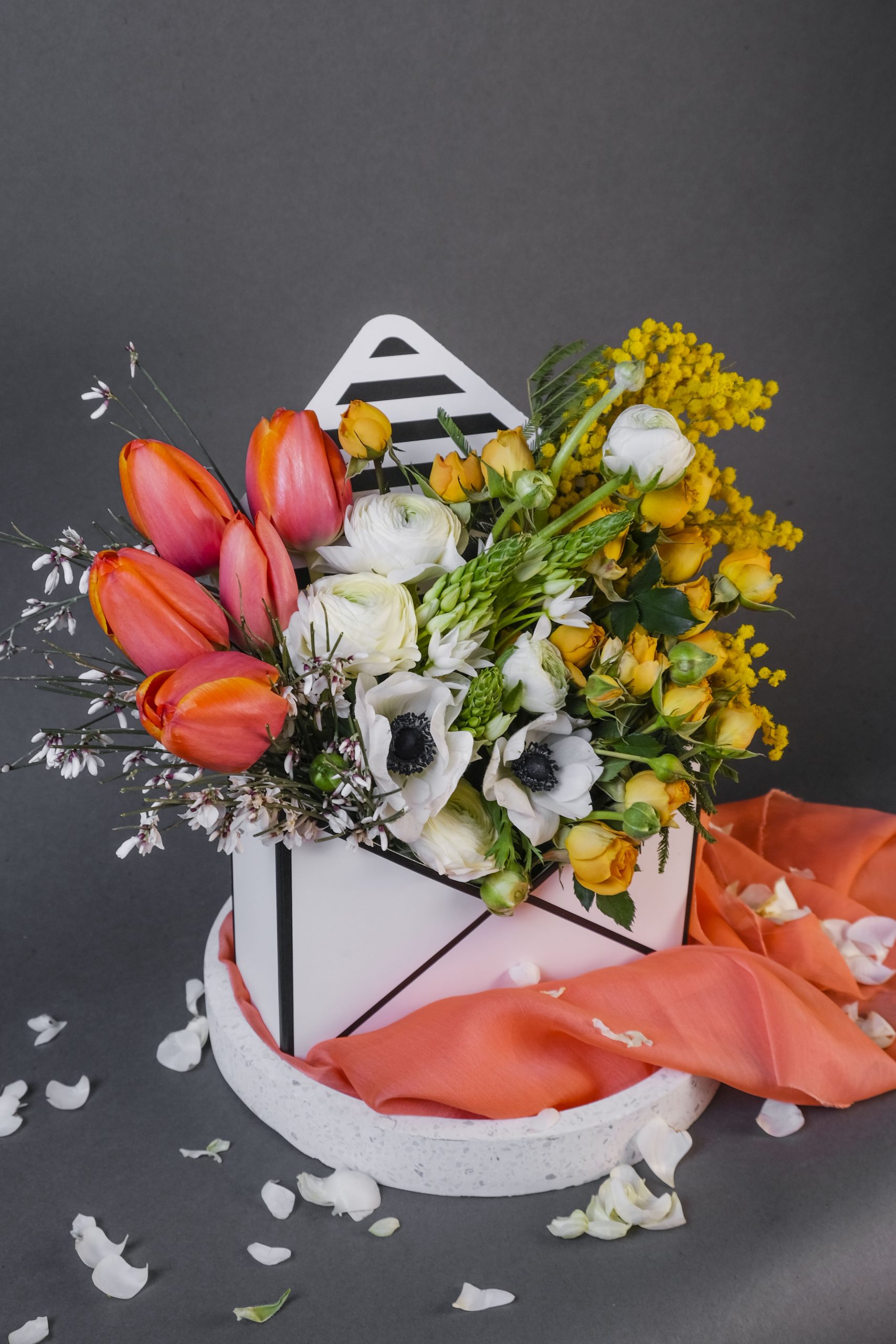 Aranjament floral de primăvară dispus în plic cu design minimalist, pentru momente de neuitat. Pentru modelul din imagini s-au folosit flori colorate, delicat parfumate, precum: lalele, ranunculus, anemone, genista, mimosa, trandafiri și ornitogalum. Plicul floral este potrivit pentru a fi oferit persoanelor dragi din viața ta, cu ocazii speciale, precum ziua de 8 Martie sau pur și simplu pentru a le aduce zâmbetul pe buze.